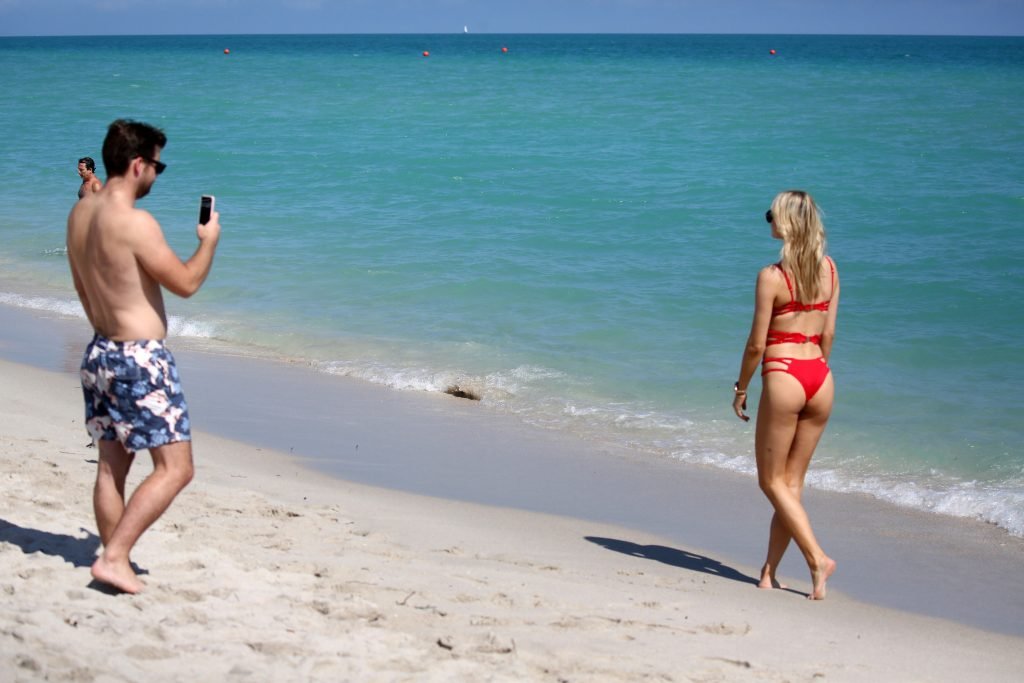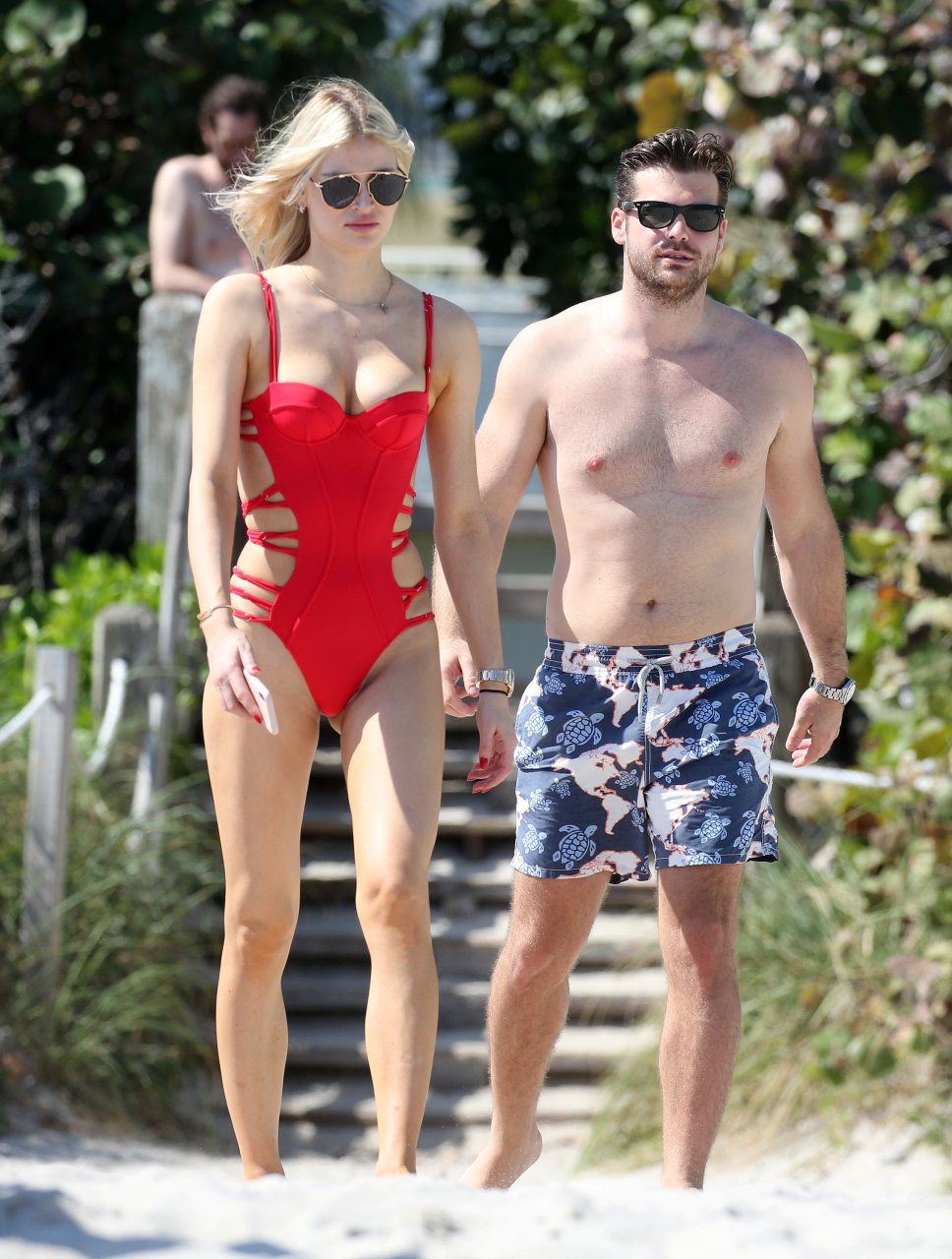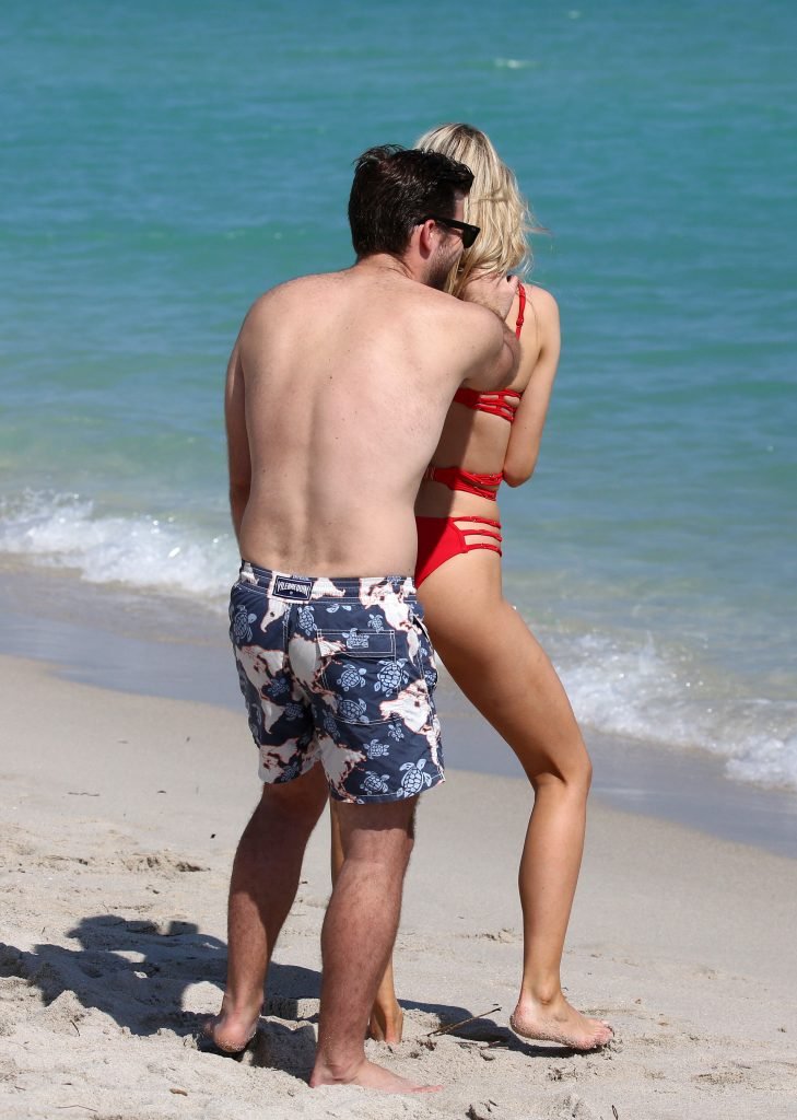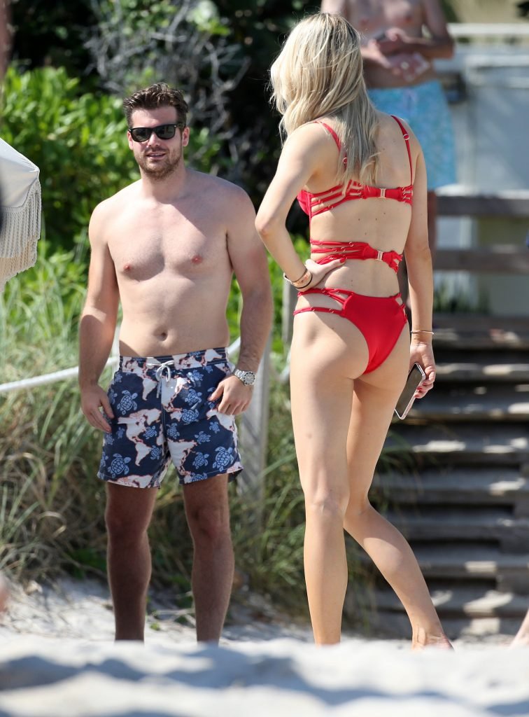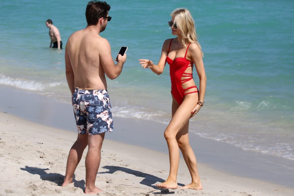 La modelo Sofija Milosevic, de 25 años, lleva un bikini rojo mientras pasa el Día de San Valentín con el futbolista Adem Ljajic en la playa de Miami, 14/02/2018.