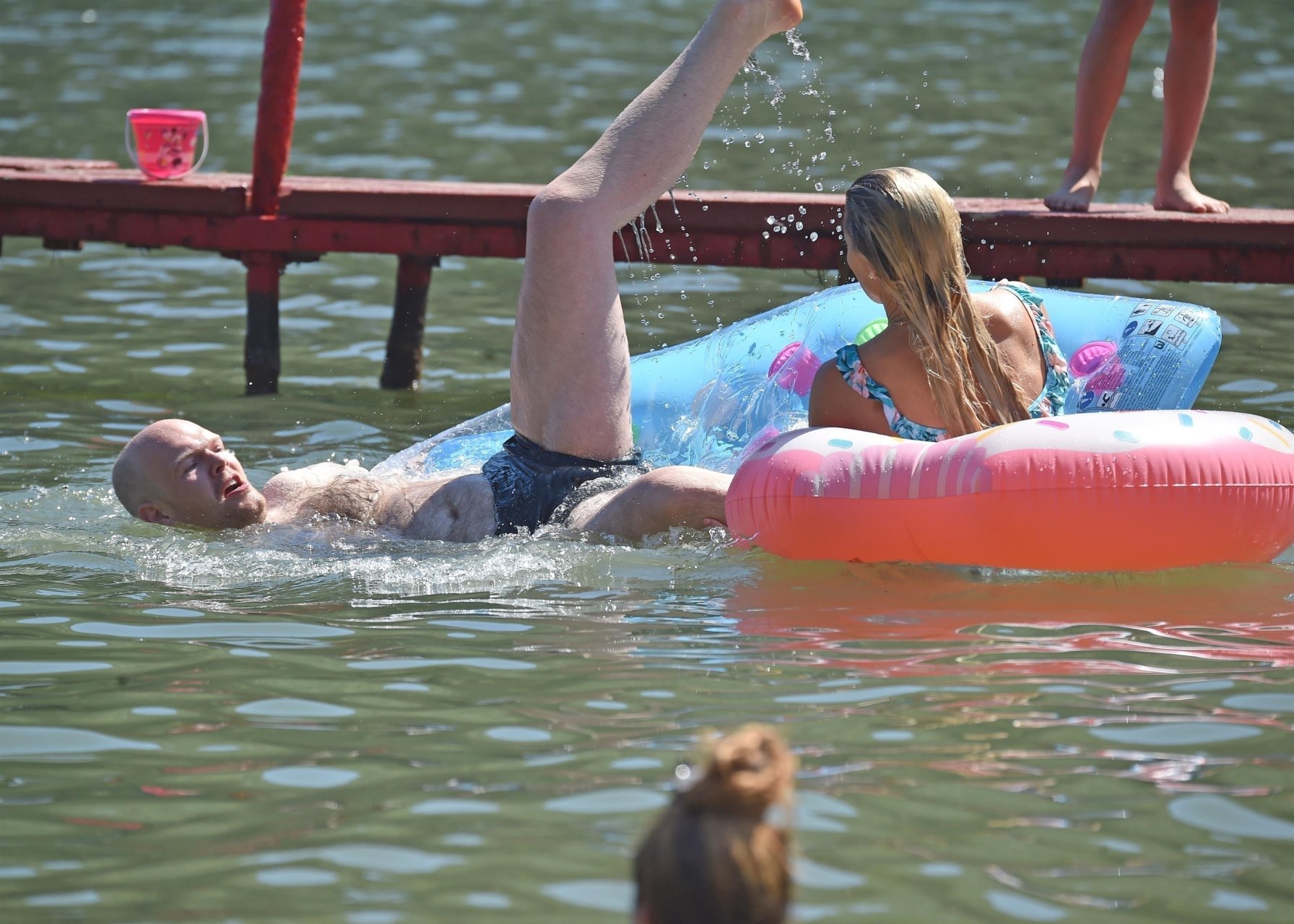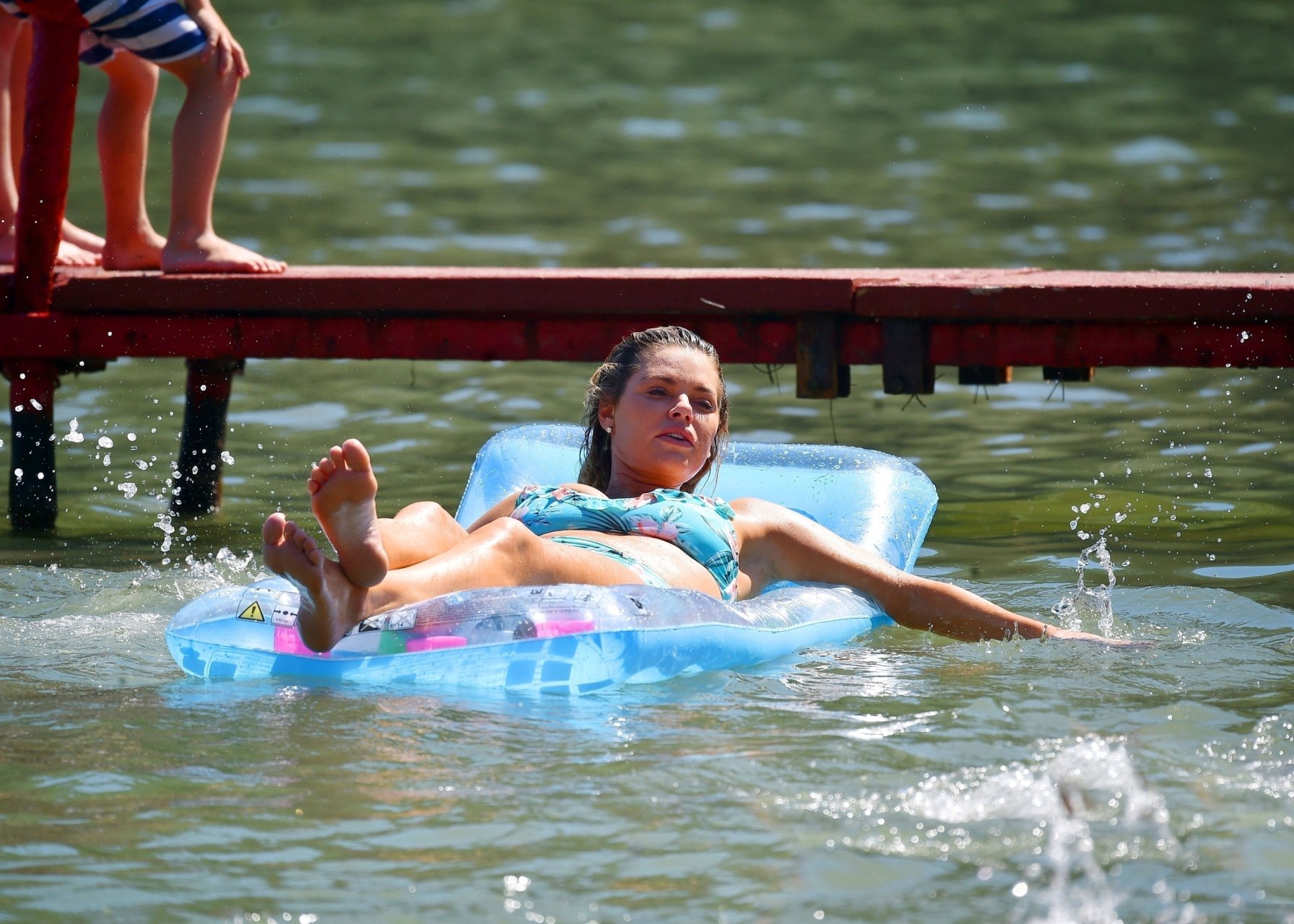 Sophie Monk fue fotografiada luciendo genial con un bikini azul de cintura alta mientras filmaba un programa de televisión con Oscar Gordon en la playa de Portofino, 14/07/2018.