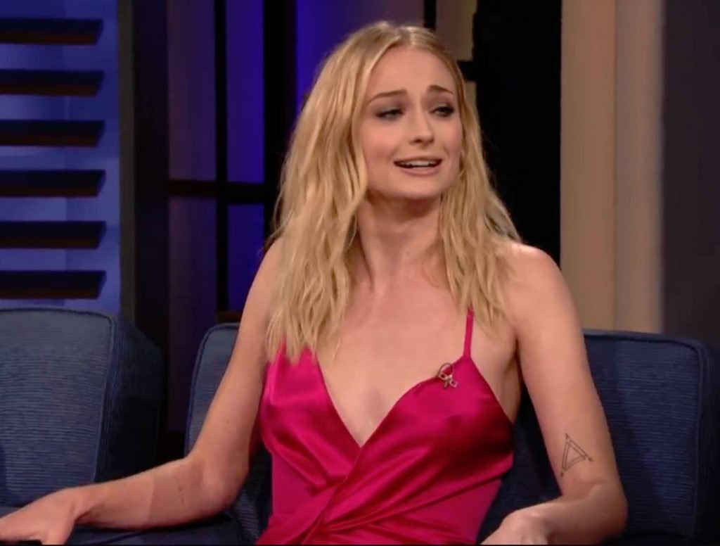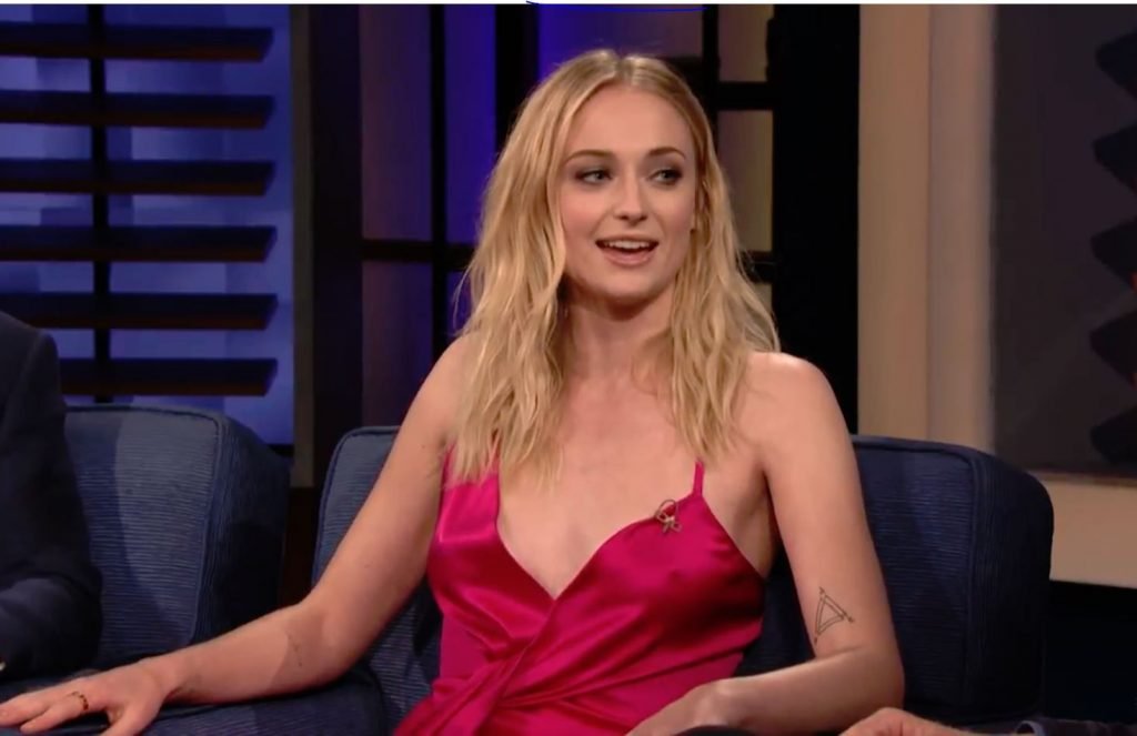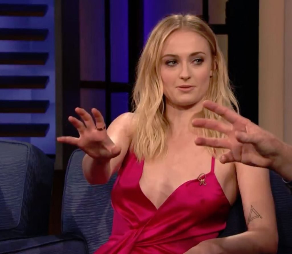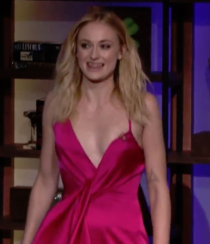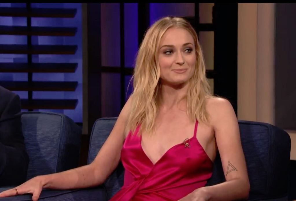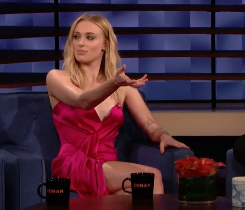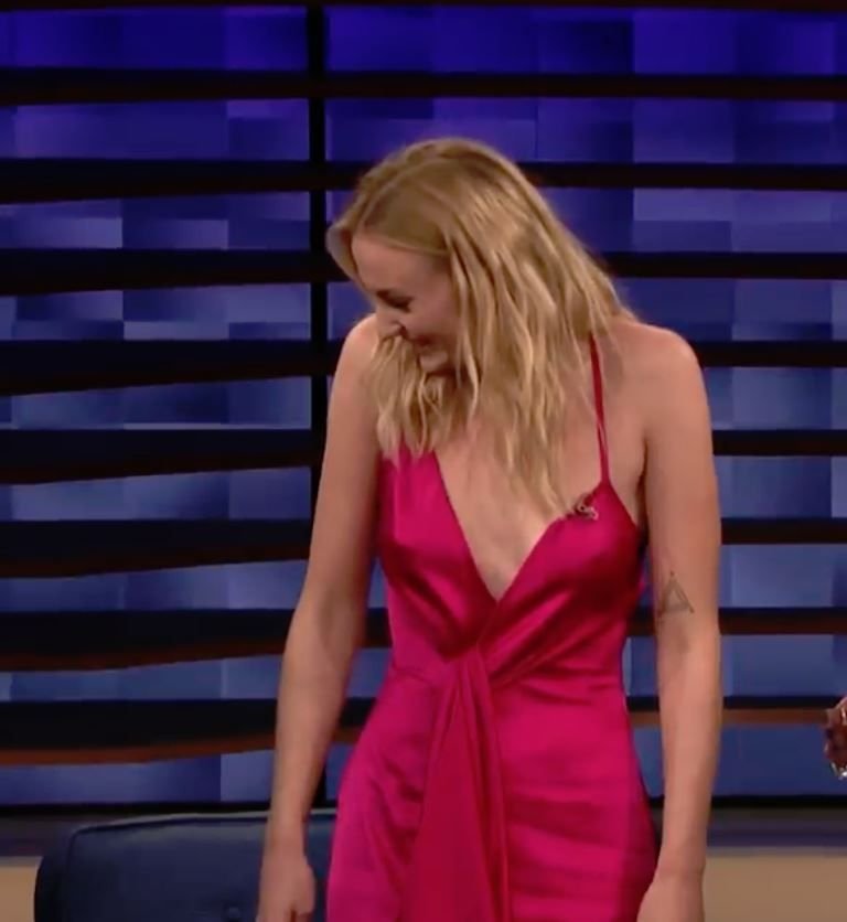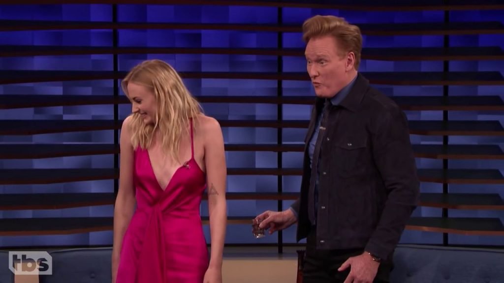 Actriz Sophie Turner mostró sus pezones duros, vistiendo un vestido rojo en el programa de Conan, 05/06/2019. Ella le contó a Conan O’Brien sobre un vaso de Starbucks en el episodio 4 de la temporada 8 de “Game of Thrones“.