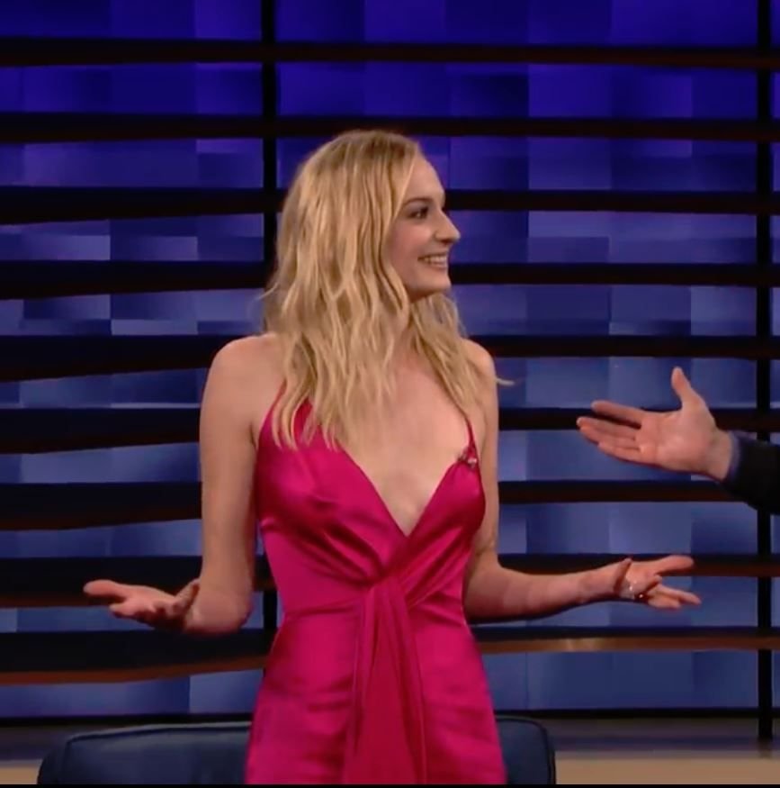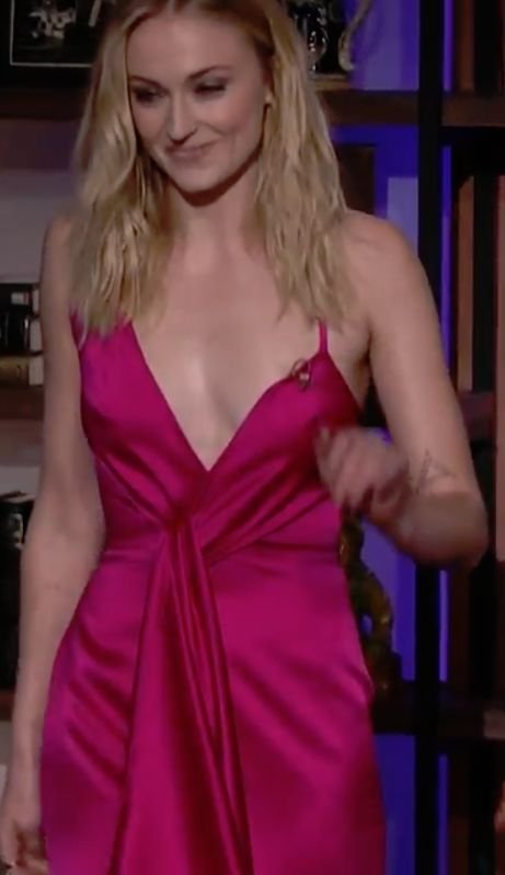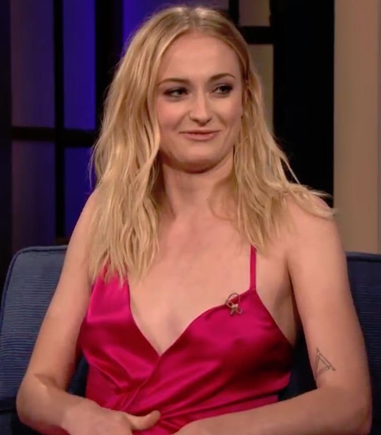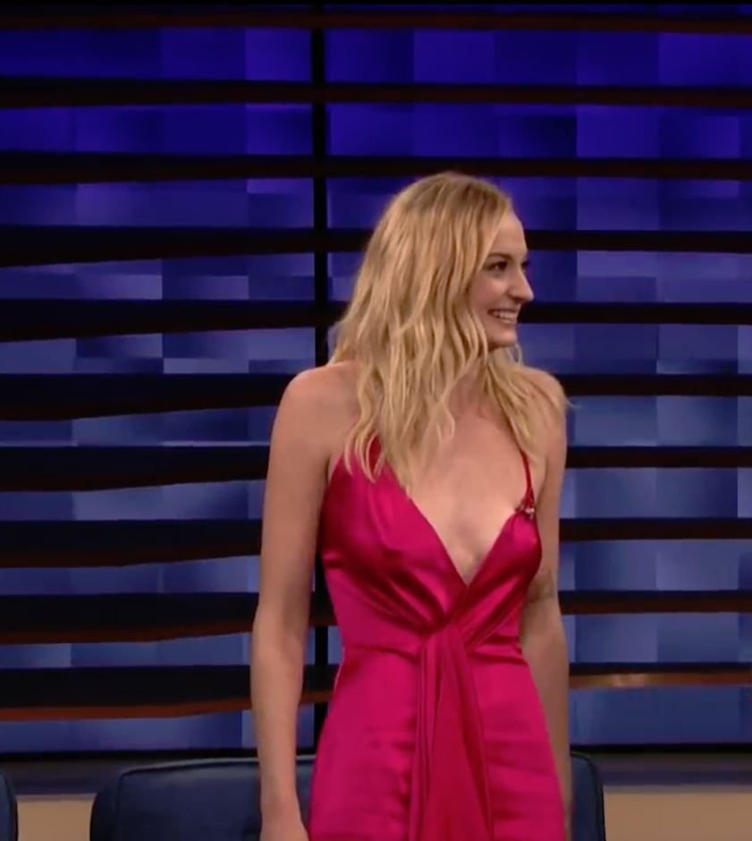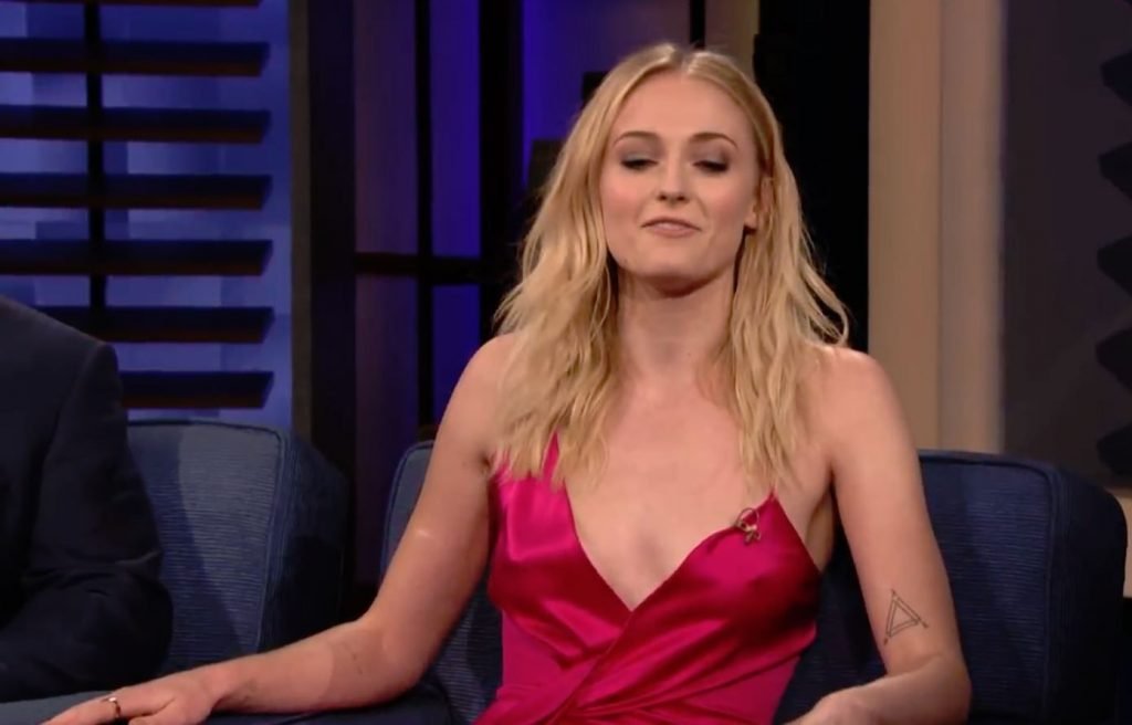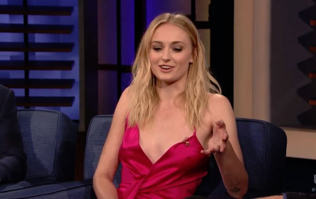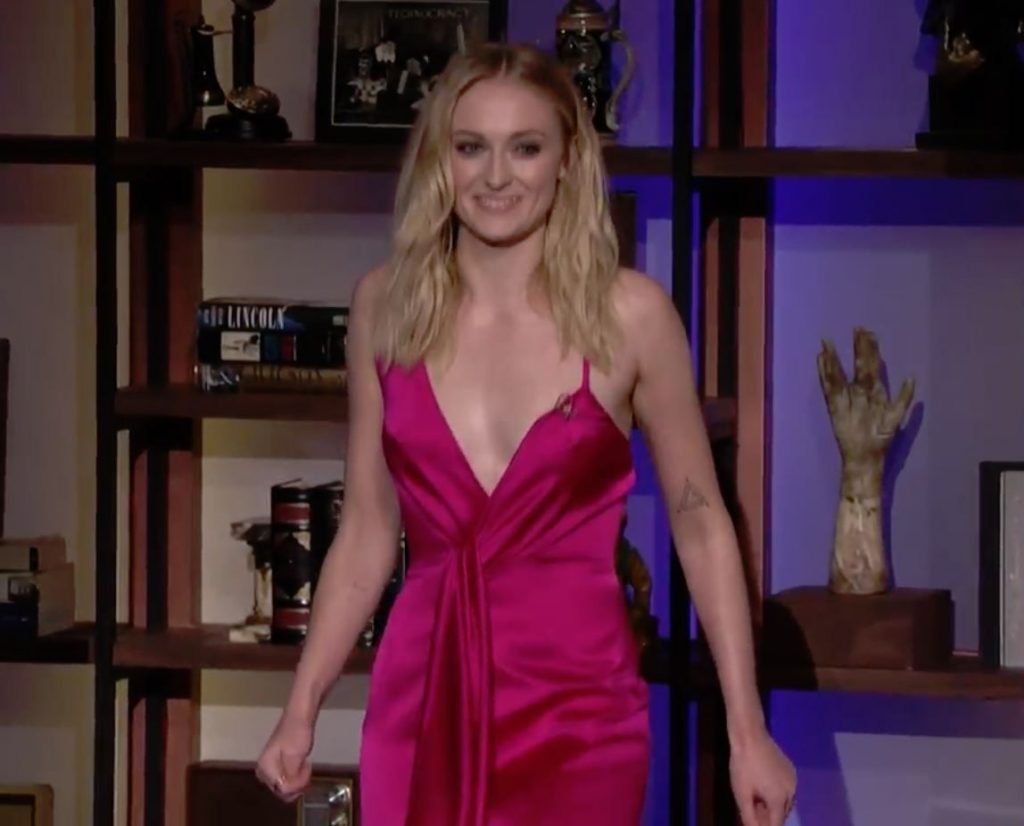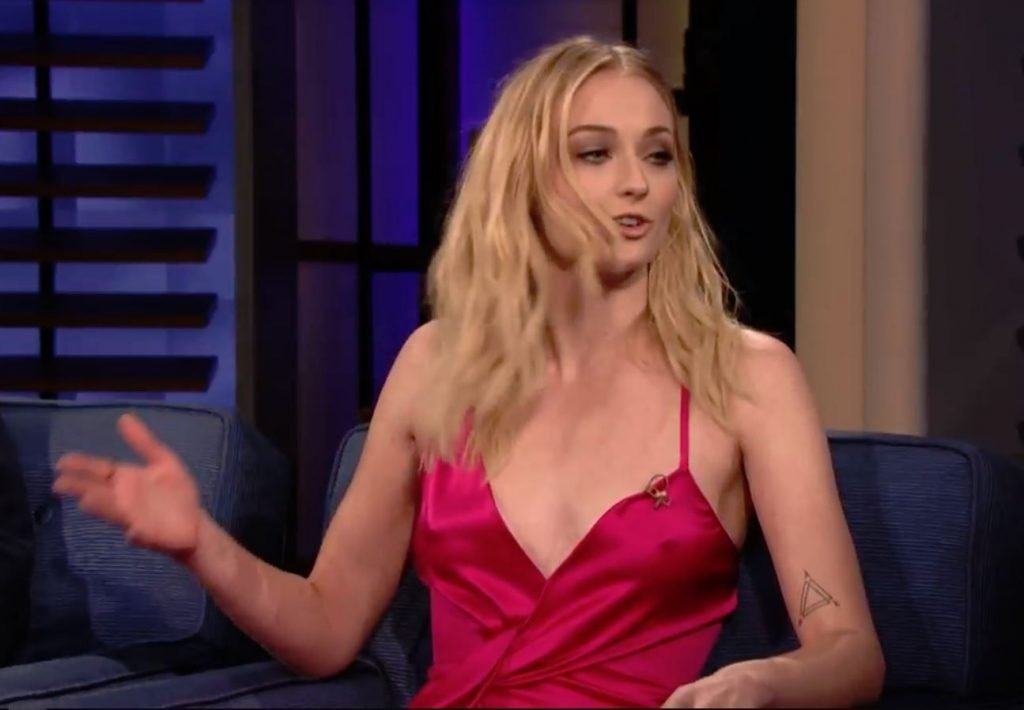 Actriz Sophie Turner mostró sus pezones duros, vistiendo un vestido rojo en el programa de Conan, 05/06/2019. Ella le contó a Conan O’Brien sobre un vaso de Starbucks en el episodio 4 de la temporada 8 de “Game of Thrones“.