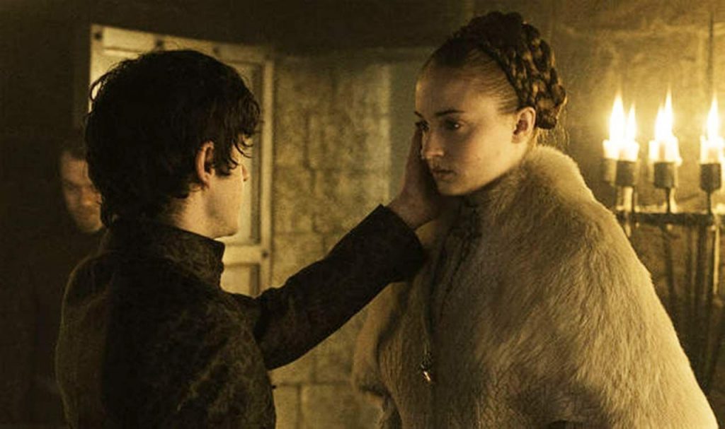 Sophie Turner is making out with a guy in bed. He is taking off her shirt to reveal a bra and sexy panties.