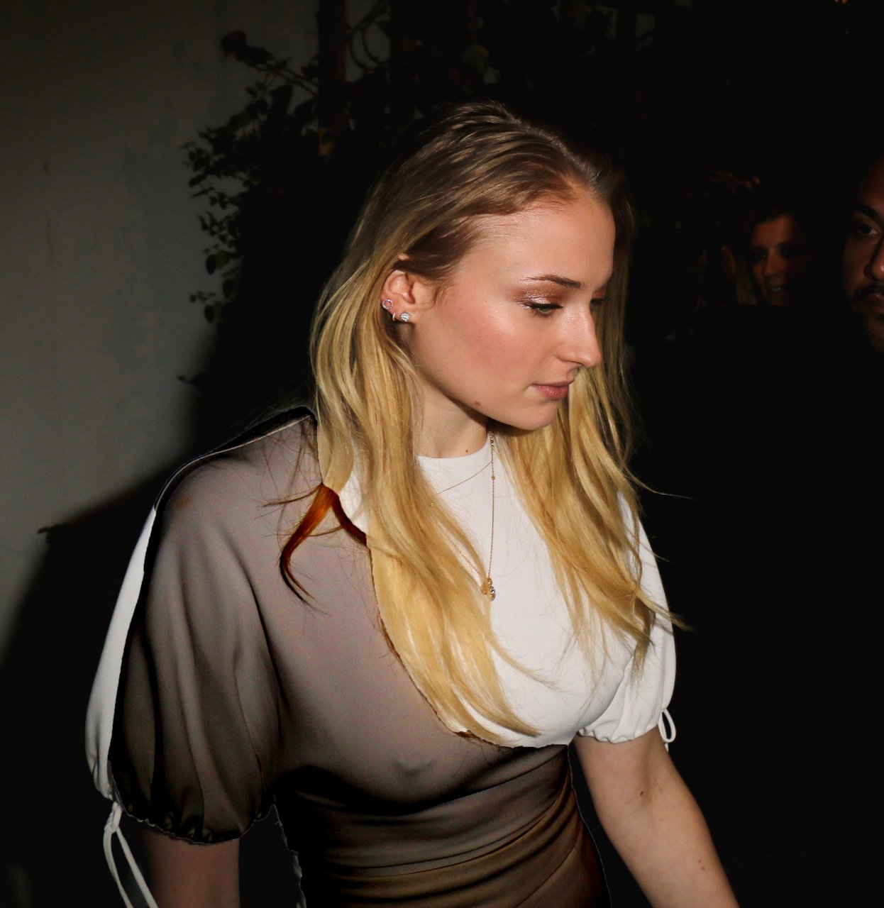 Sophie Turner sin sostén llega a la celebración de Flaunt y Guess del número Alternative Facts en Los Ángeles, 11/04/2017. ¡Pezón perforado! Sophie Turner es una actriz inglesa (X-Men: Apocalipsis – 2016). Edad – 21 años (nacida el 21 de febrero de 1996).