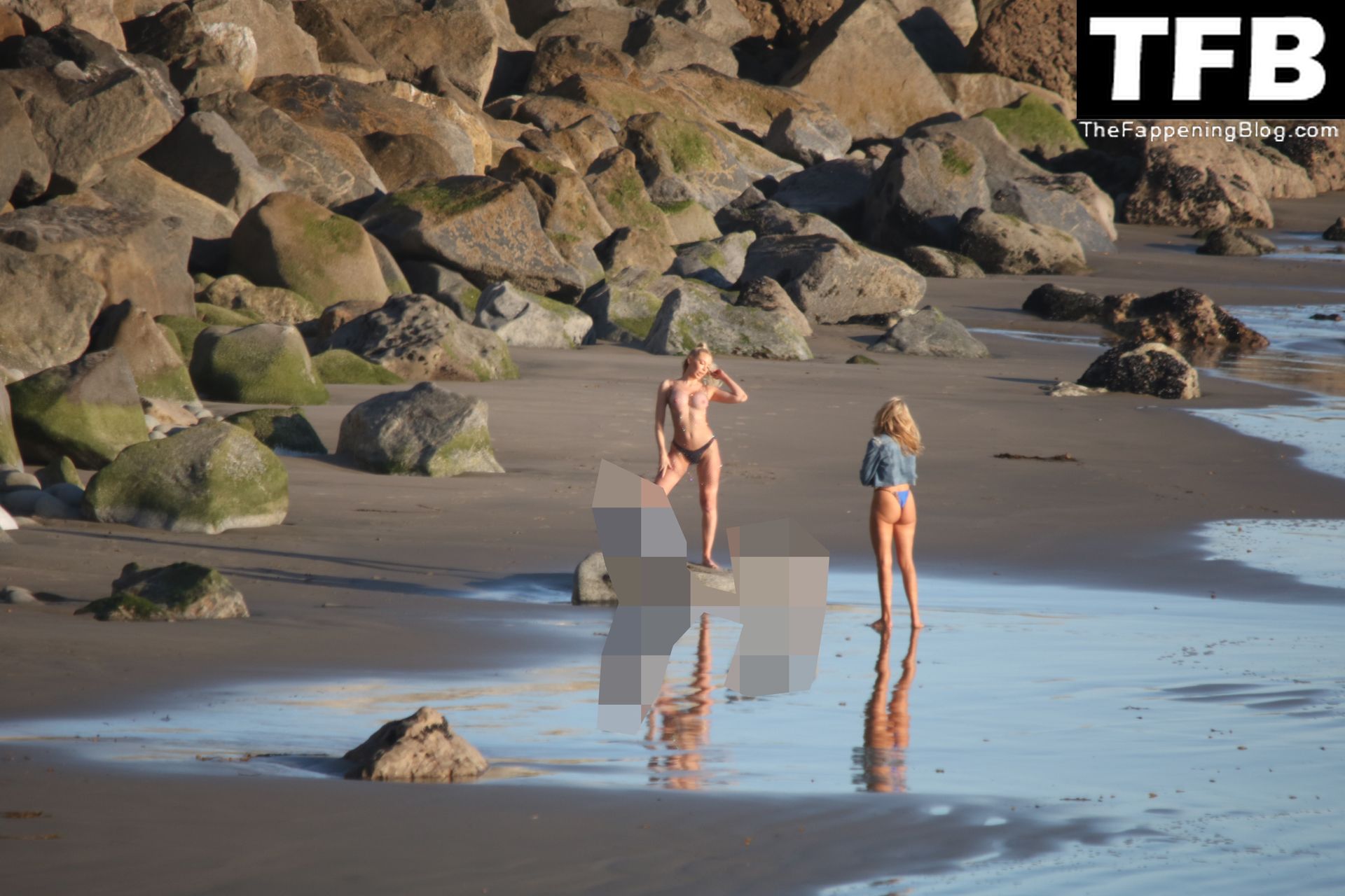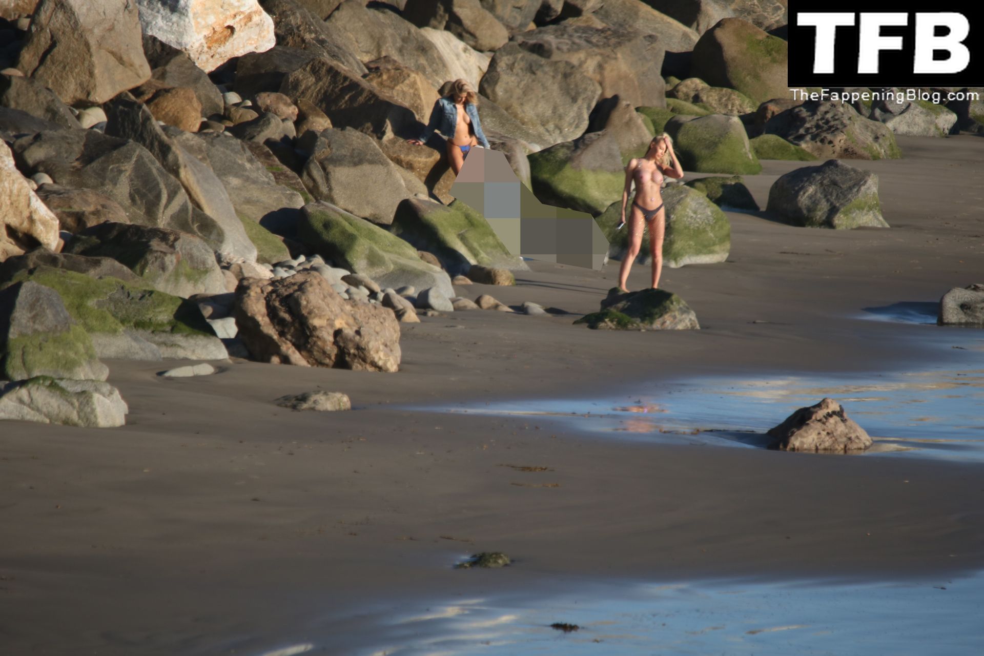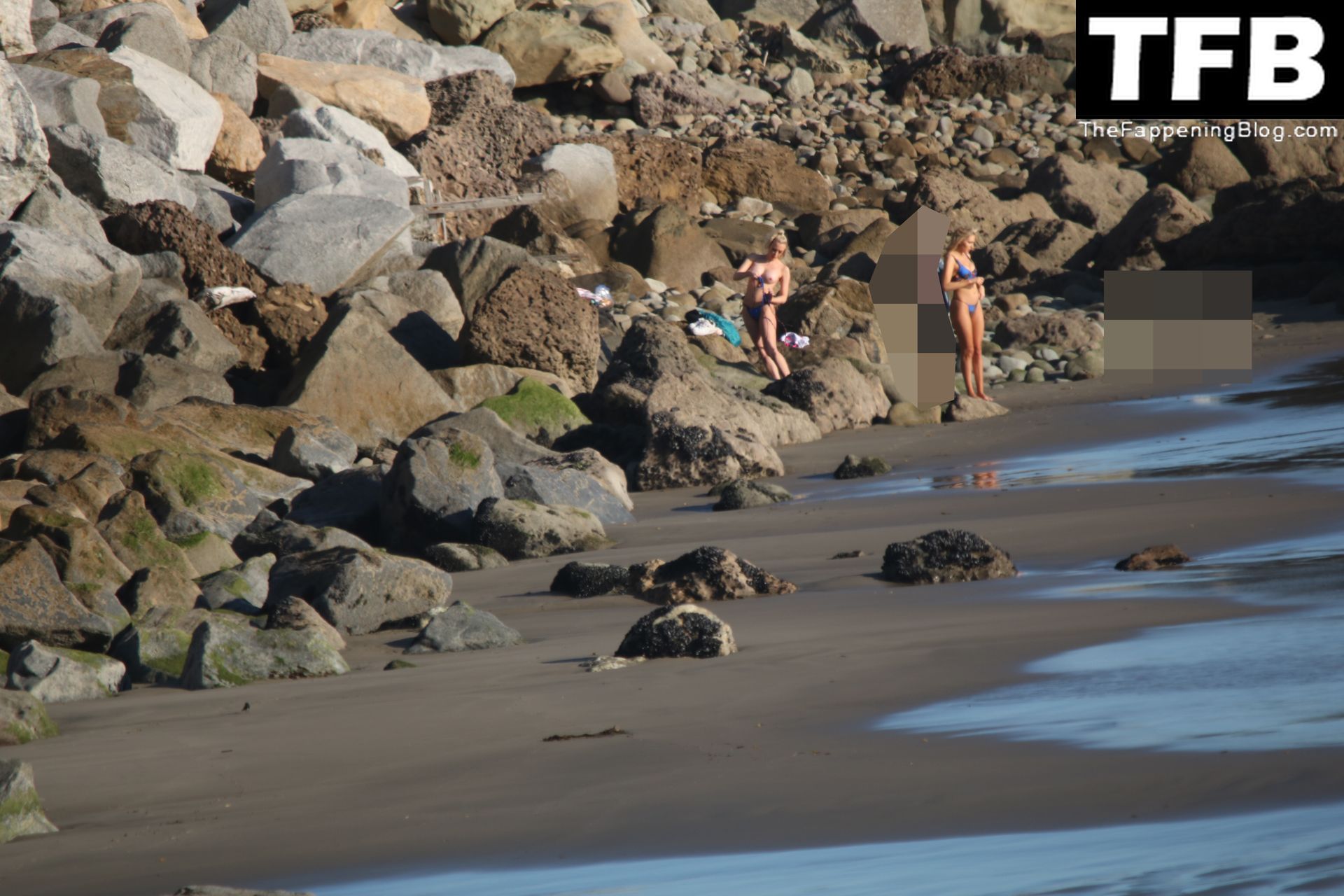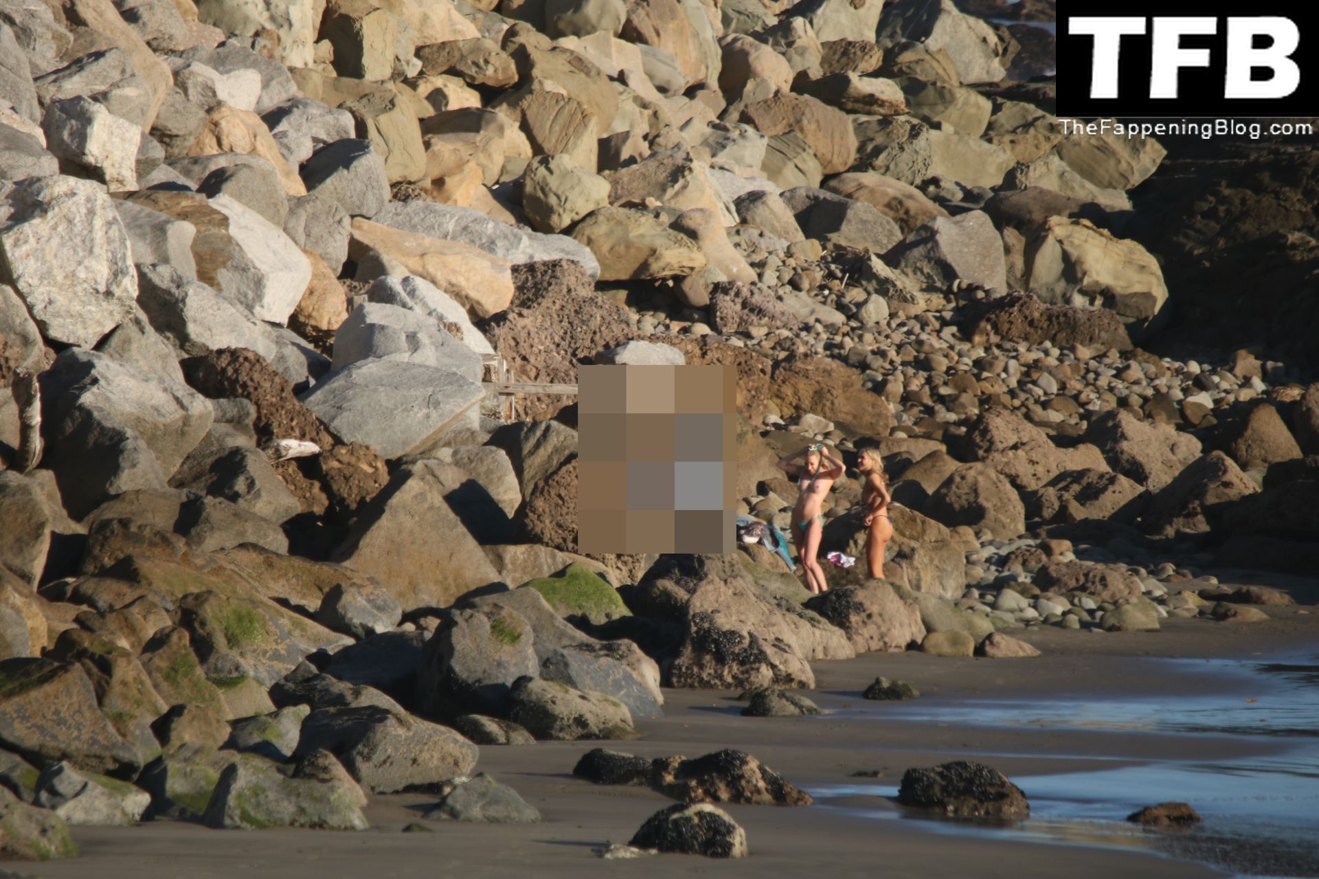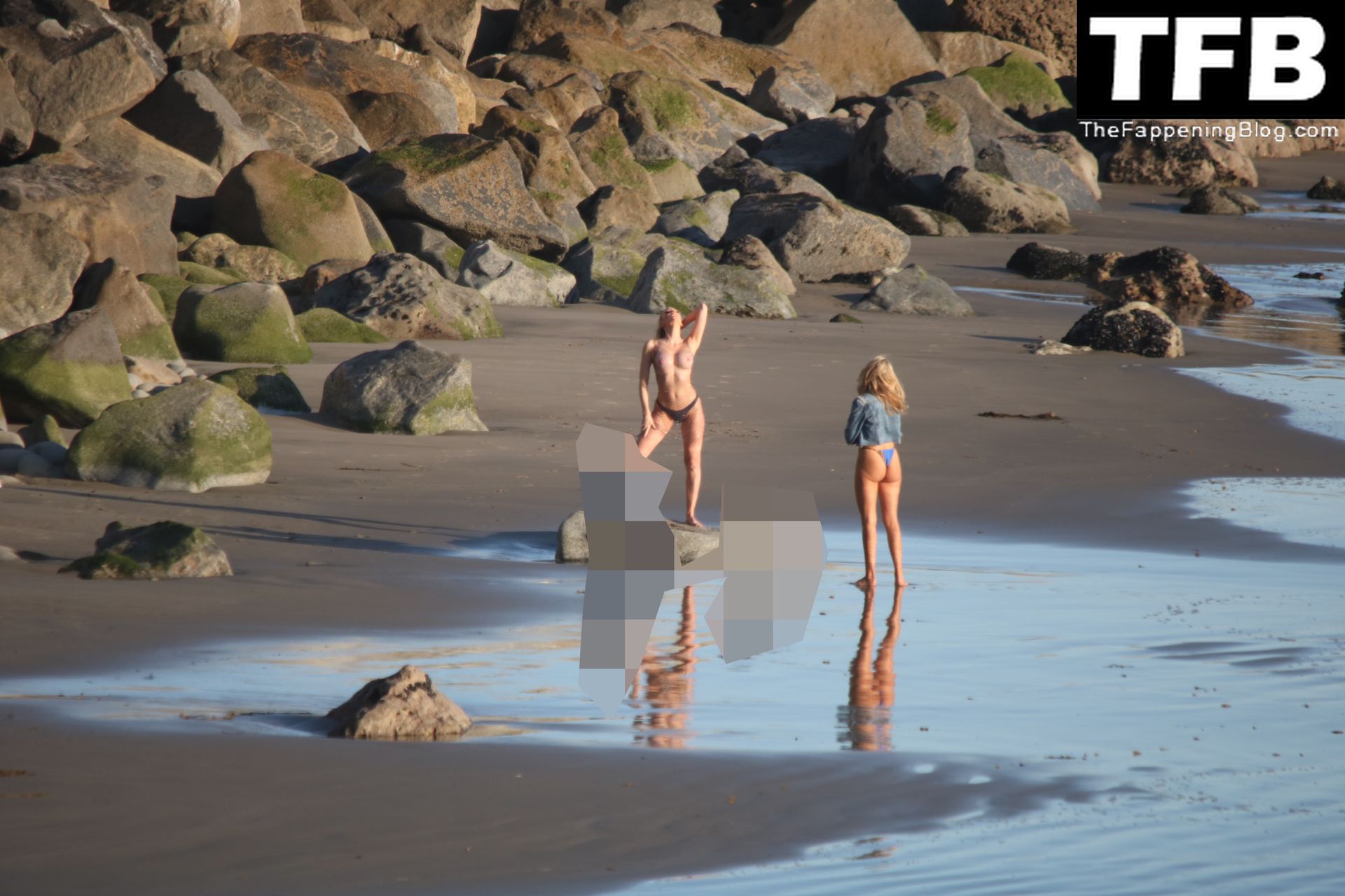 Maxim Australia modelo de portada Stephanie Marie muestra sus tetas desnudas posando sin camiseta en la playa con otras chicas.
