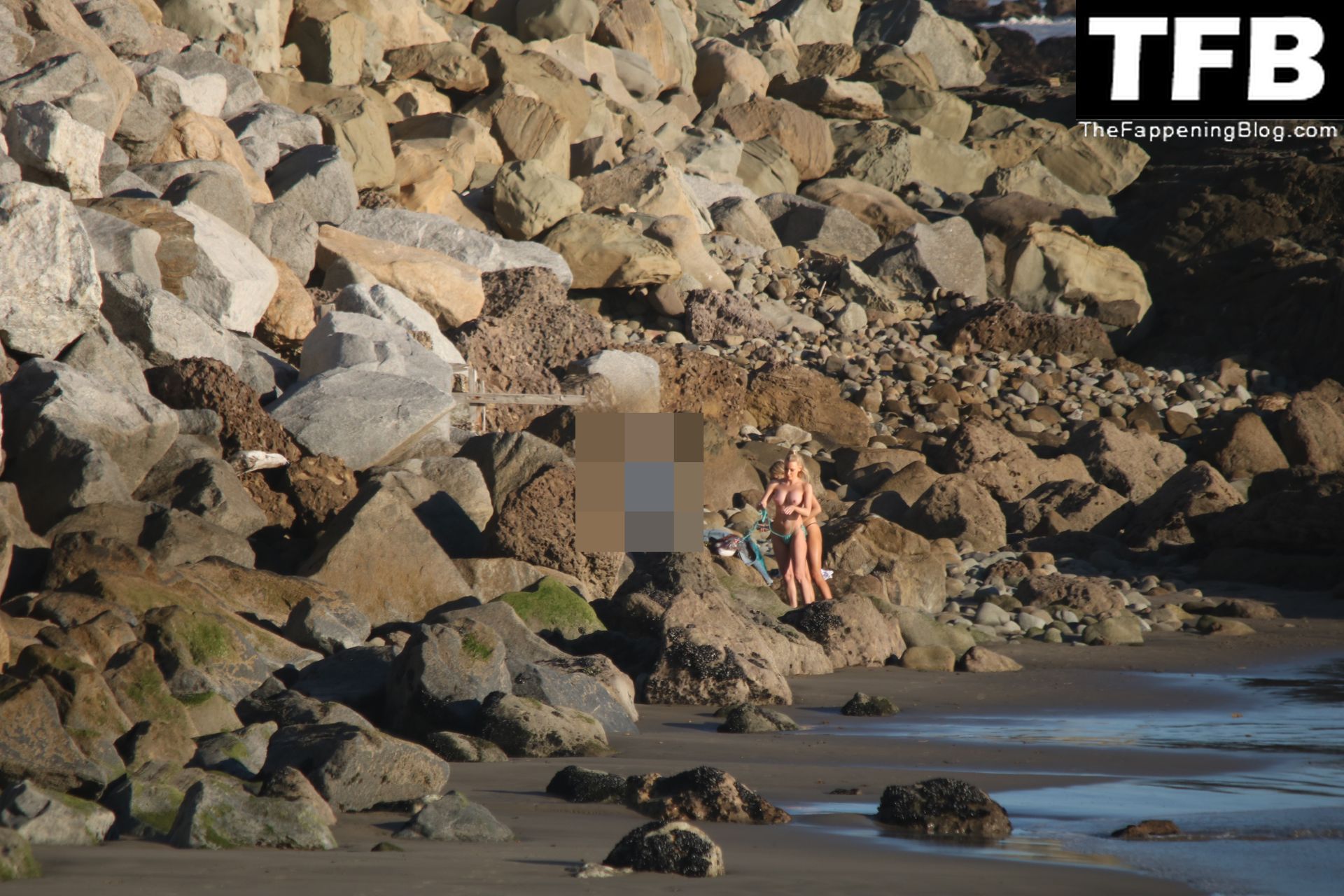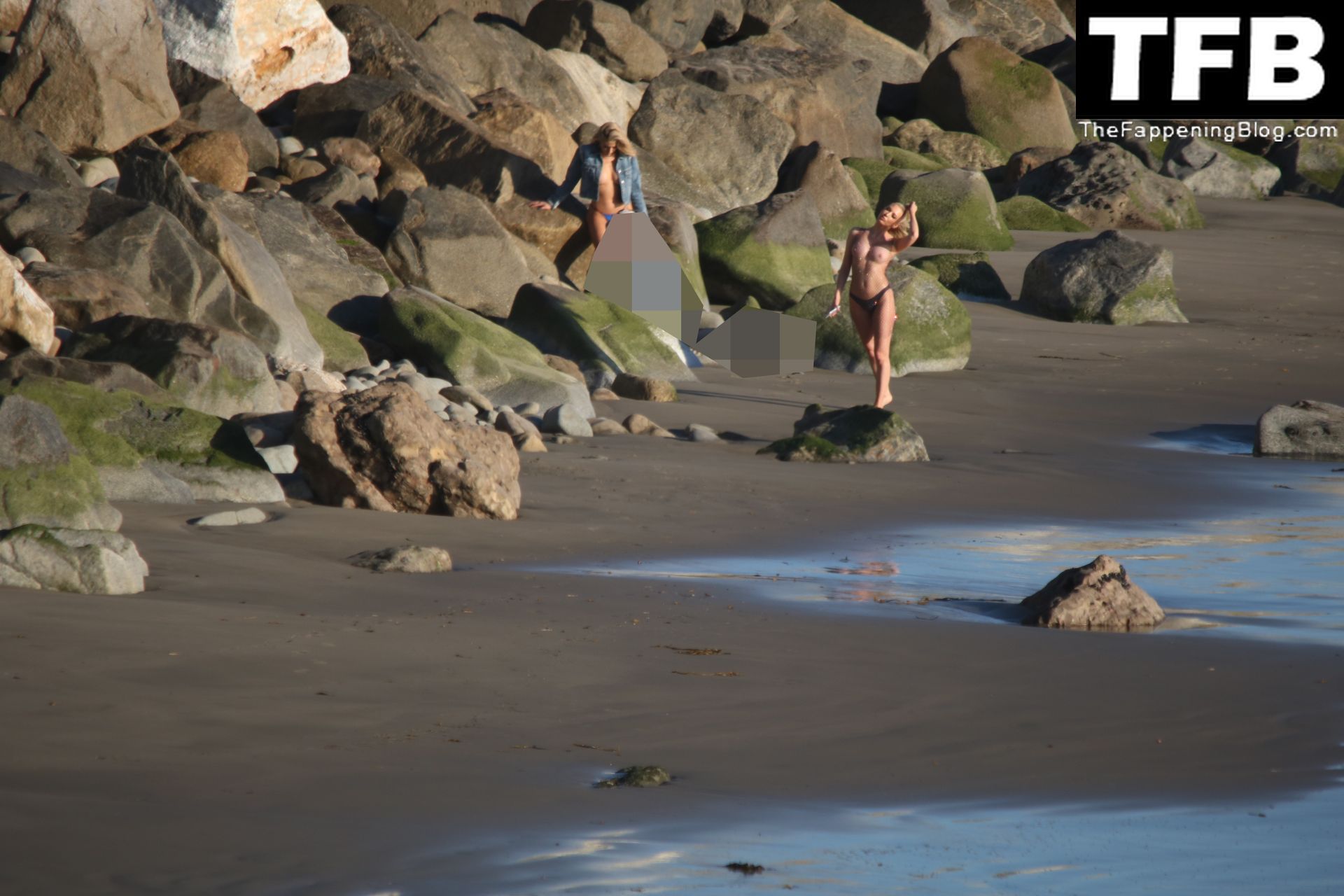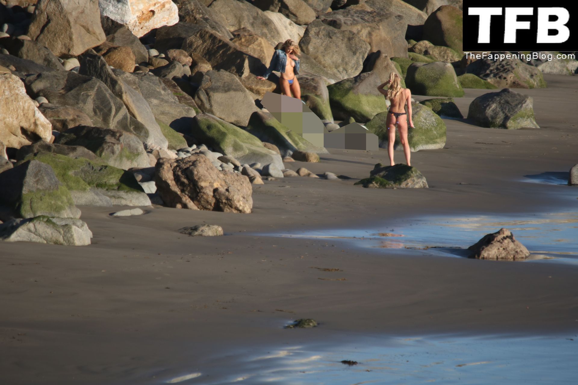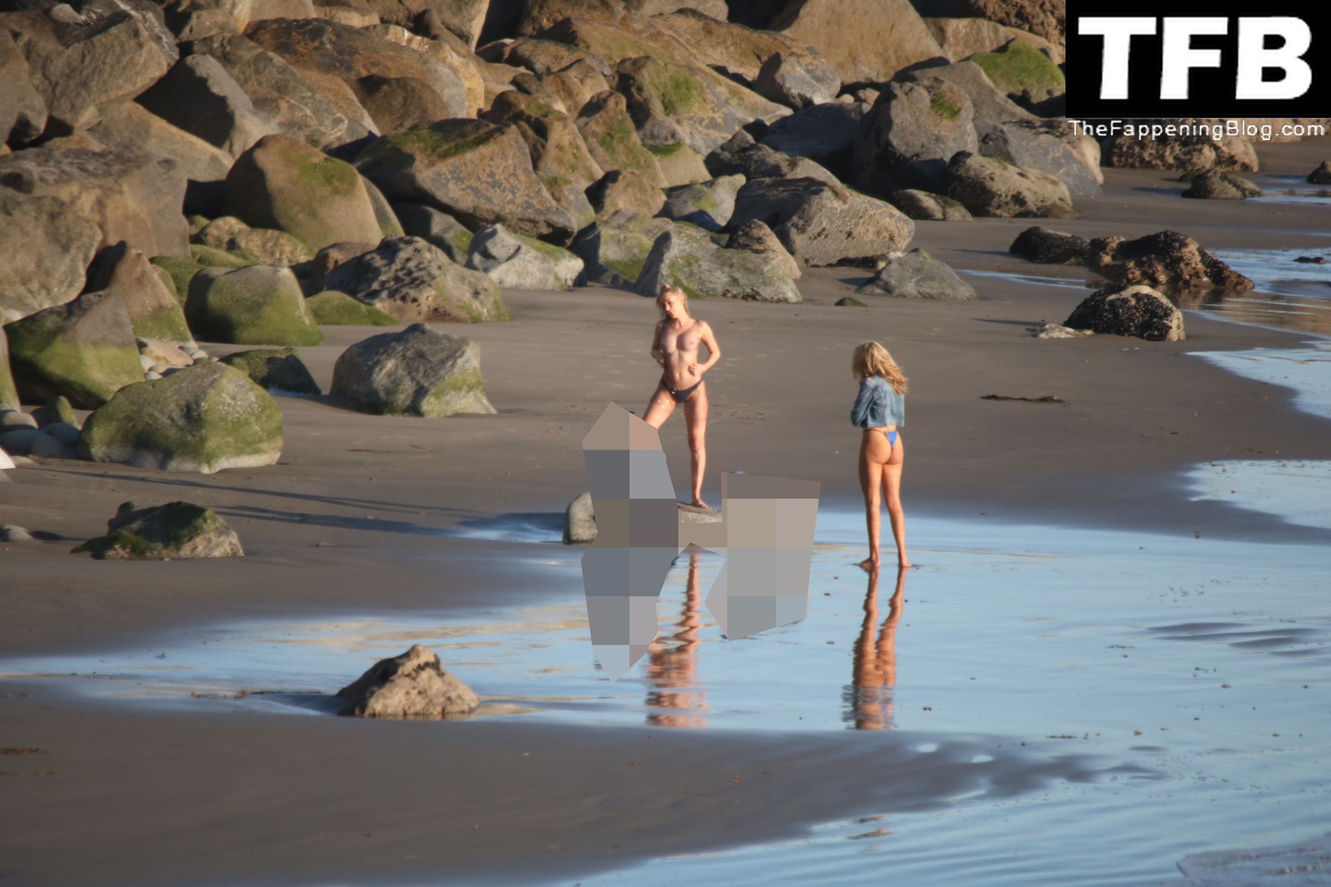 Maxim Australia modelo de portada Stephanie Marie muestra sus tetas desnudas posando sin camiseta en la playa con otras chicas.