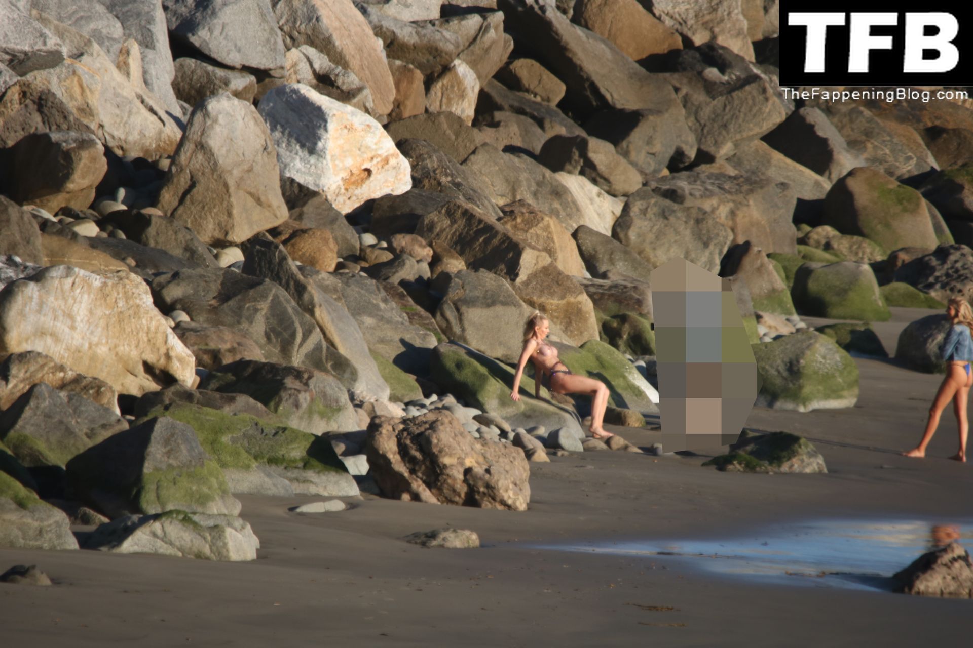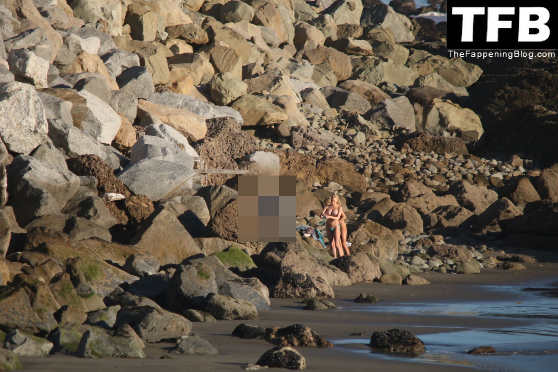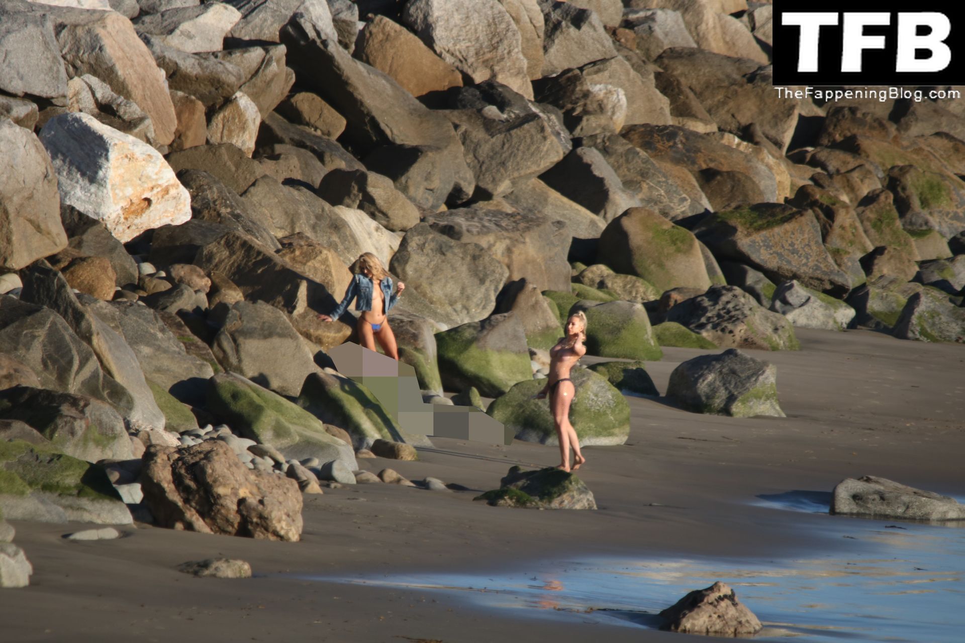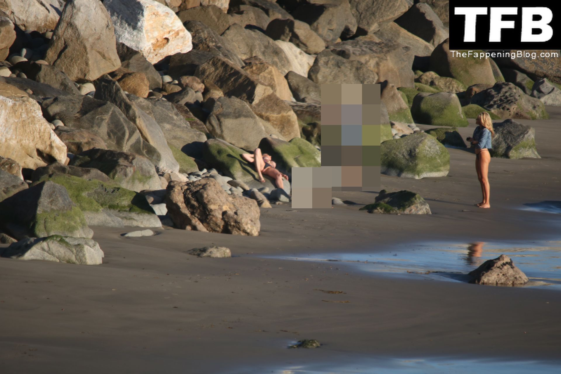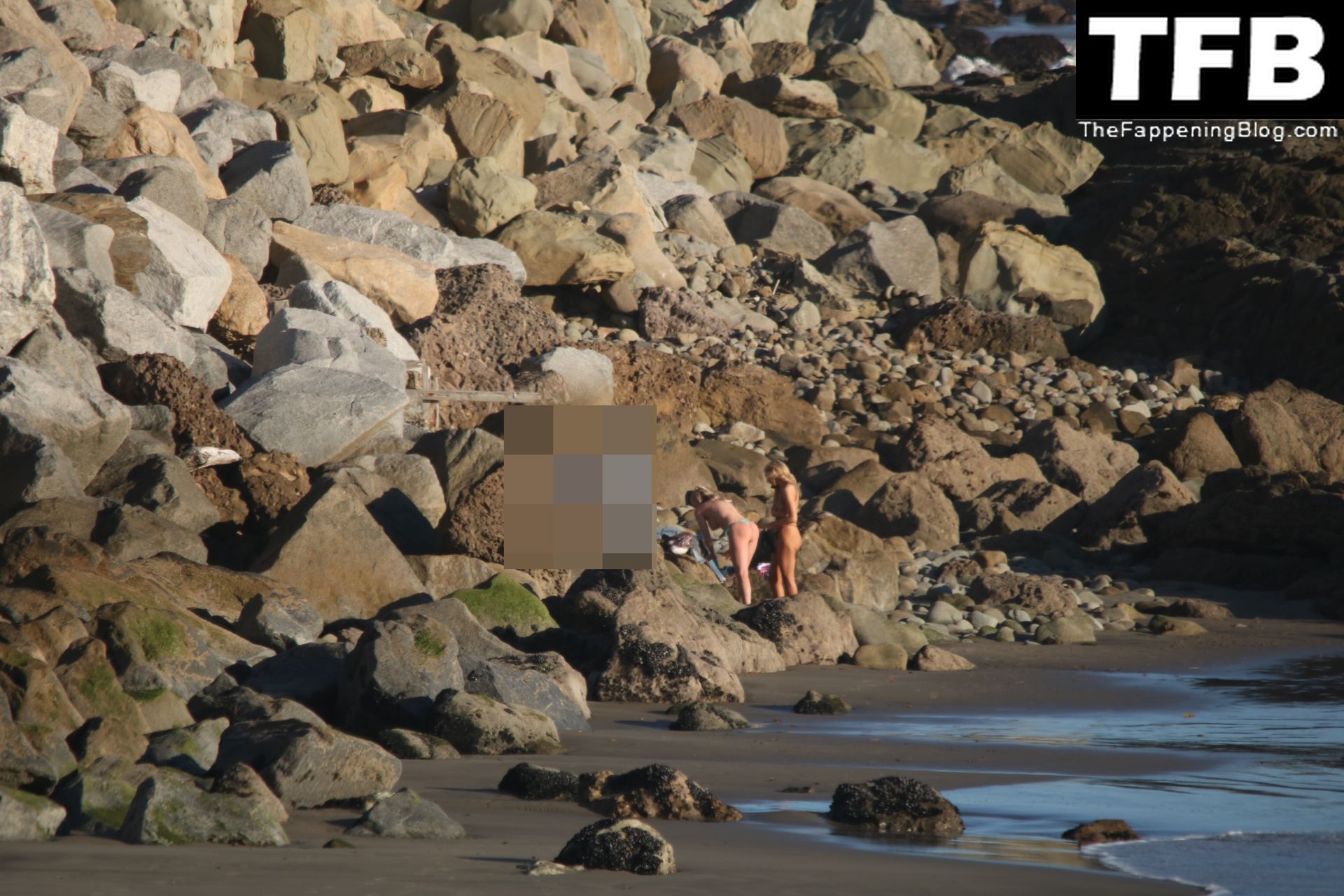 Maxim Australia modelo de portada Stephanie Marie muestra sus tetas desnudas posando sin camiseta en la playa con otras chicas.