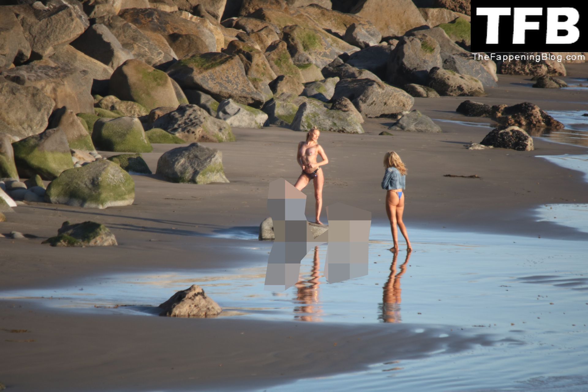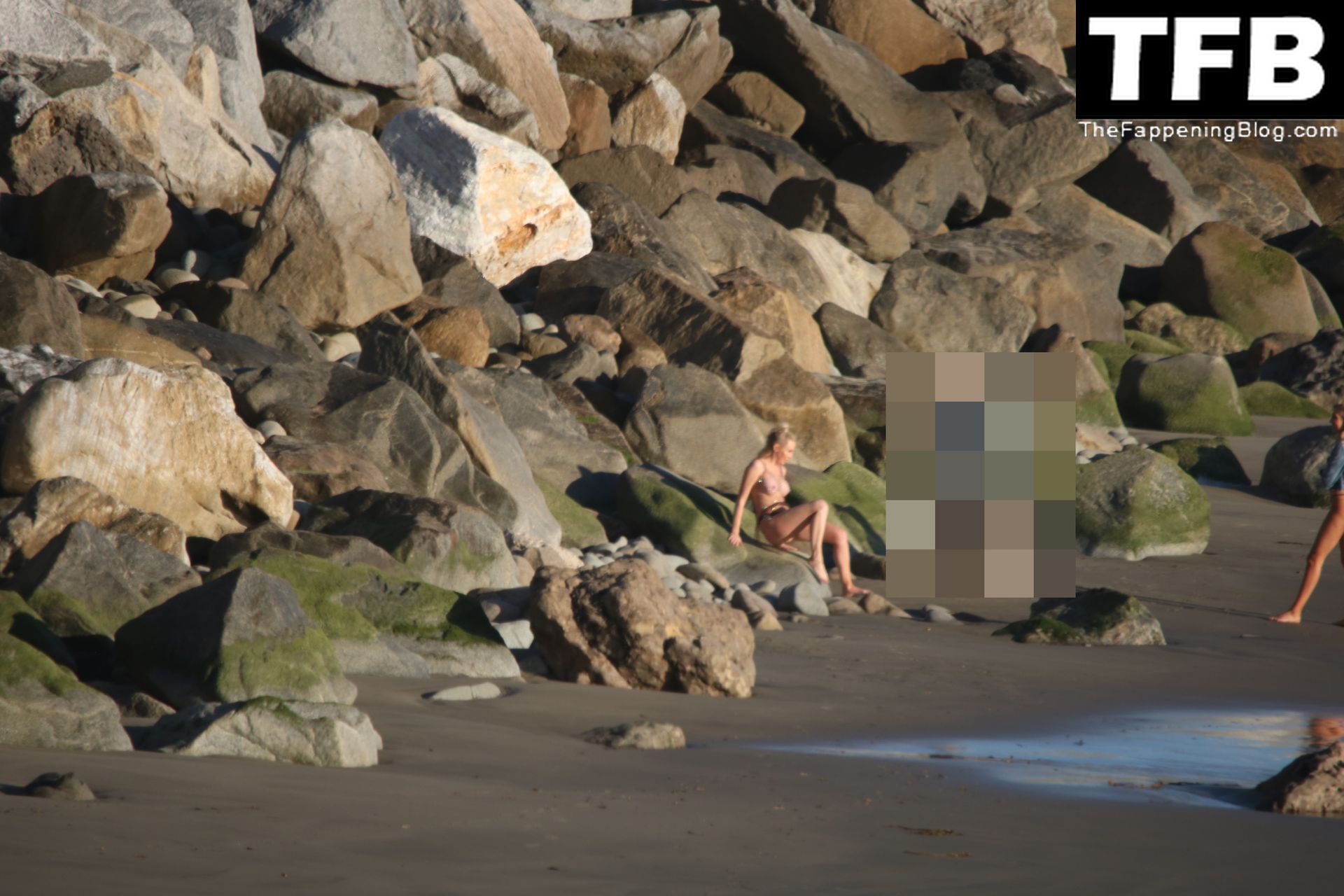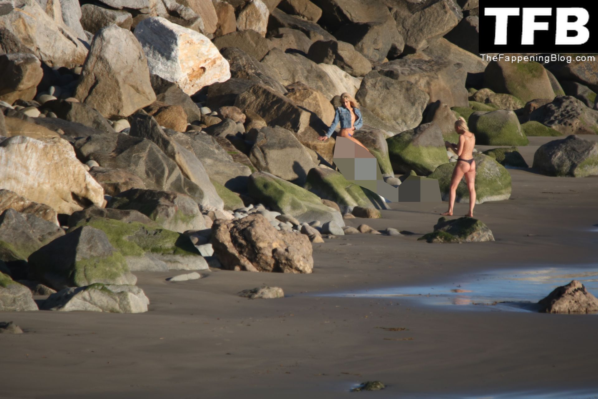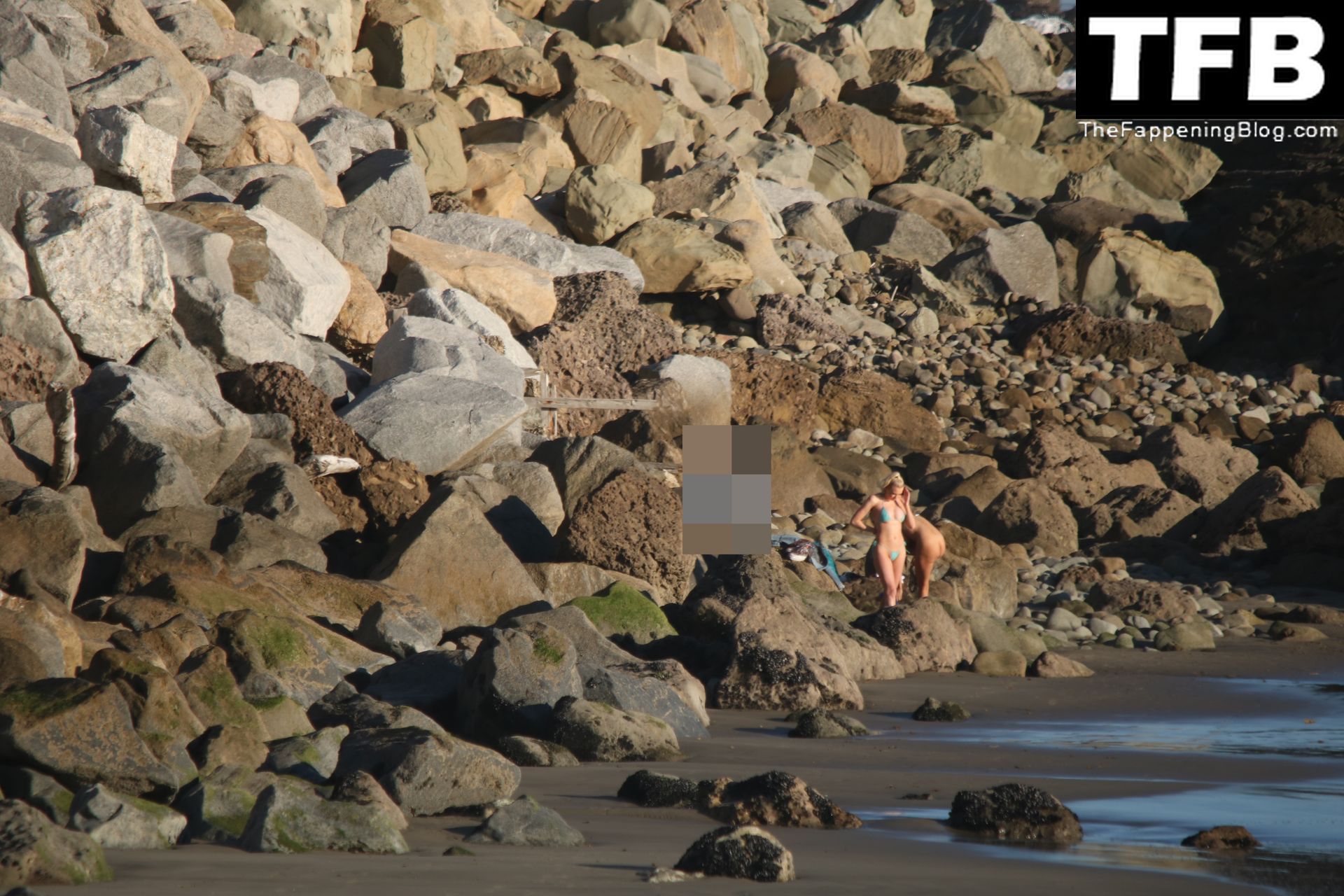 Maxim Australia modelo de portada Stephanie Marie muestra sus tetas desnudas posando sin camiseta en la playa con otras chicas.