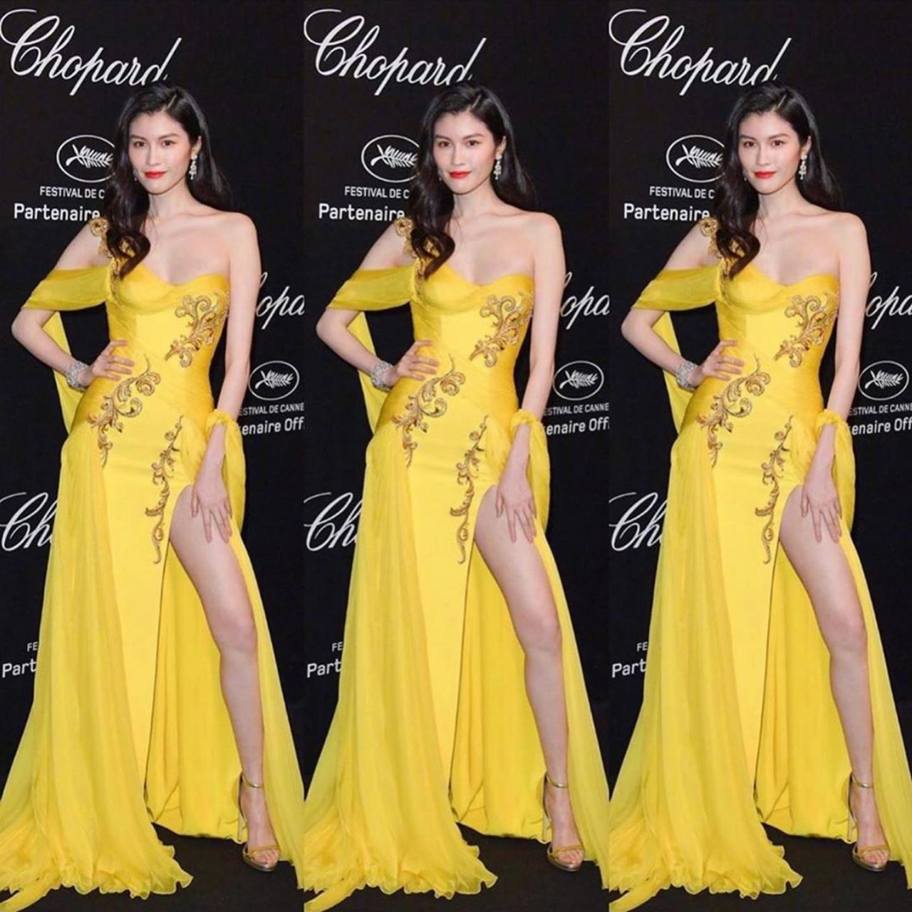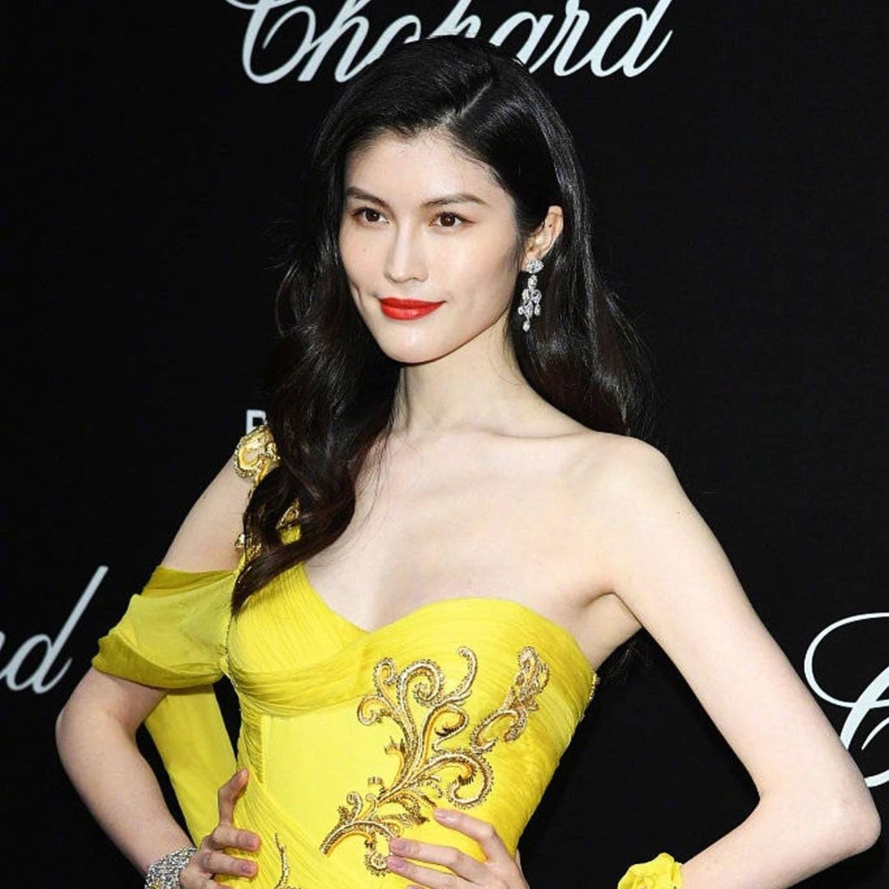 La modelo/actriz china Sui He (Hé Suì) fue fotografiada con un vestido amarillo en la Fiesta del Amor de Chopard durante el 72º Festival de Cine de Cannes en Le Cannet, Francia, 17/05/2019.