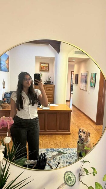 Actriz estadounidense Susan Kelechi Watson se detiene para tomar un jugo fresco mientras pasea a su perro con una amiga en West Hollywood, 18/06/2020.
