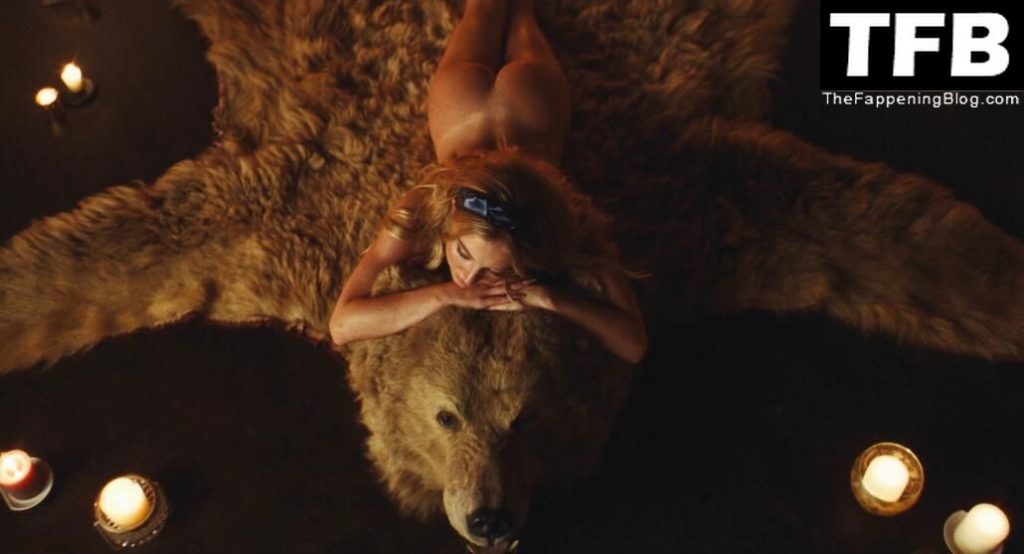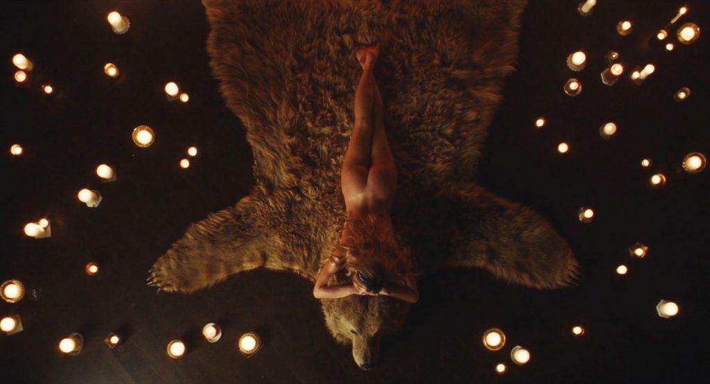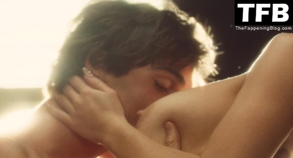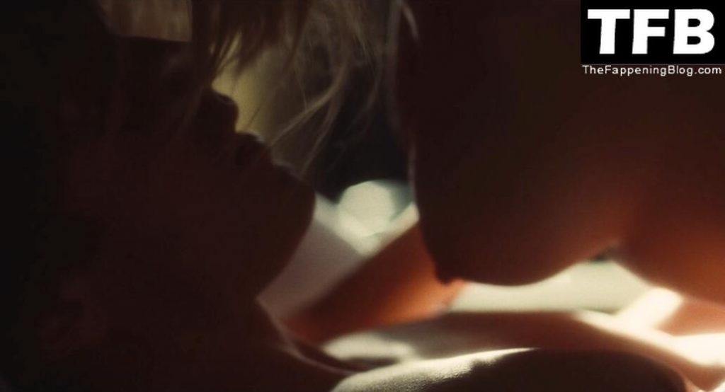 Sydney Sweeney muestra sus pechos y glúteos en un montaje donde ella y un hombre tienen sexo, primero en una escena con luz de fondo en una cama con Sydney encima de él, luego con Sydney acostada desnuda boca abajo sobre una alfombra junto a una chimenea, y después con Sydney en su regazo mientras tienen sexo en el mismo lugar.