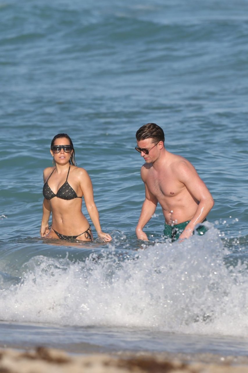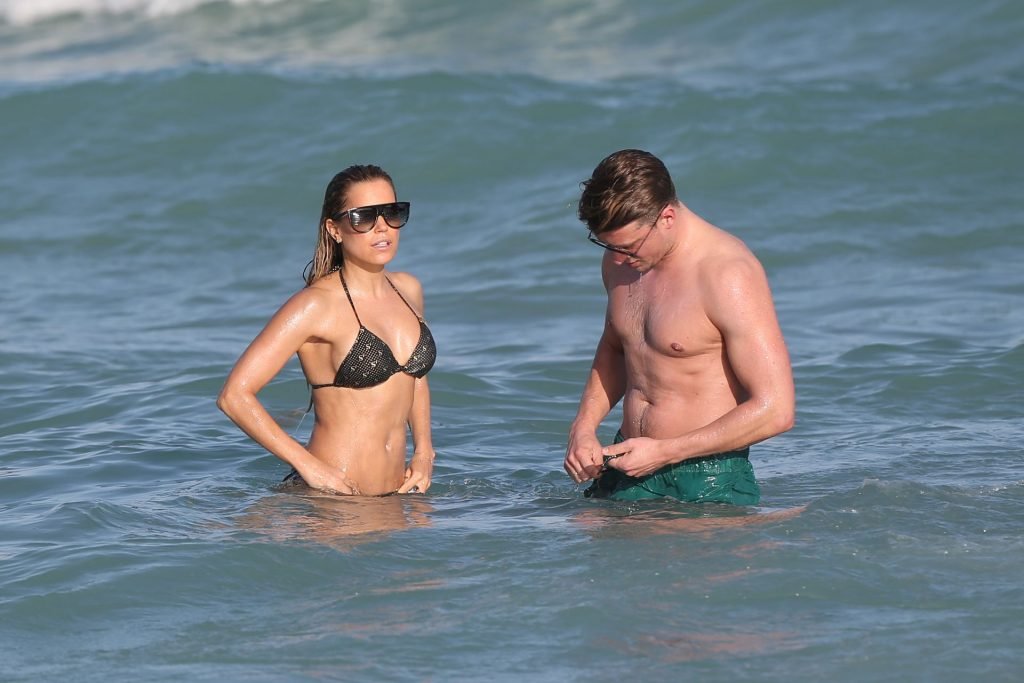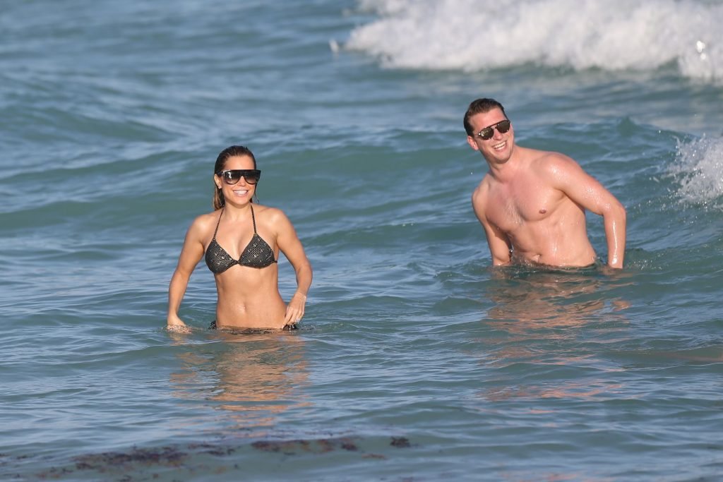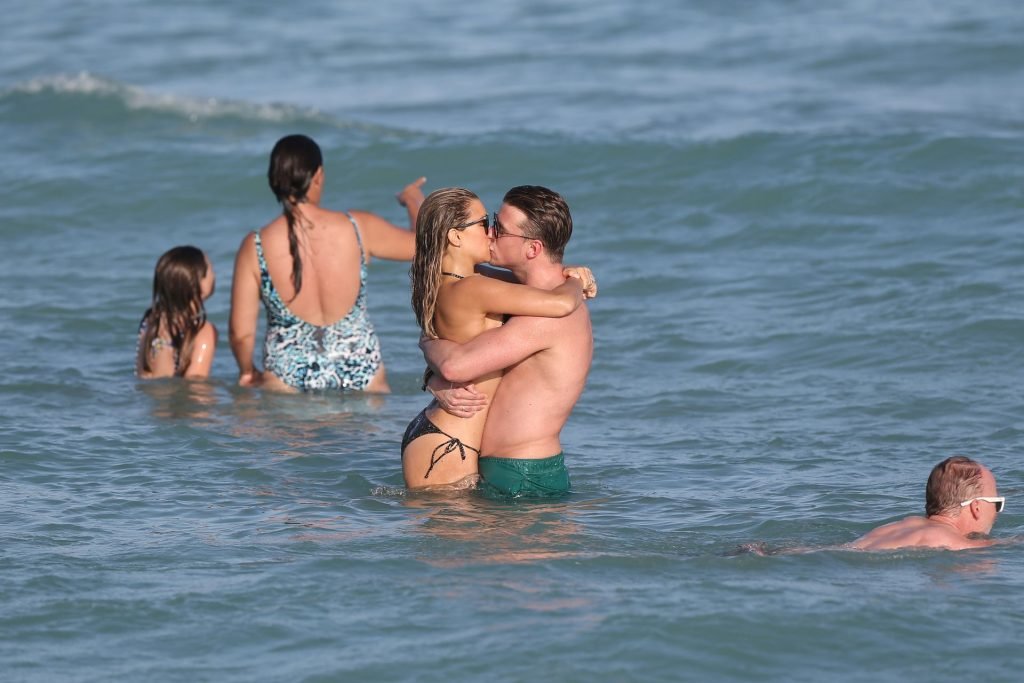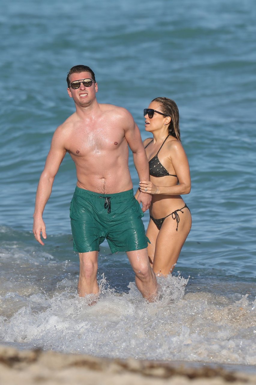 Modelo y presentadora de televisión holandesa Sylvie Meis luce fantástica a los 40 años mientras muestra su cuerpo en bikini y un enorme anillo de diamantes en la playa con su novio de 29 años Bart Willemsen en Miami, 29/12/2018.