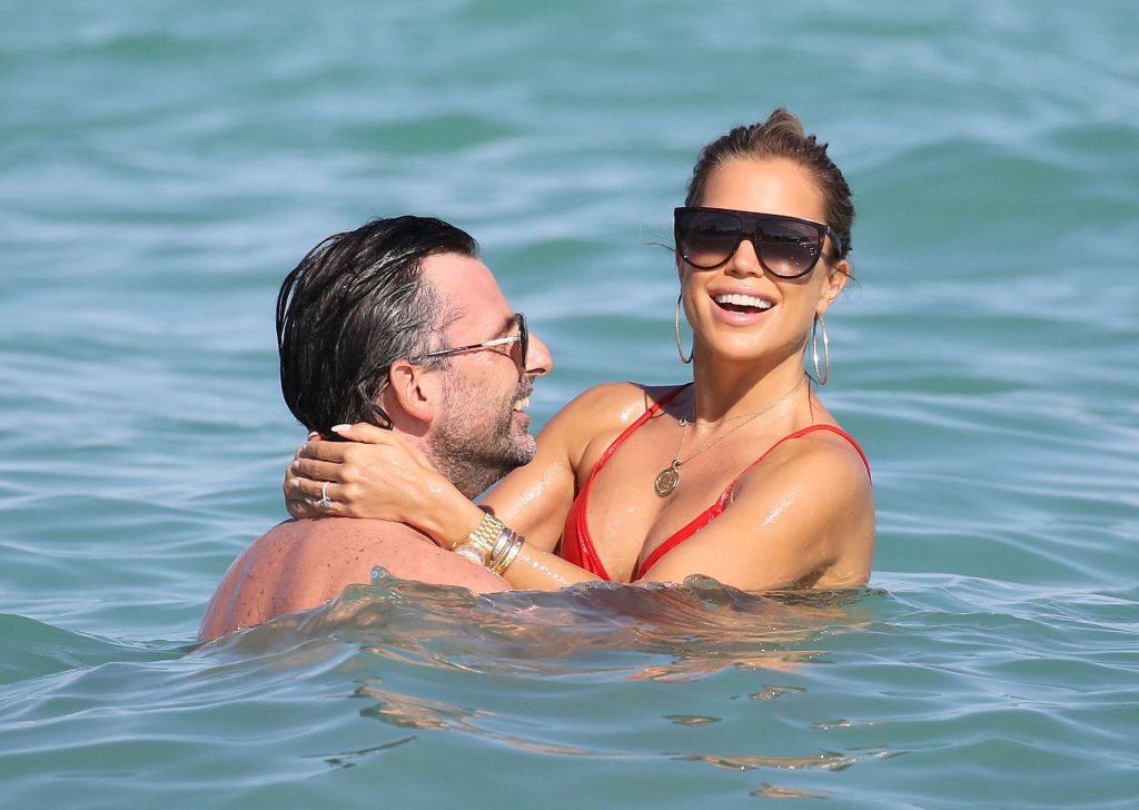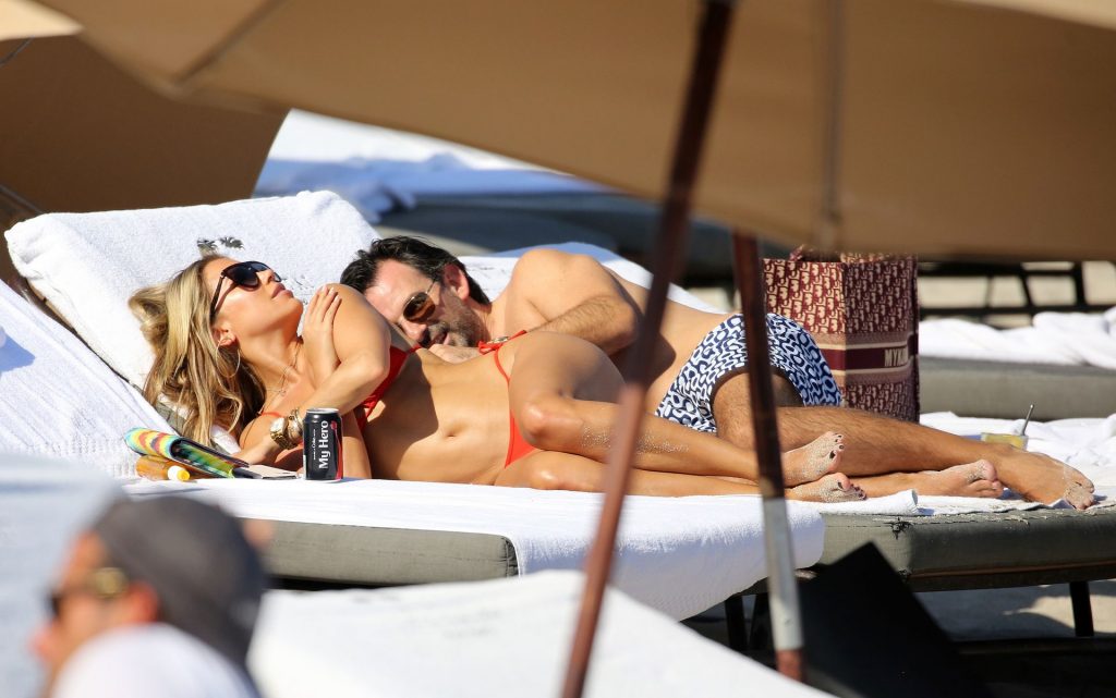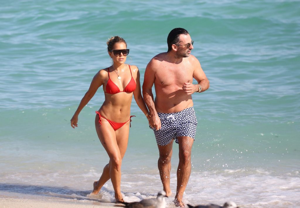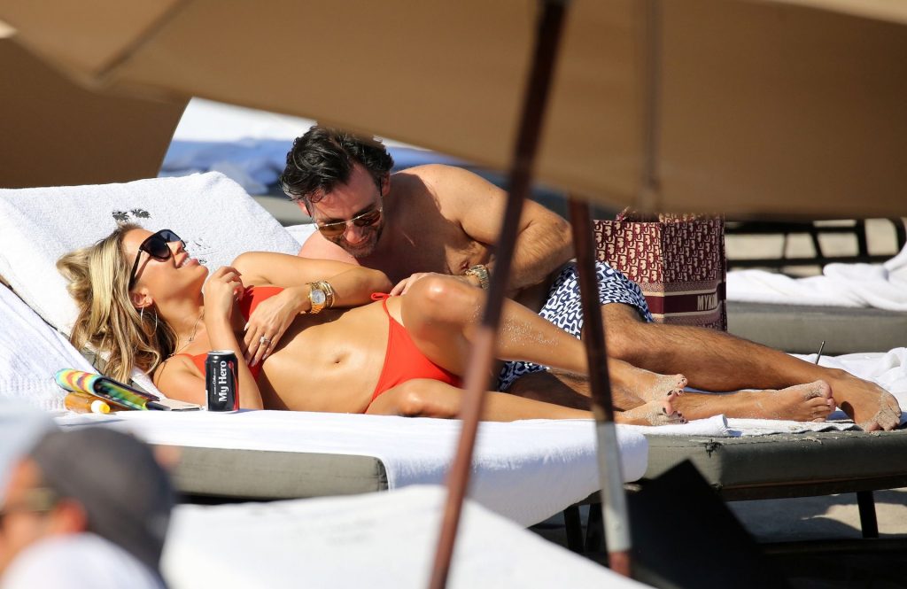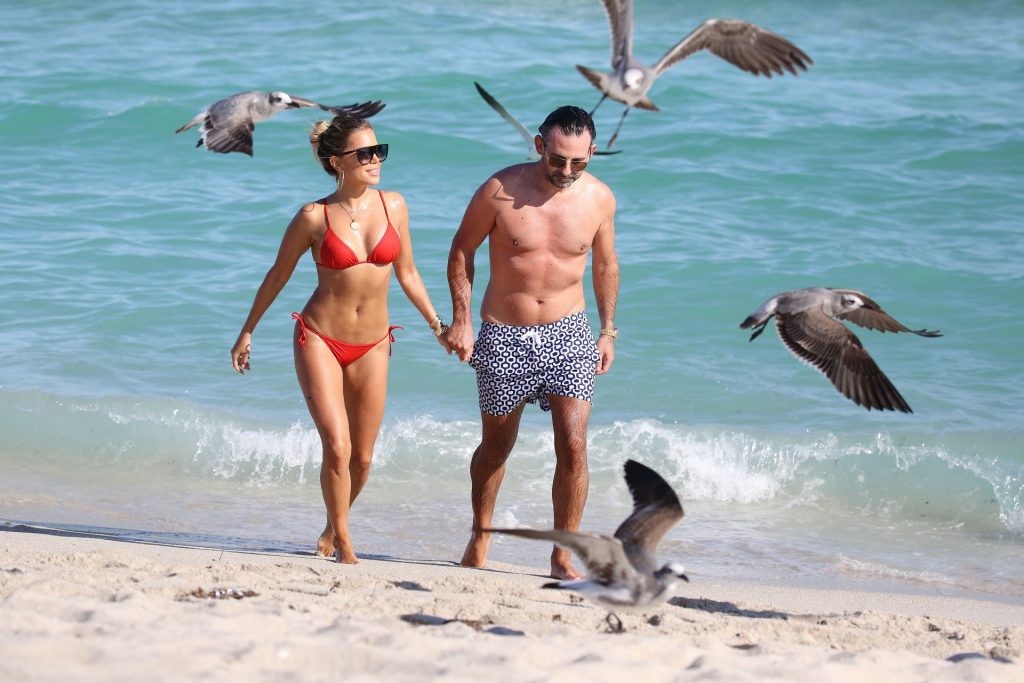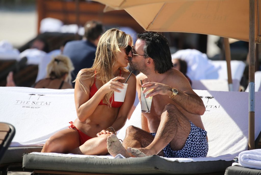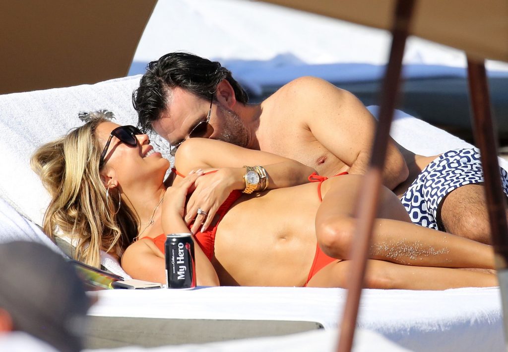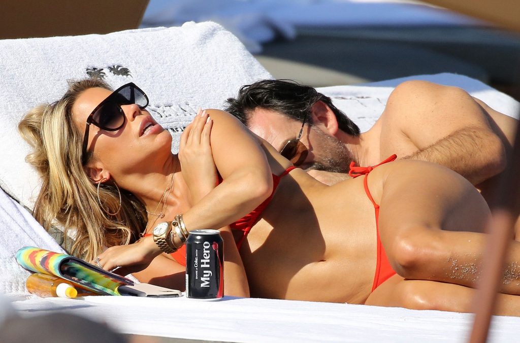 Sylvie Meis lleva un bikini rojo y muestra un anillo de compromiso mientras besa a Niclas Castello en la playa de Miami, 12/01/2019. La pareja fue vista riendo mientras compartían una lata de Coca-Cola que decía “Mi héroe.”