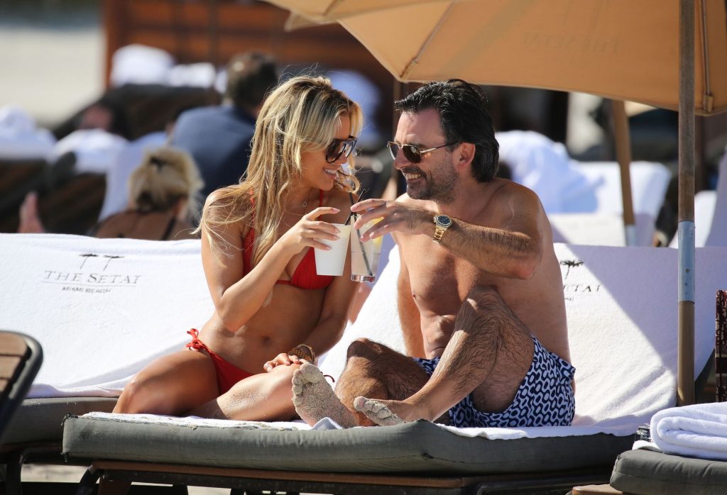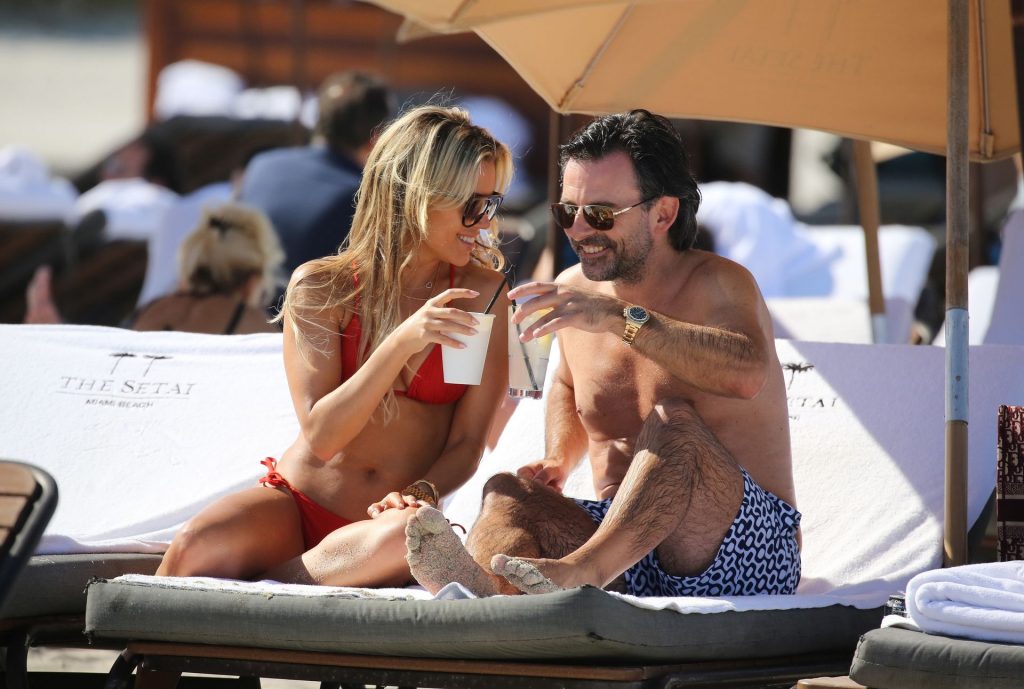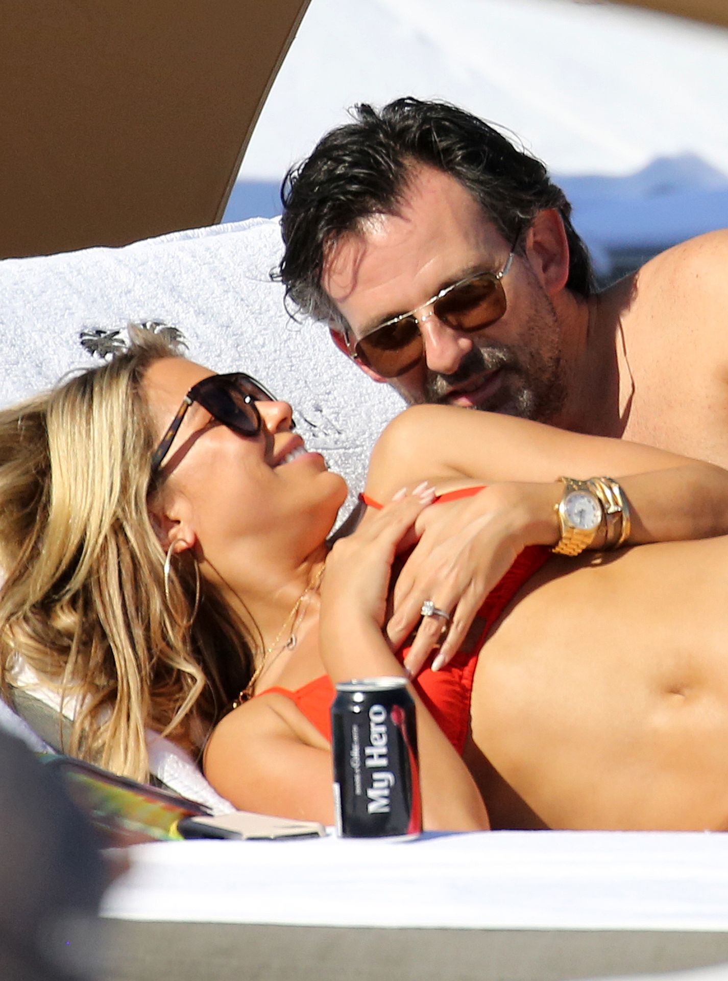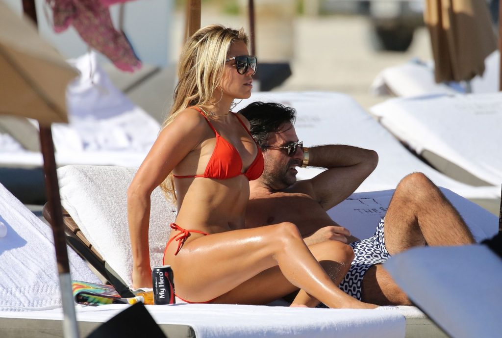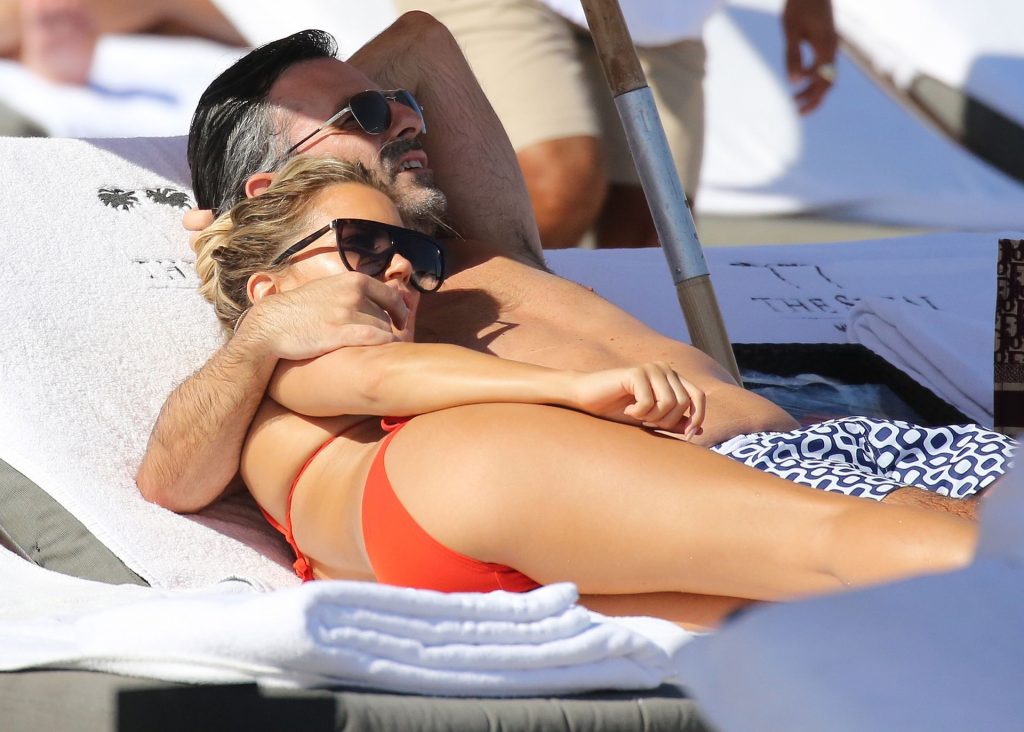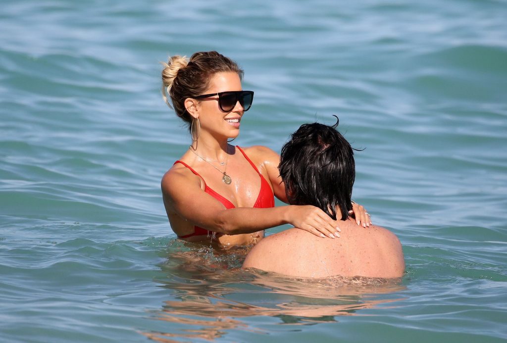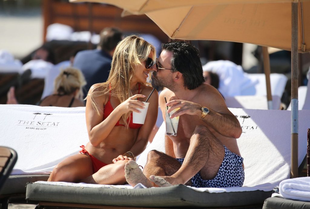 Sylvie Meis lleva un bikini rojo y muestra un anillo de compromiso mientras besa a Niclas Castello en la playa de Miami, 12/01/2019. La pareja fue vista riendo mientras compartían una lata de Coca-Cola que decía “Mi héroe.”