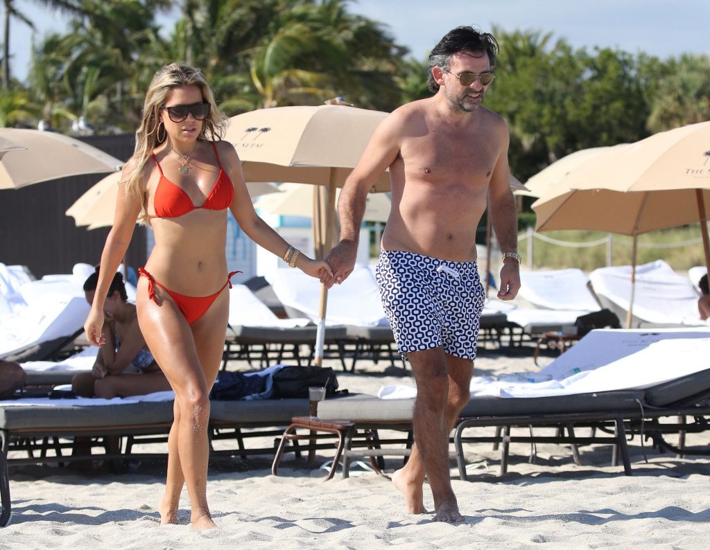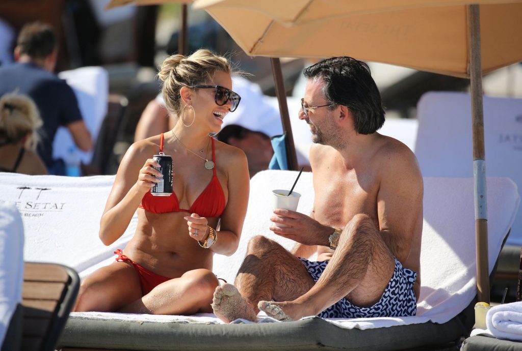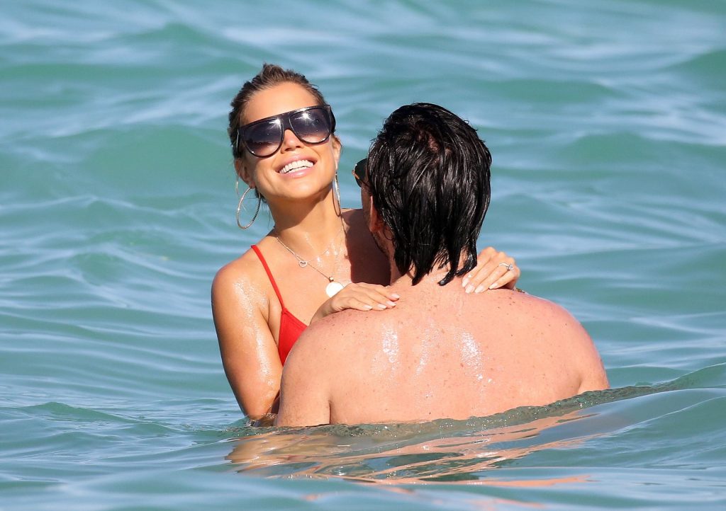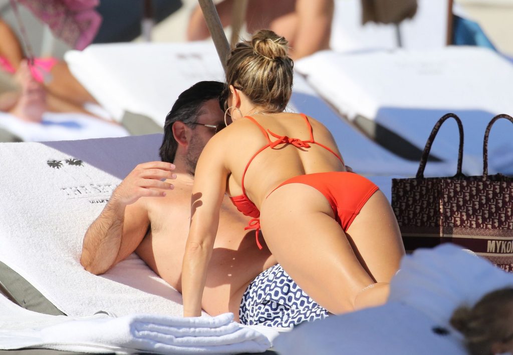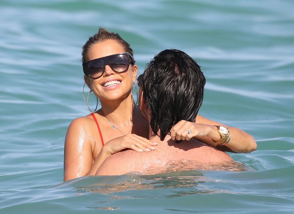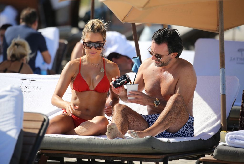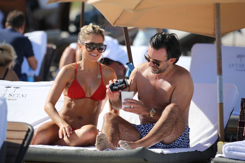 Sylvie Meis lleva un bikini rojo y muestra un anillo de compromiso mientras besa a Niclas Castello en la playa de Miami, 12/01/2019. La pareja fue vista riendo mientras compartían una lata de Coca-Cola que decía “Mi héroe.”