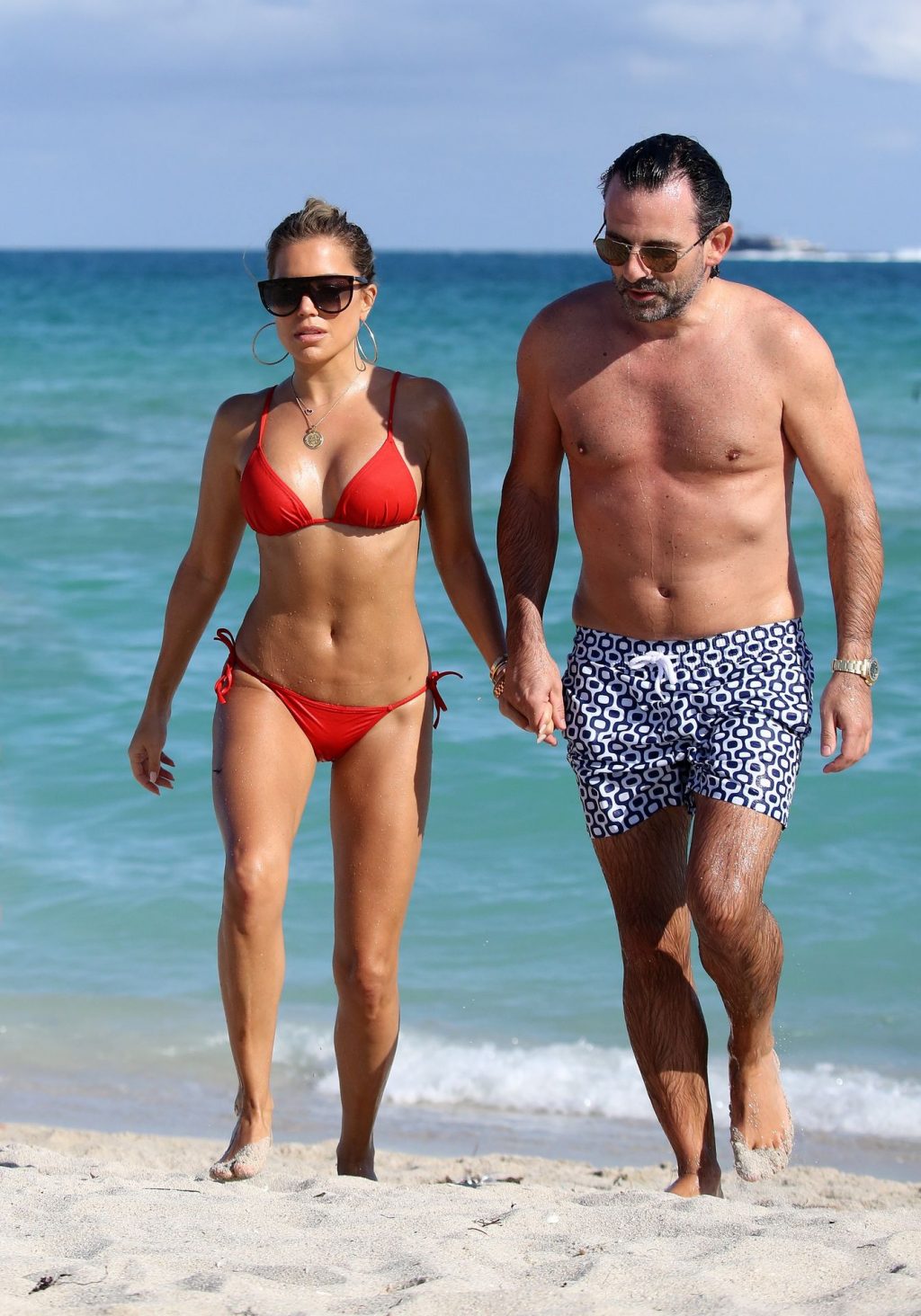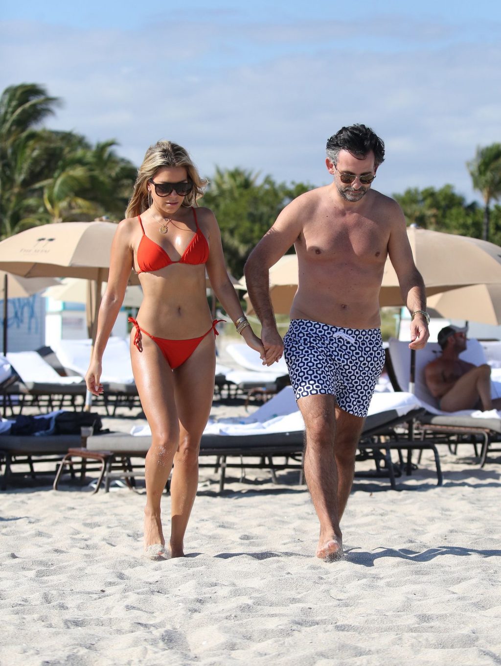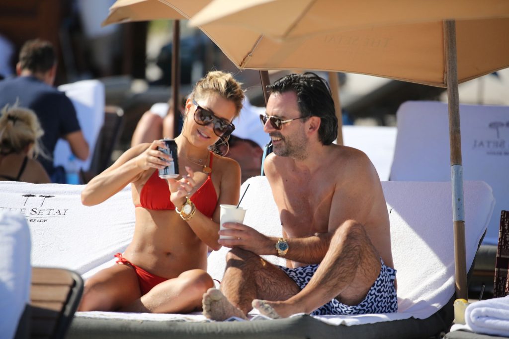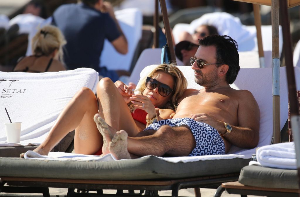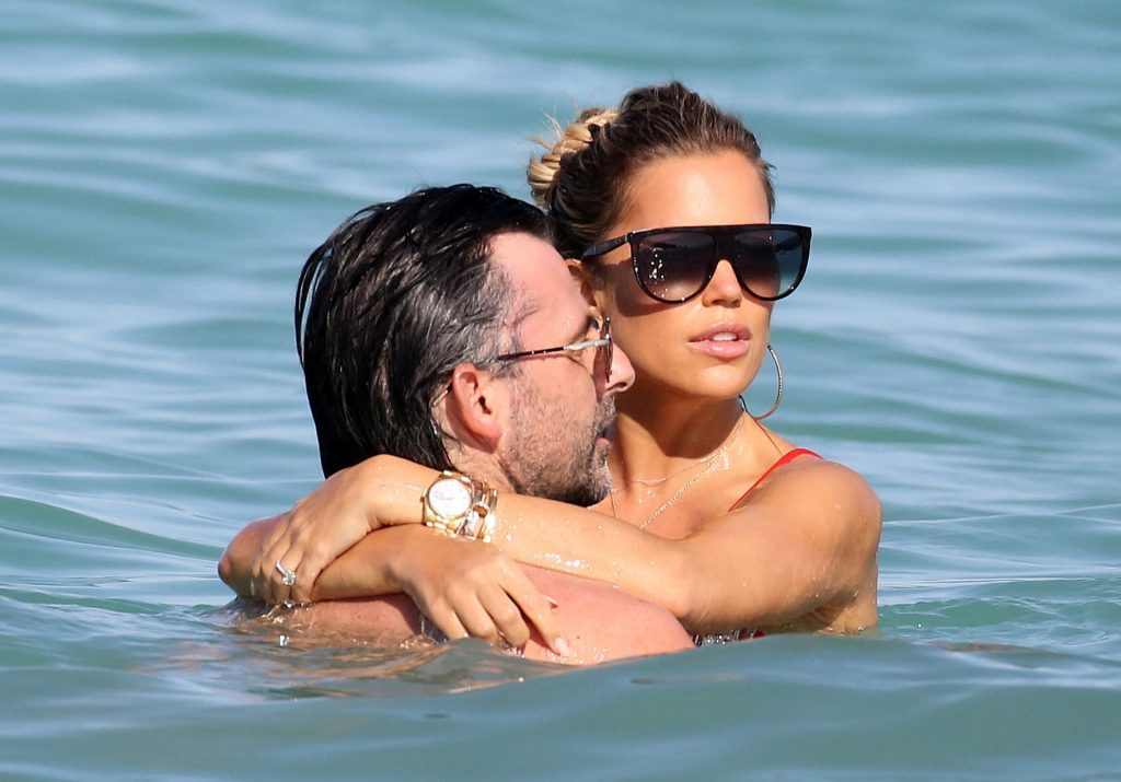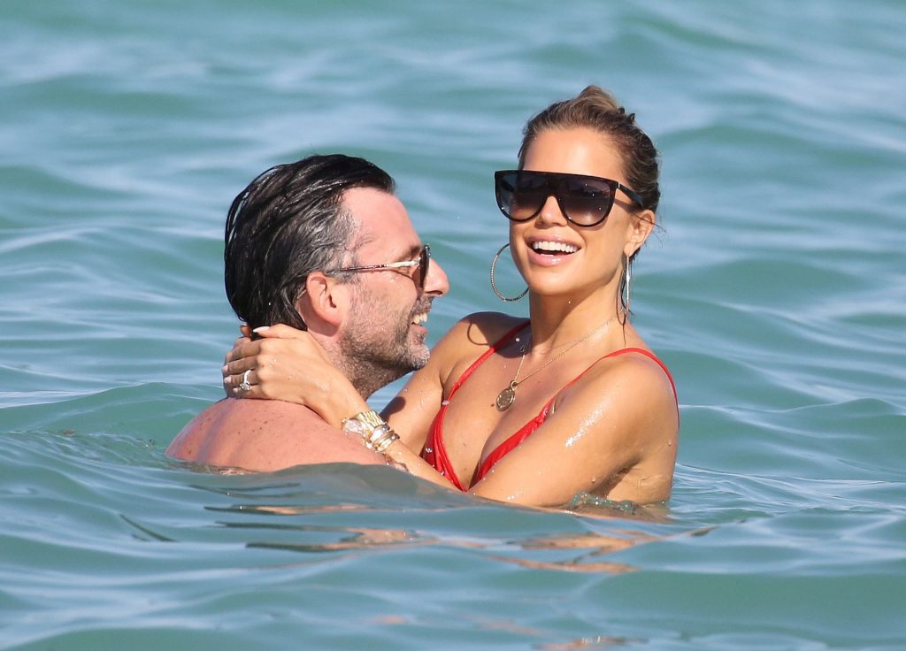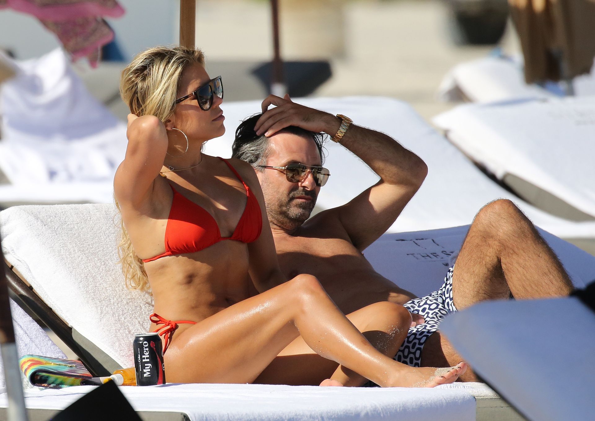 Sylvie Meis lleva un bikini rojo y muestra un anillo de compromiso mientras besa a Niclas Castello en la playa de Miami, 12/01/2019. La pareja fue vista riendo mientras compartían una lata de Coca-Cola que decía “Mi héroe.”