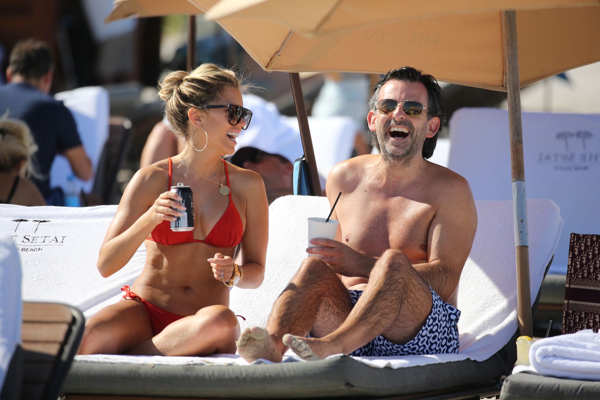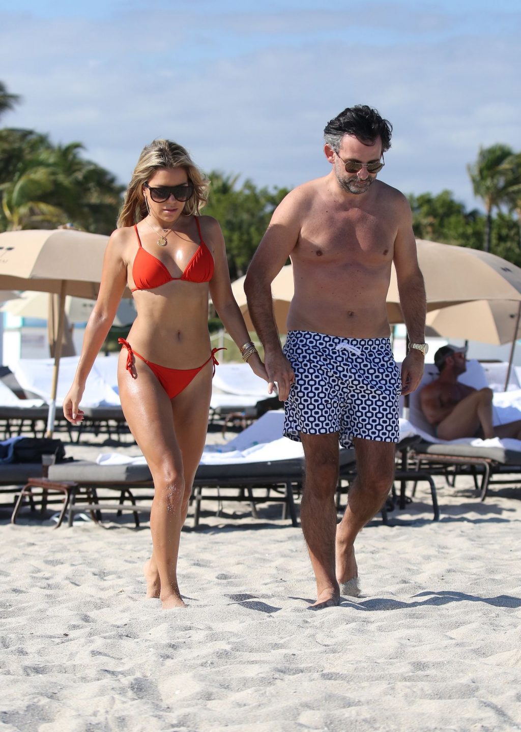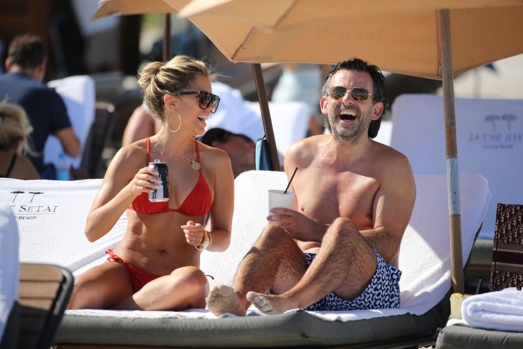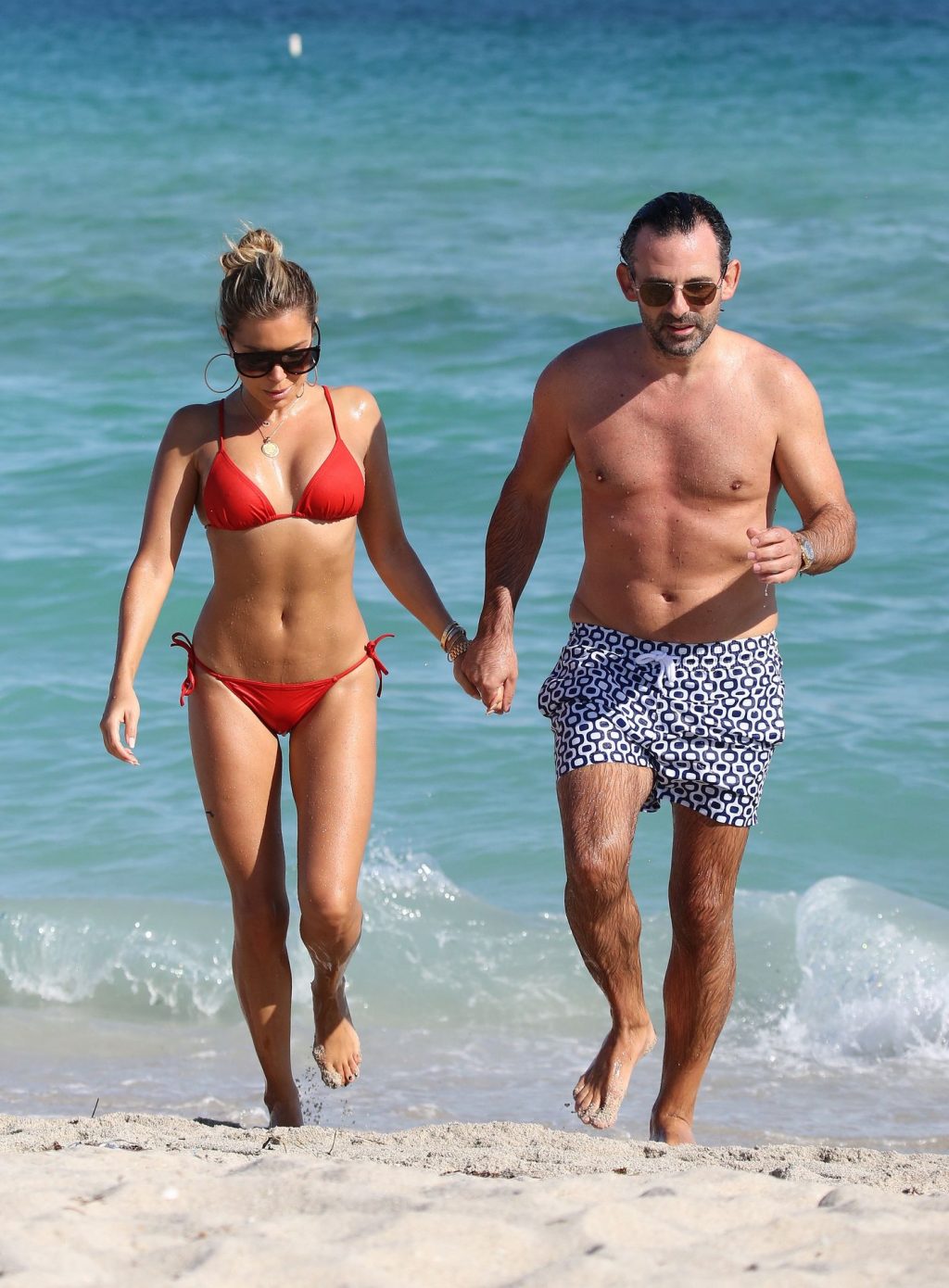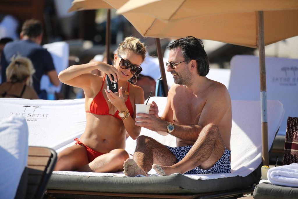 Sylvie Meis lleva un bikini rojo y muestra un anillo de compromiso mientras besa a Niclas Castello en la playa de Miami, 12/01/2019. La pareja fue vista riendo mientras compartían una lata de Coca-Cola que decía “Mi héroe.”