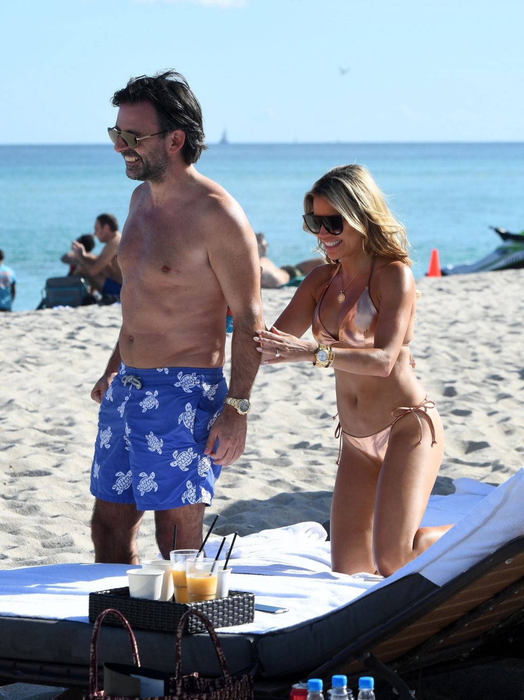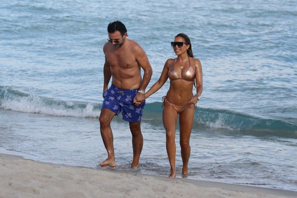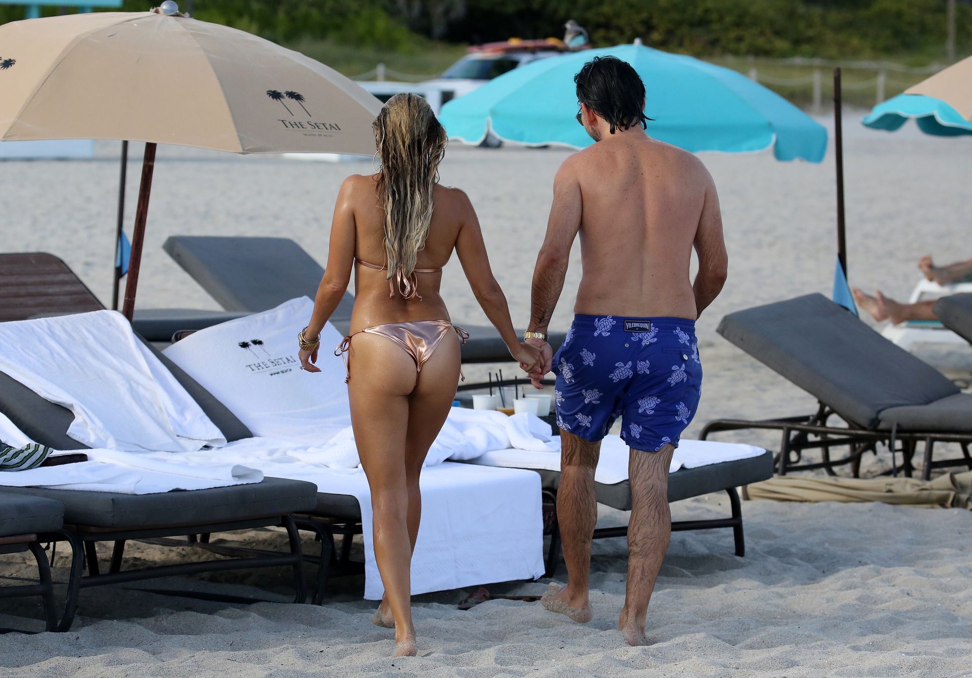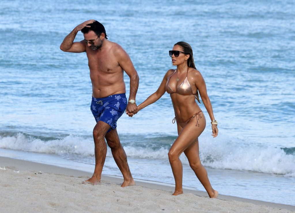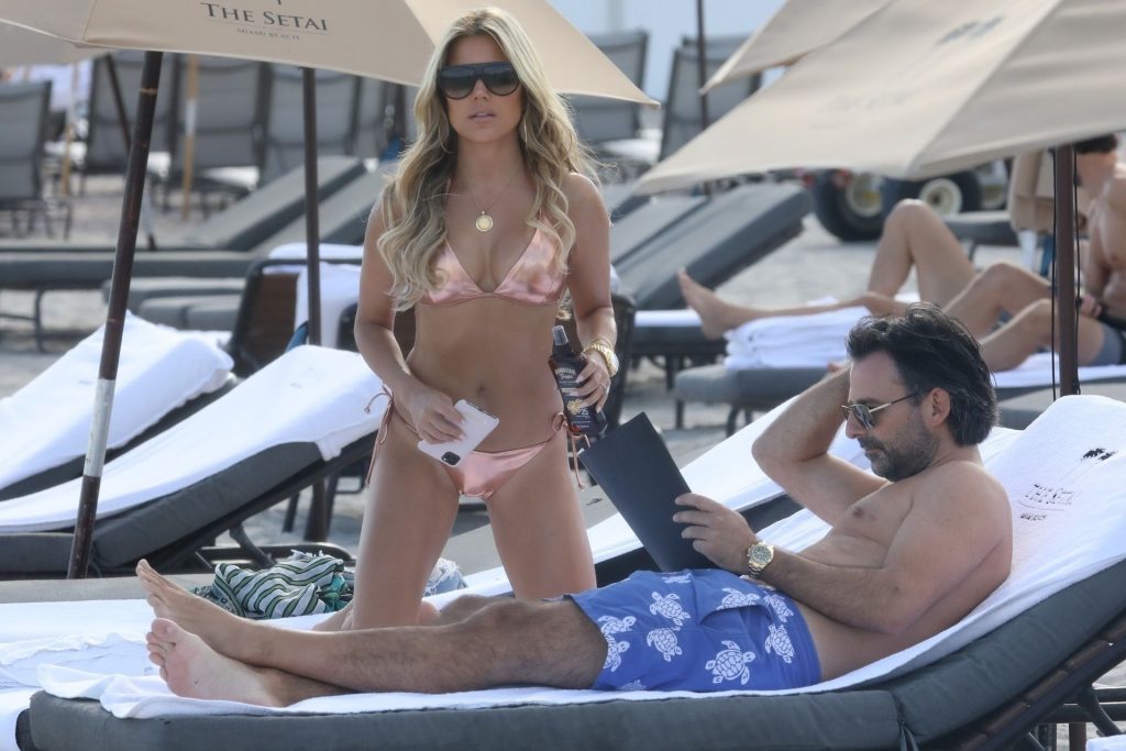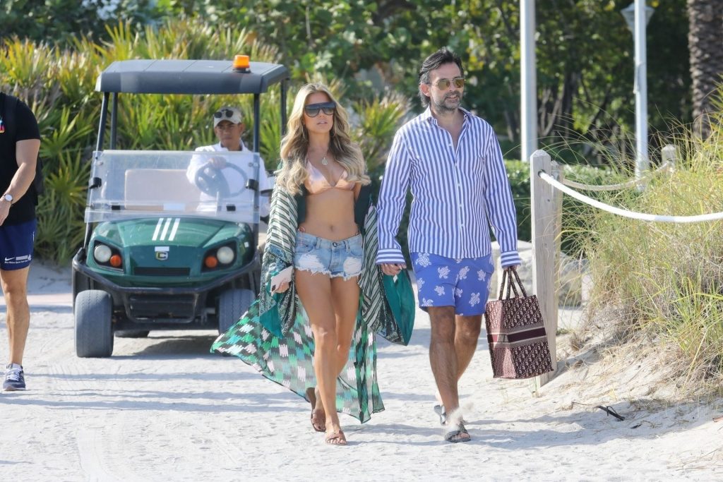 Van der Vaart, la exesposa supermodelo Sylvie Meis, muestra sus curvas con un bikini durazno durante un día en la playa con su prometido Niclas Castello en Miami Beach, 12/04/2019.