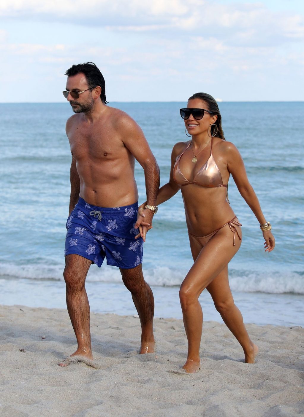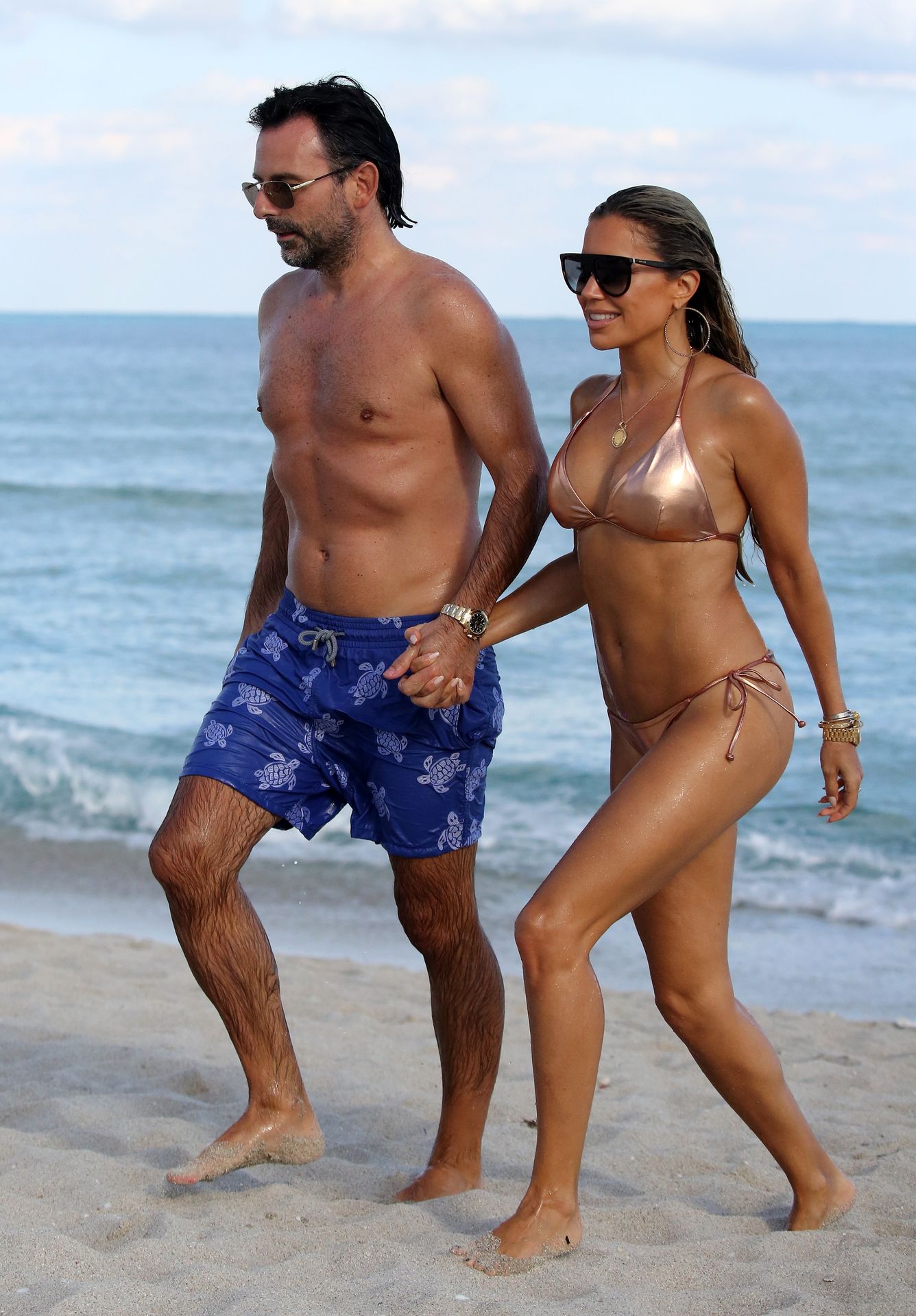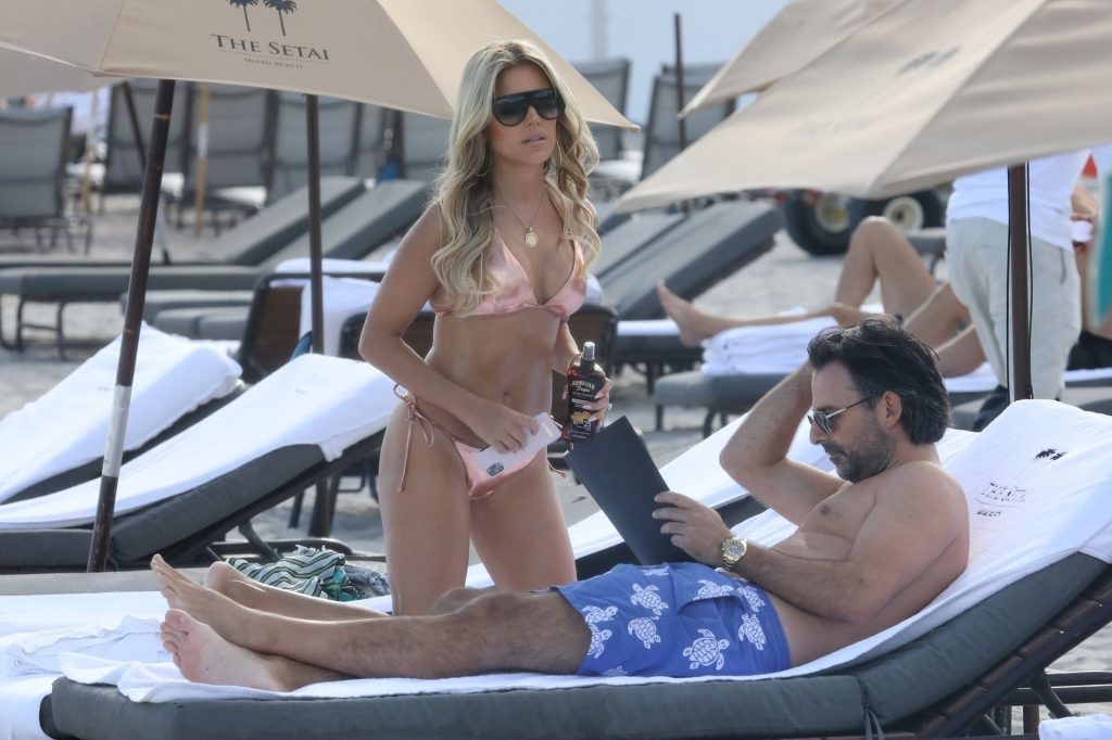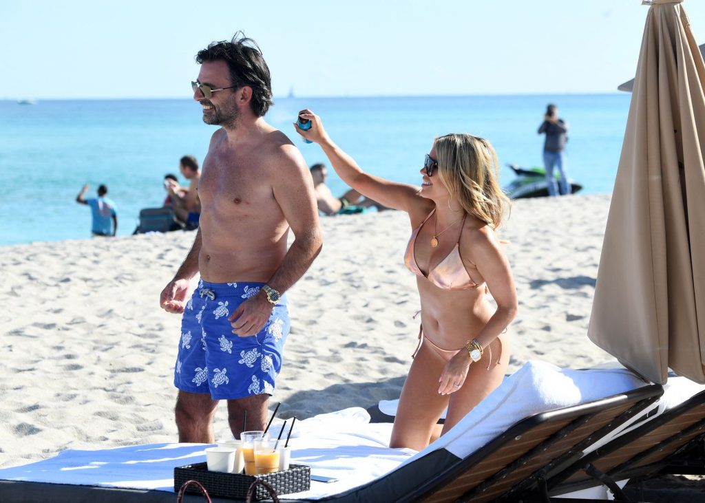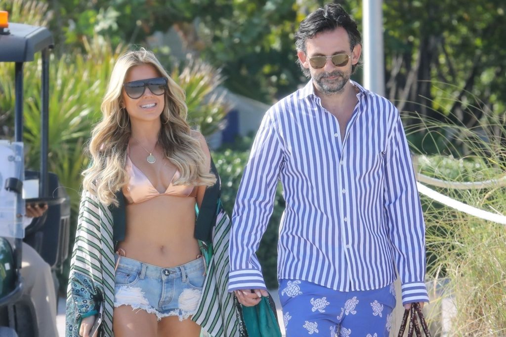 Van der Vaart, la exesposa supermodelo Sylvie Meis, muestra sus curvas con un bikini durazno durante un día en la playa con su prometido Niclas Castello en Miami Beach, 12/04/2019.