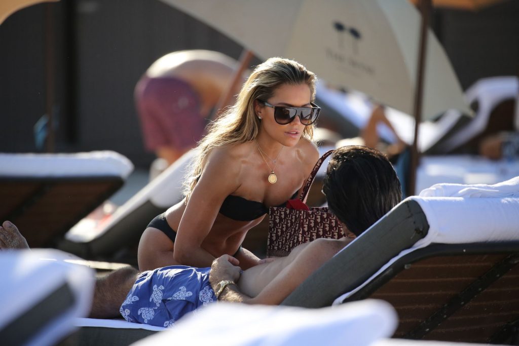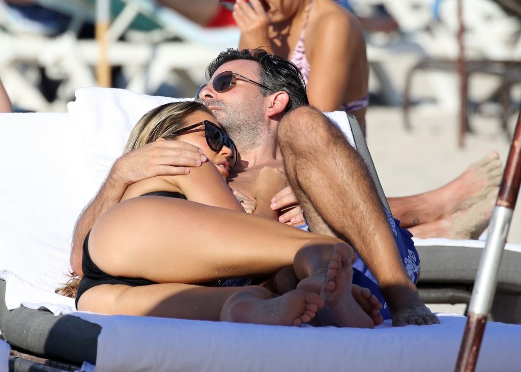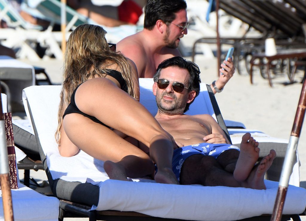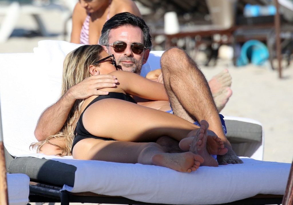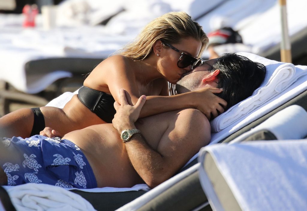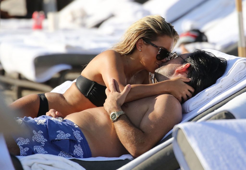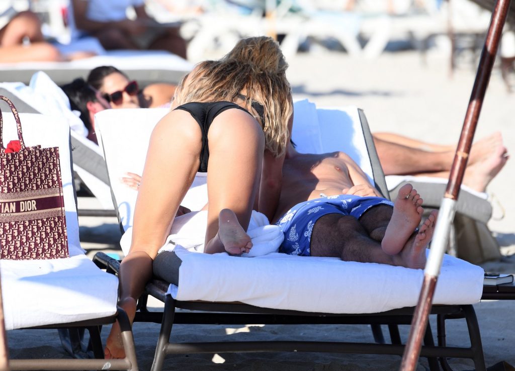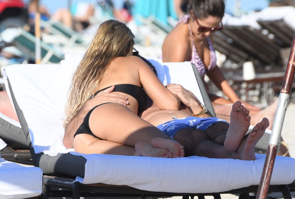 La celebridad holandesa Sylvie Meis (41) lleva un bikini negro y muestra un anillo de compromiso mientras besa a Niclas Castello en la playa de Miami, 30/11/2019.