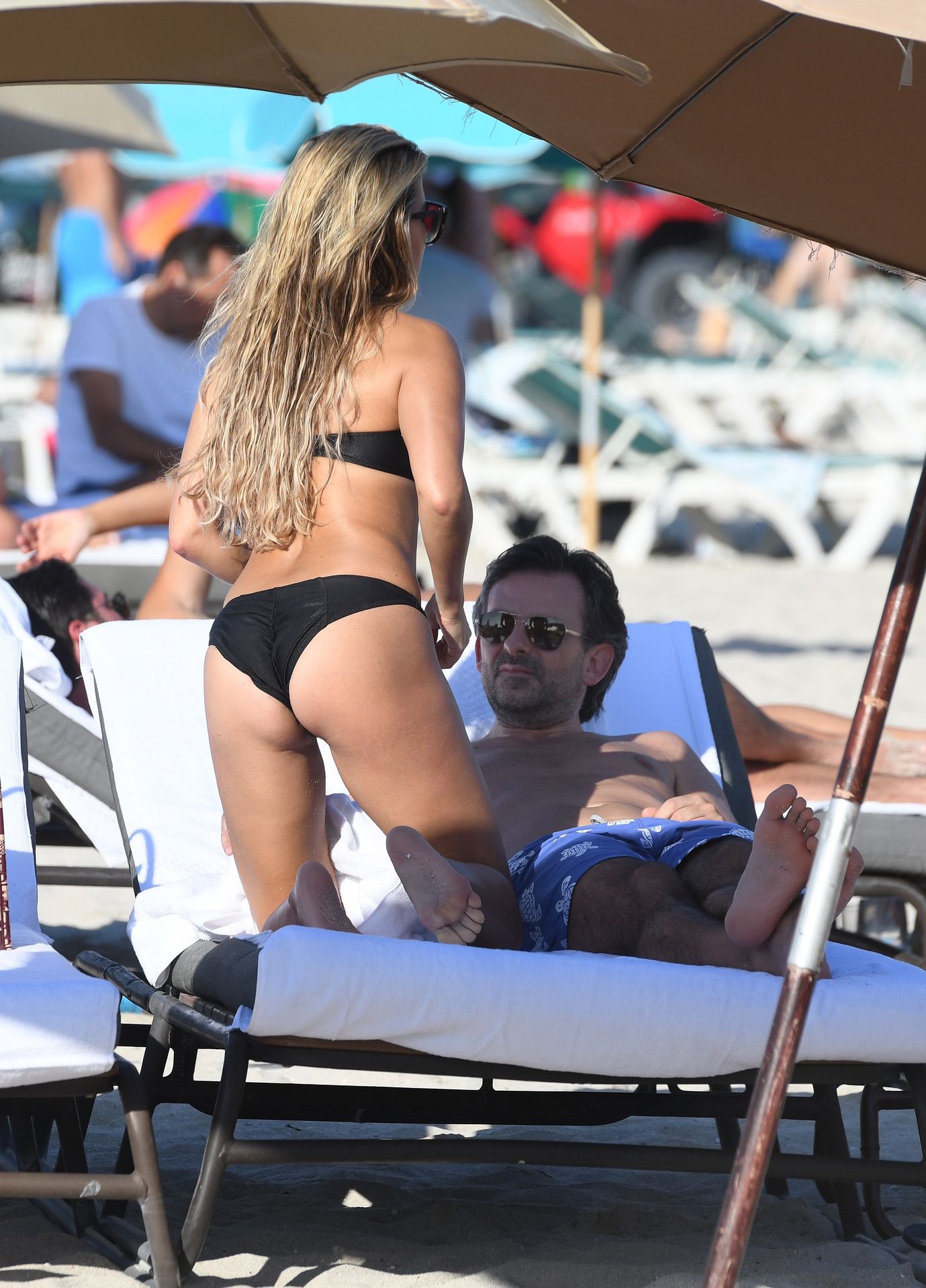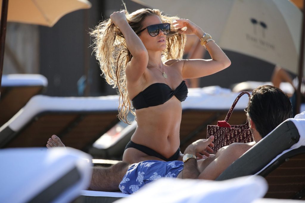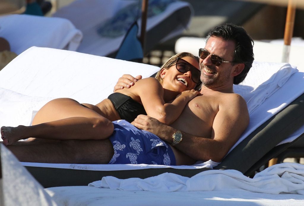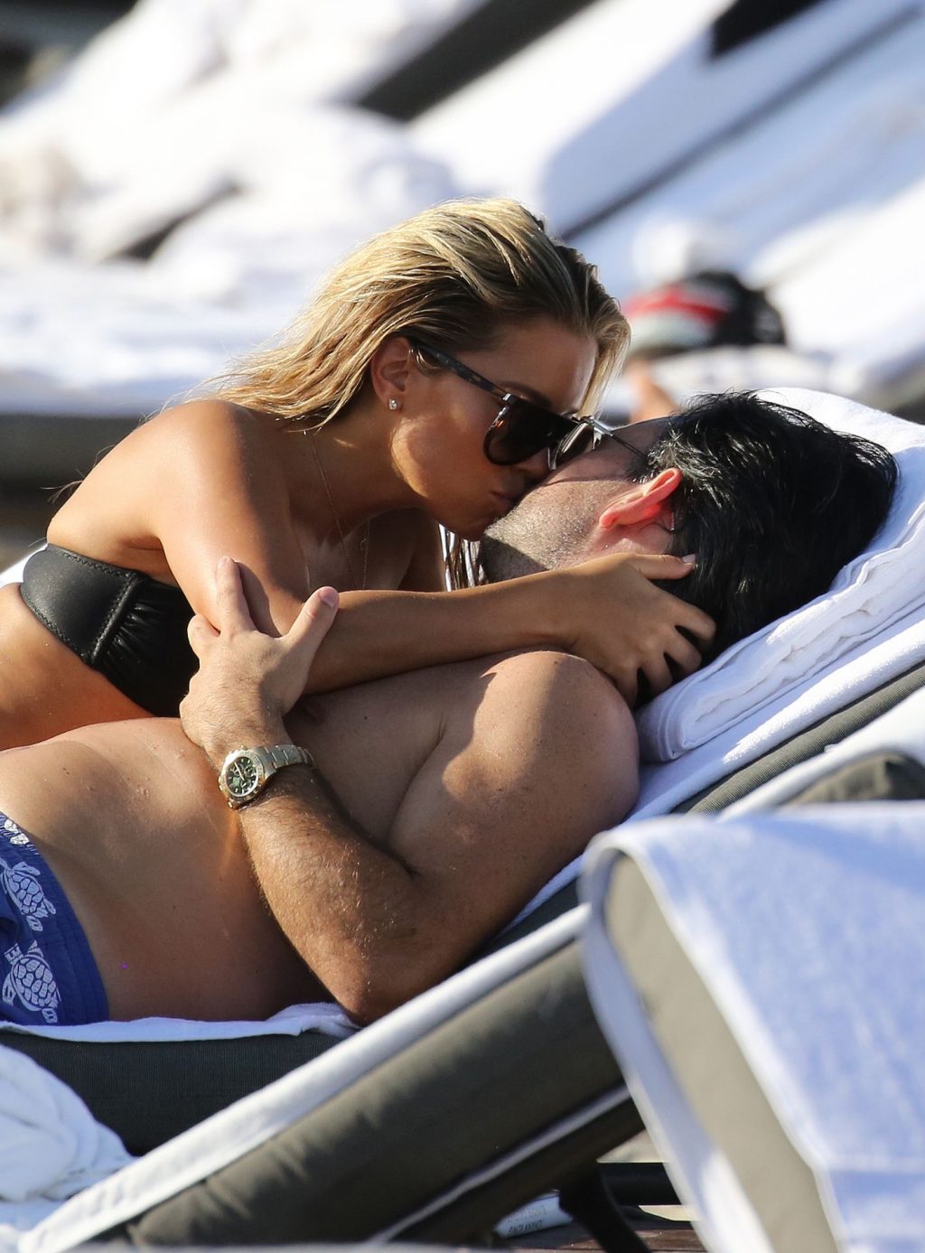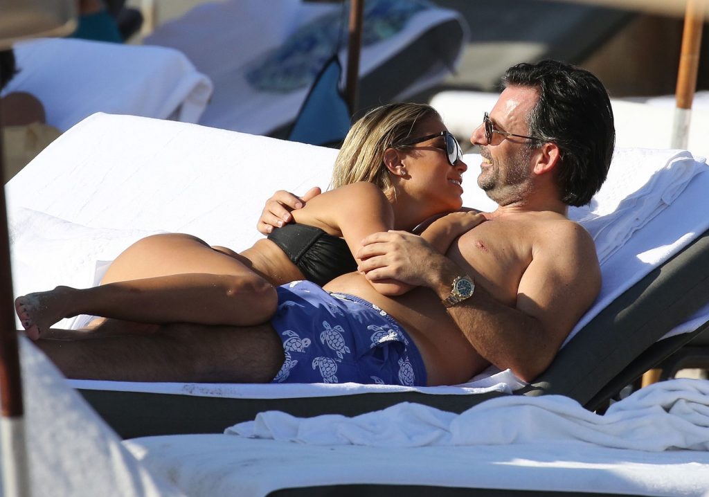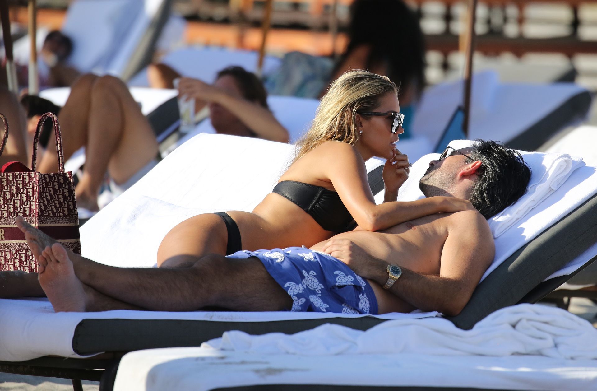 La celebridad holandesa Sylvie Meis (41) lleva un bikini negro y muestra un anillo de compromiso mientras besa a Niclas Castello en la playa de Miami, 30/11/2019.