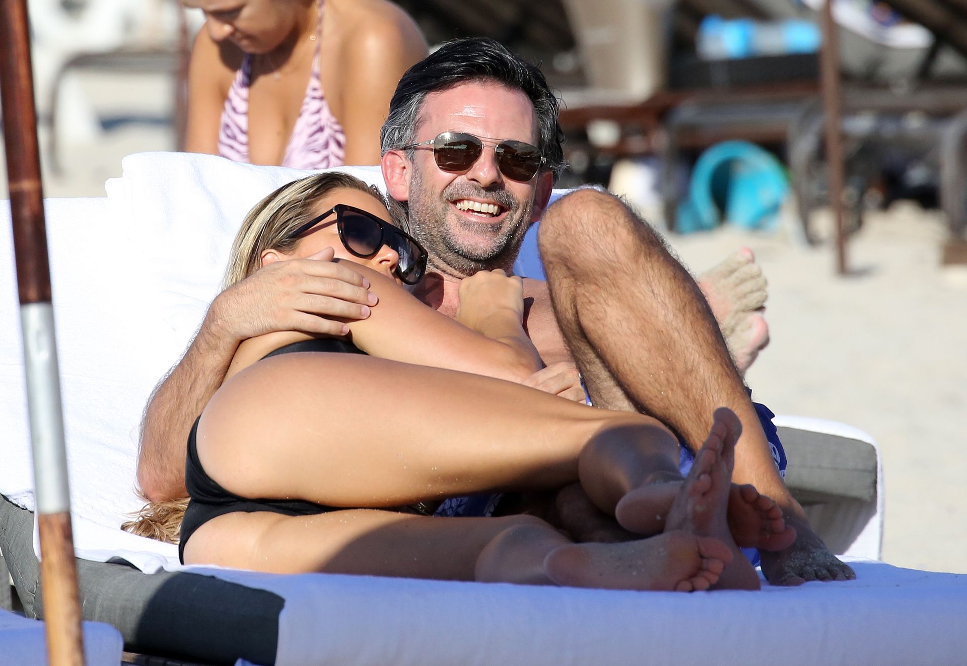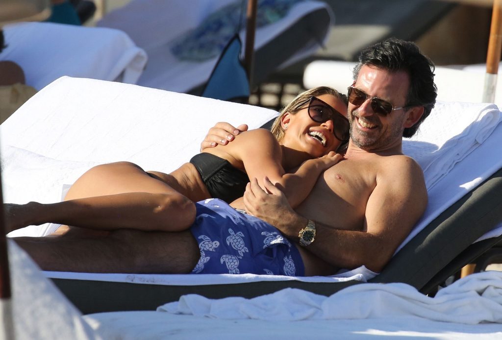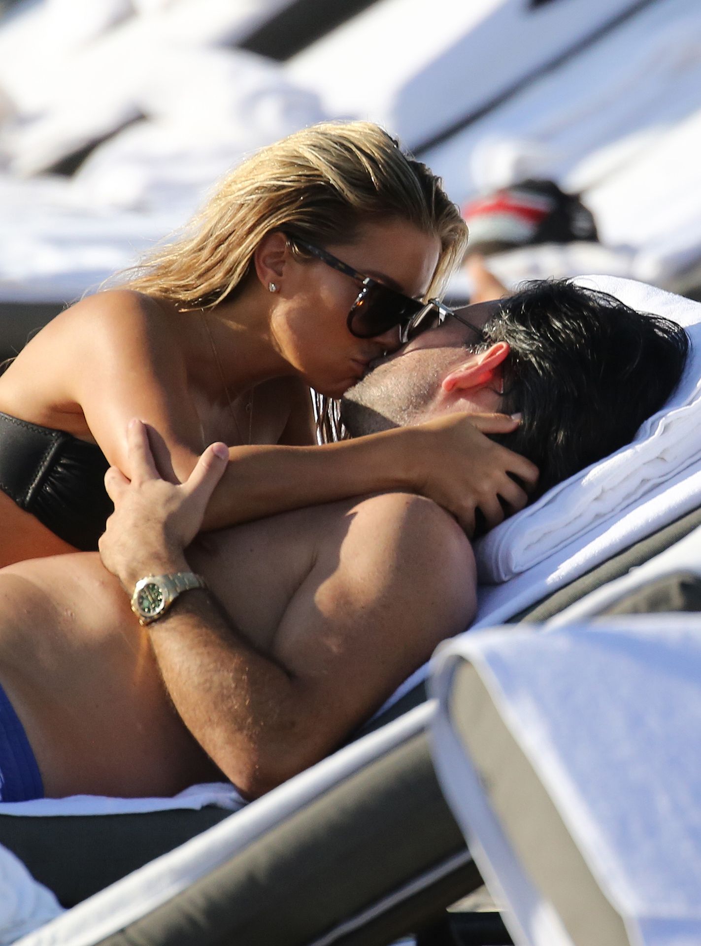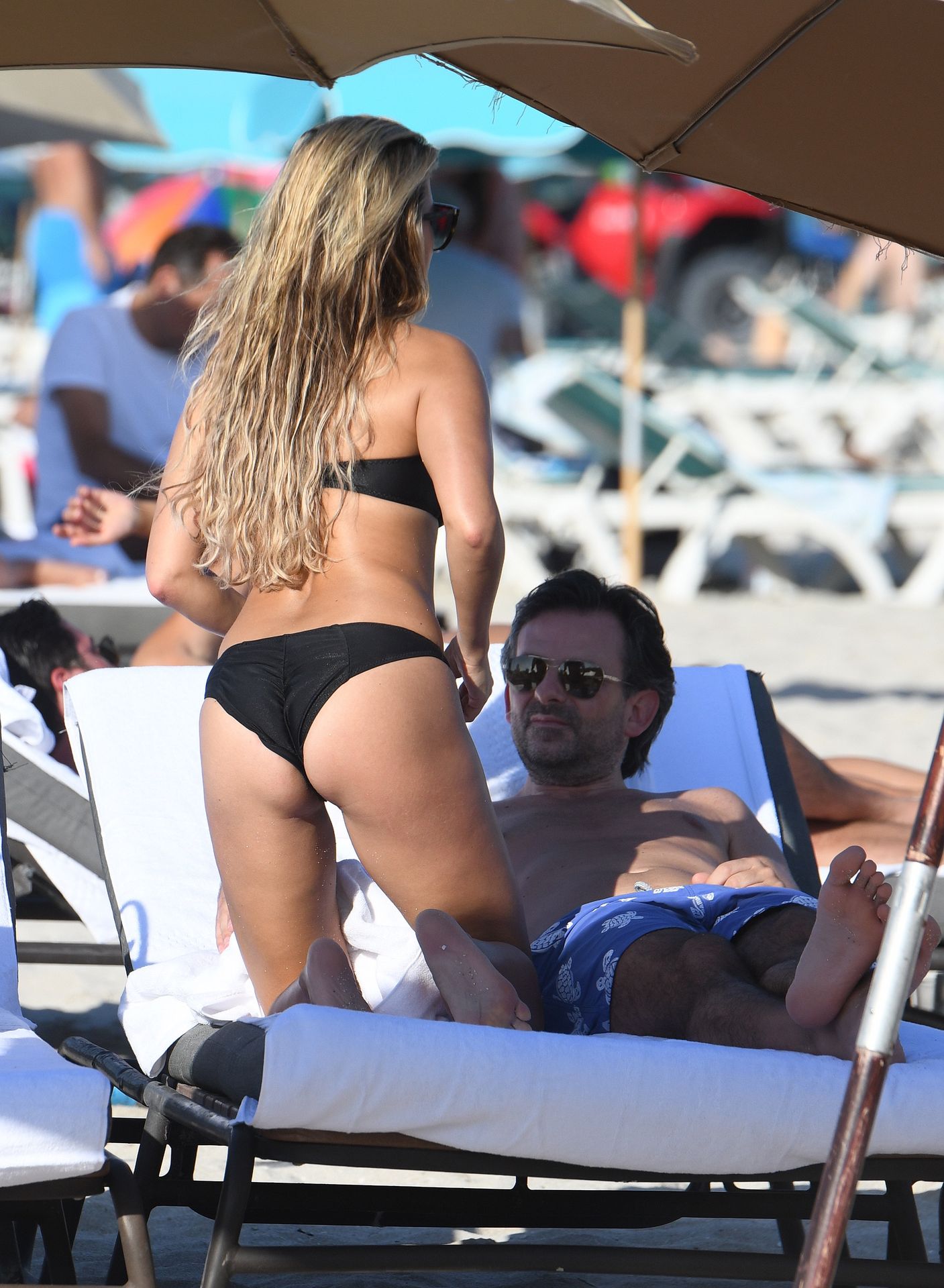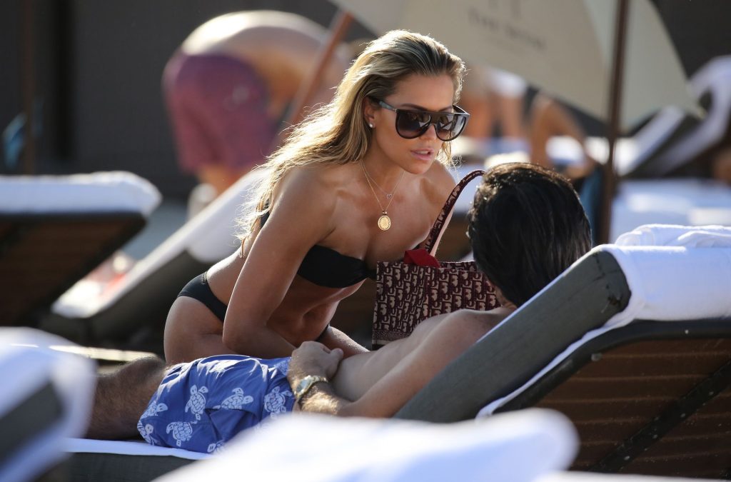La celebridad holandesa Sylvie Meis (41) lleva un bikini negro y muestra un anillo de compromiso mientras besa a Niclas Castello en la playa de Miami, 30/11/2019.