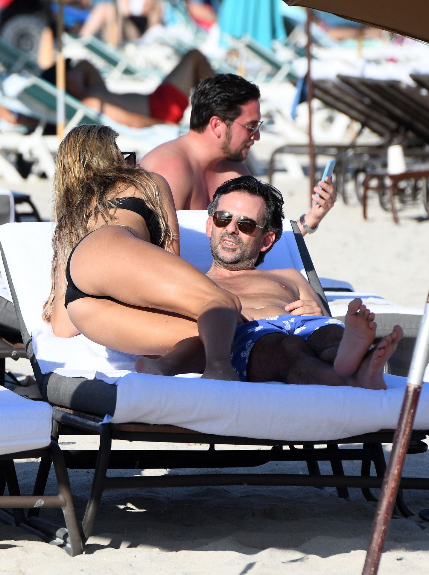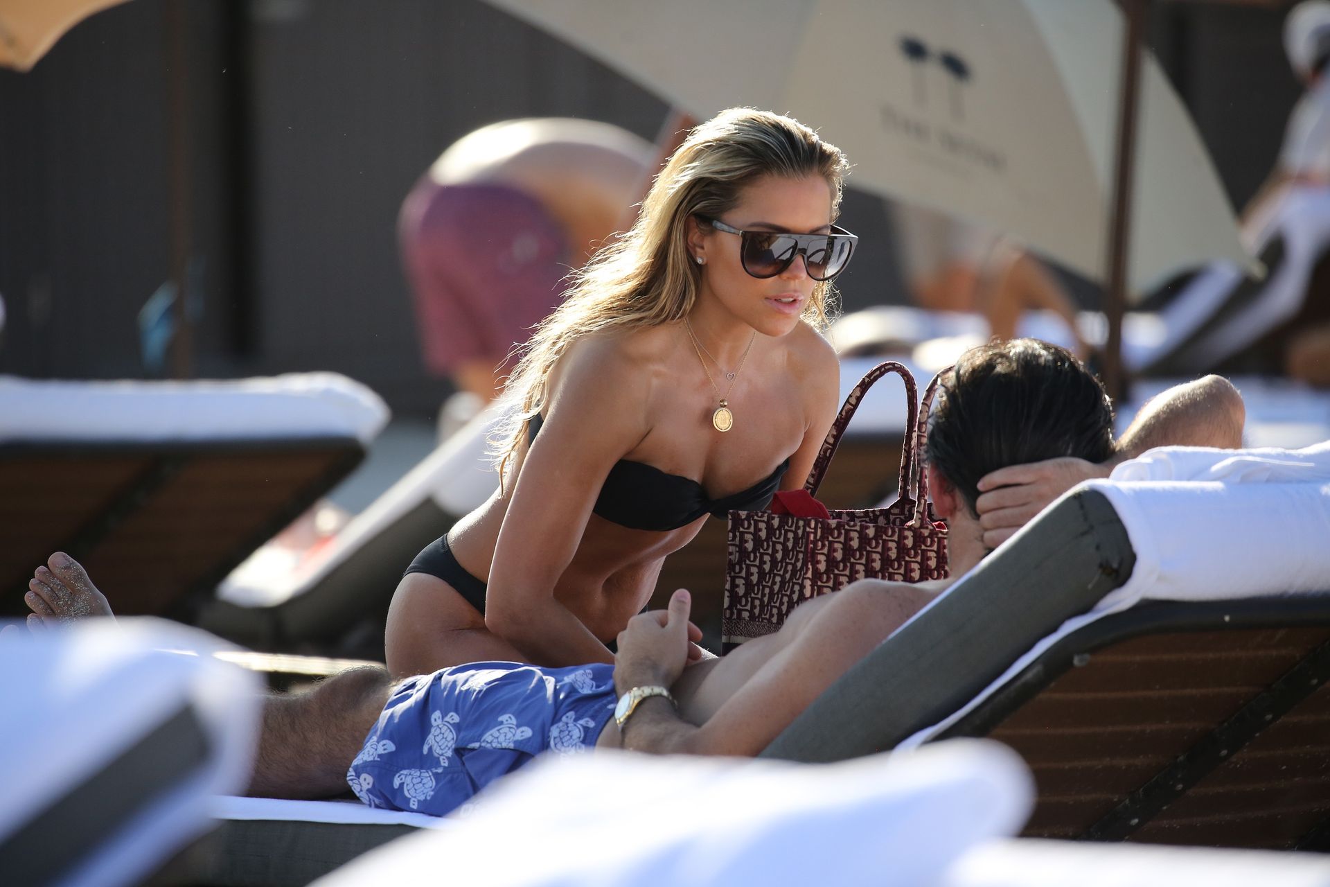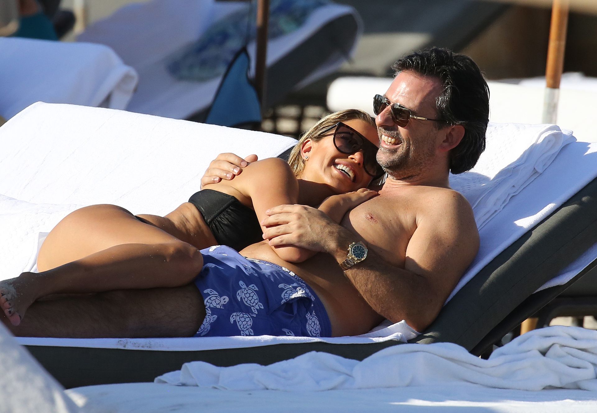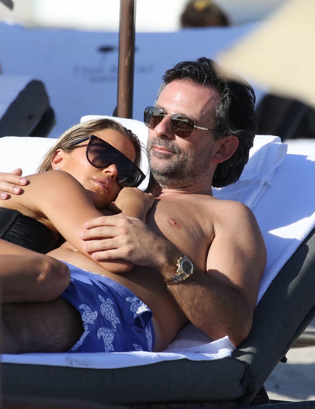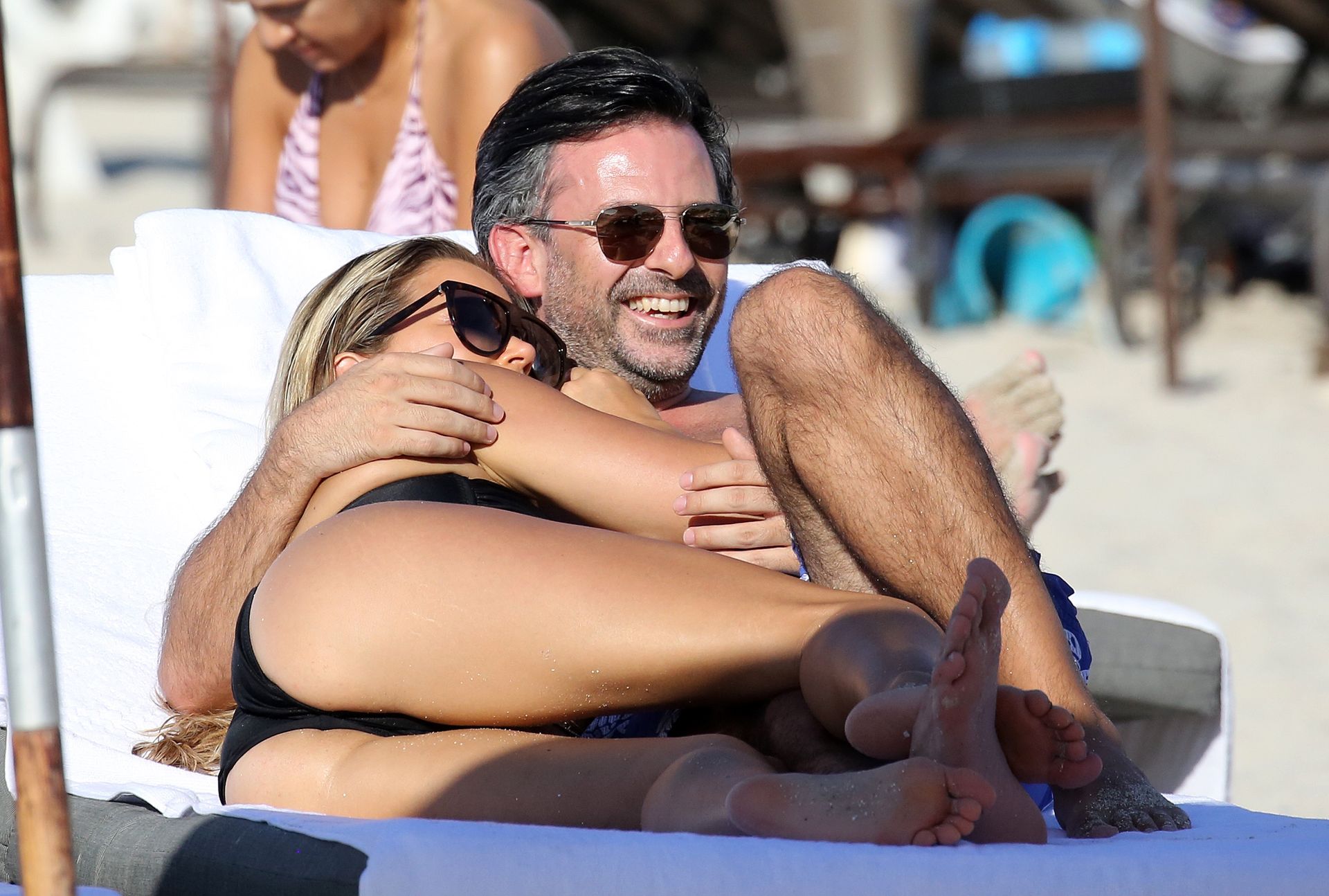 La celebridad holandesa Sylvie Meis (41) lleva un bikini negro y muestra un anillo de compromiso mientras besa a Niclas Castello en la playa de Miami, 30/11/2019.