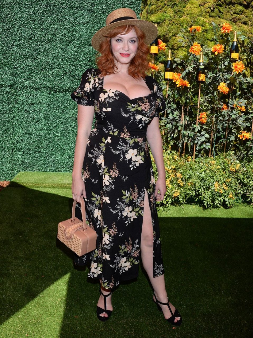 La actriz estadounidense de busto prominente Christina Hendricks llega al 10º Veuve Clicquot Polo Classic anual en Los Ángeles en el Parque Histórico Estatal Will Rogers en Pacific Palisades, 05/10/2019.