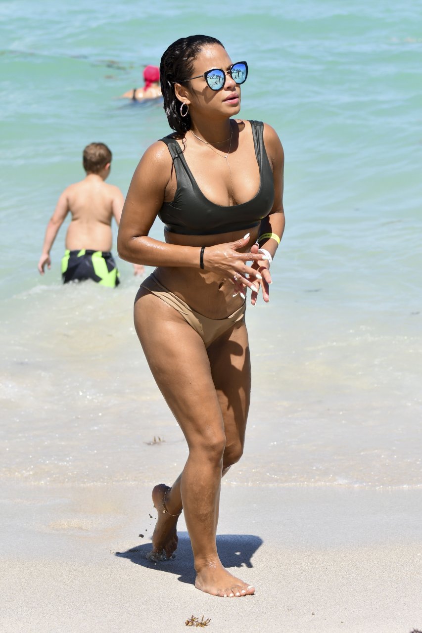 Christina Milian lleva un traje de baño colorido en su hotel en Miami, 16/07/2017. Christina Milian es una cantante, compositora y actriz estadounidense. Edad: 35.