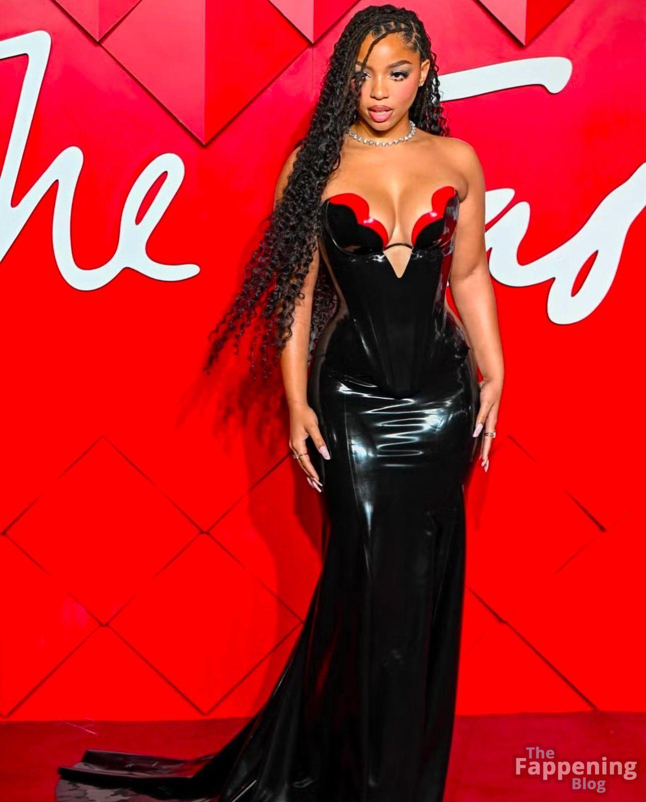 Chloe Bailey aparece en un atrevido vestido de cuero negro y rojo que resalta todas sus curvas y su escote.