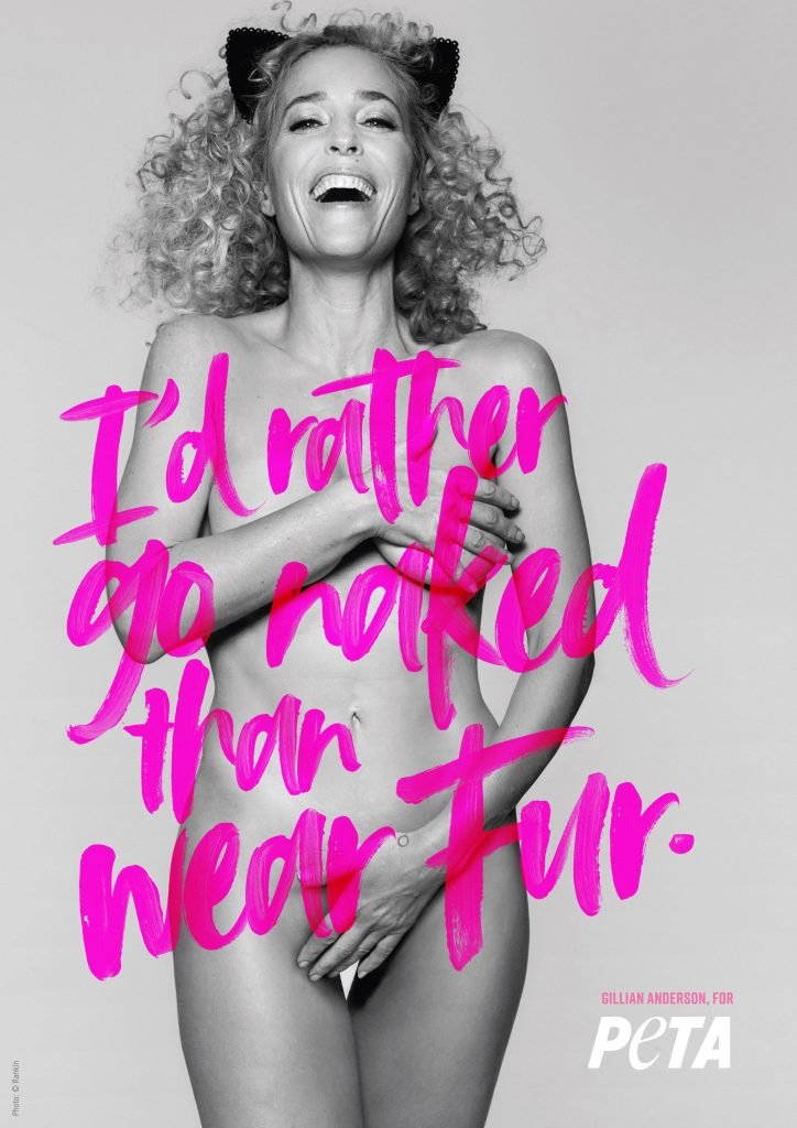Gillian Anderson posa para la nueva campaña de PETA (febrero de 2018). Gillian Anderson es una actriz angloamericana (Expediente X). Edad – 49 años.