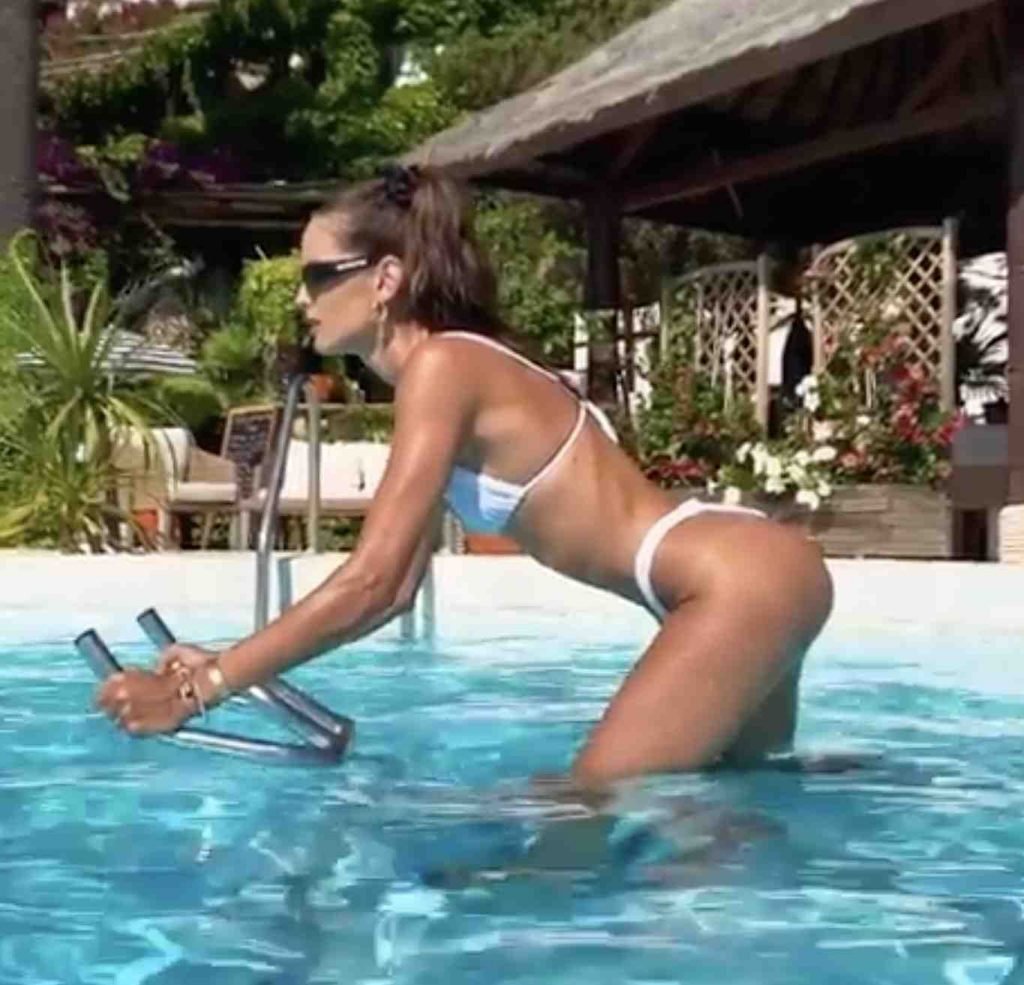 Model Izabel Goulart muestra su figura sexy con un bikini blanco mientras hace ejercicio en una bicicleta en una piscina, 27/07/2019.
