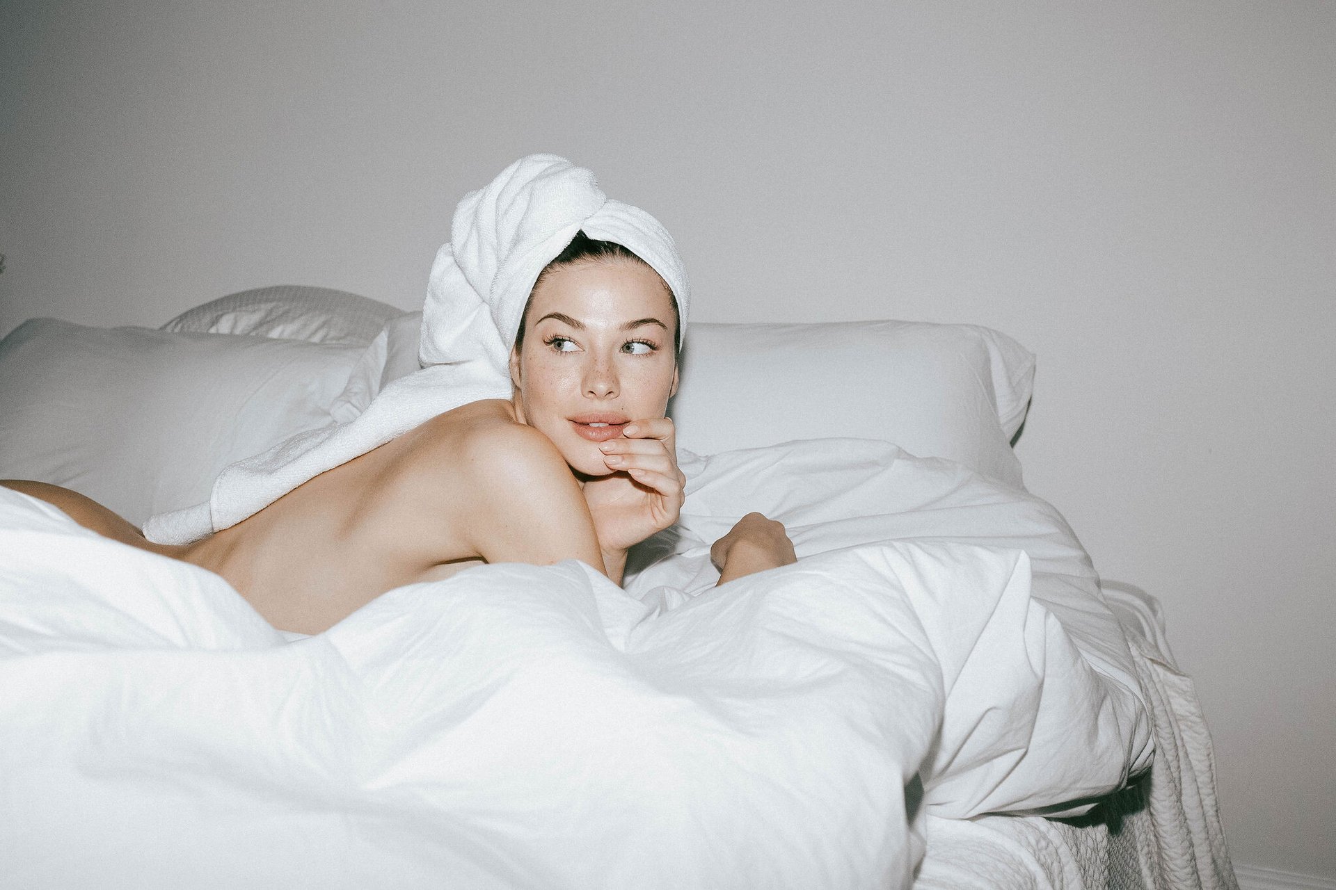 Fotos desnudas de la modelo americana Jenny Watwood por Brooke Hanmer (2019). La atractiva de 29 años fue fotografiada acostada en la cama completamente desnuda con una toalla en la cabeza y cubierta con una manta.