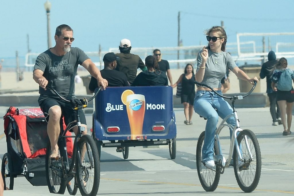 Brolin, de 51 años, fue sin camisa y llevaba pantalones cortos negros mientras tenía a su pequeño detrás de su bicicleta. Boyd, de 31 años, llevaba un top corto gris, jeans y Converse blancas.