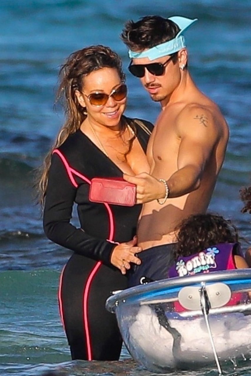 Mariah Carey (48) y Bryan Tanaka (35) se toman algunas selfies mientras disfrutan del cálido sol en familia en la Laguna Grand Cul de Sac en St. Barth, con los dos hijos de Mariah, Moroccan y Monroe, 01/03/2019. Mariah aparece sin maquillaje con un traje de neopreno negro mientras se relaja en un barco con fondo transparente.
