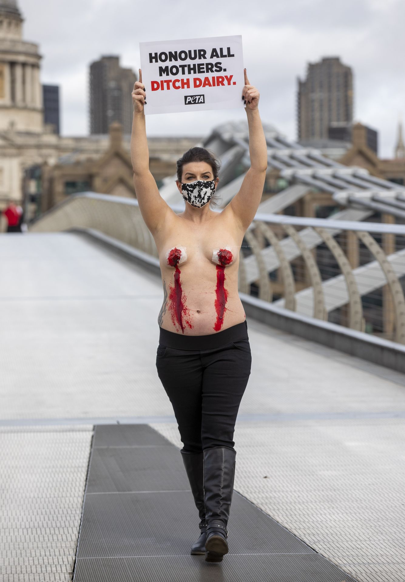 La futura madre Daniella Wood con pezones “sangrantes” participa en una sesión fotográfica de PETA en el Puente del Milenio de Londres para protestar contra la industria láctea en el Día de la Madre en Londres (2021).