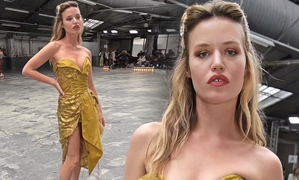 La modelo Frida Aasen exhibe su figura delgada y sexy y sus pequeños pechos desnudos, vistiendo un top transparente mientras camina por la pasarela en el Espectáculo Etam Live durante la Semana de la Moda de París, 10/04/2021.