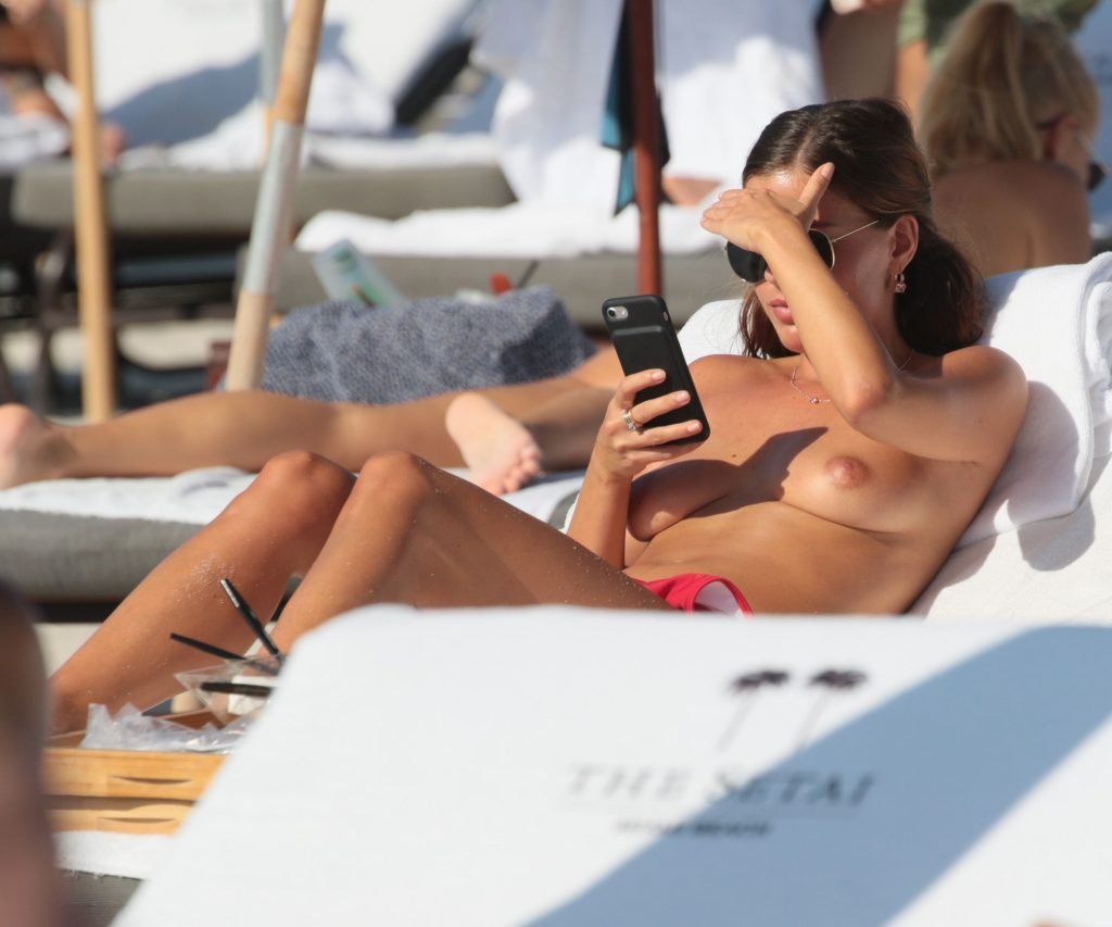La modelo checa Petra Kladivova aparece desnuda de pecho en la playa de Miami Beach, 12/09/2017. Petra disfrutó de un día en el hotel The Setai con su perro. Comió una ensalada mientras trabajaba en su bronceado, cubriéndose a veces con un traje de baño rojo de una pieza.