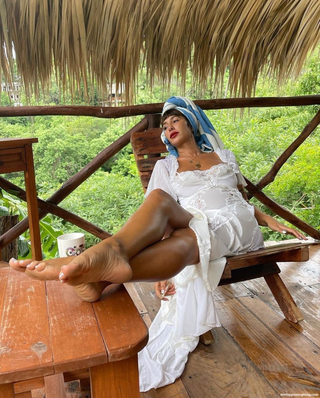 Actriz y estrella de The Fappening Jackie Cruz muestra sus pies y pechos, posando con un vestido blanco en una nueva sesión de fotos en redes sociales, 07/10/2021.
