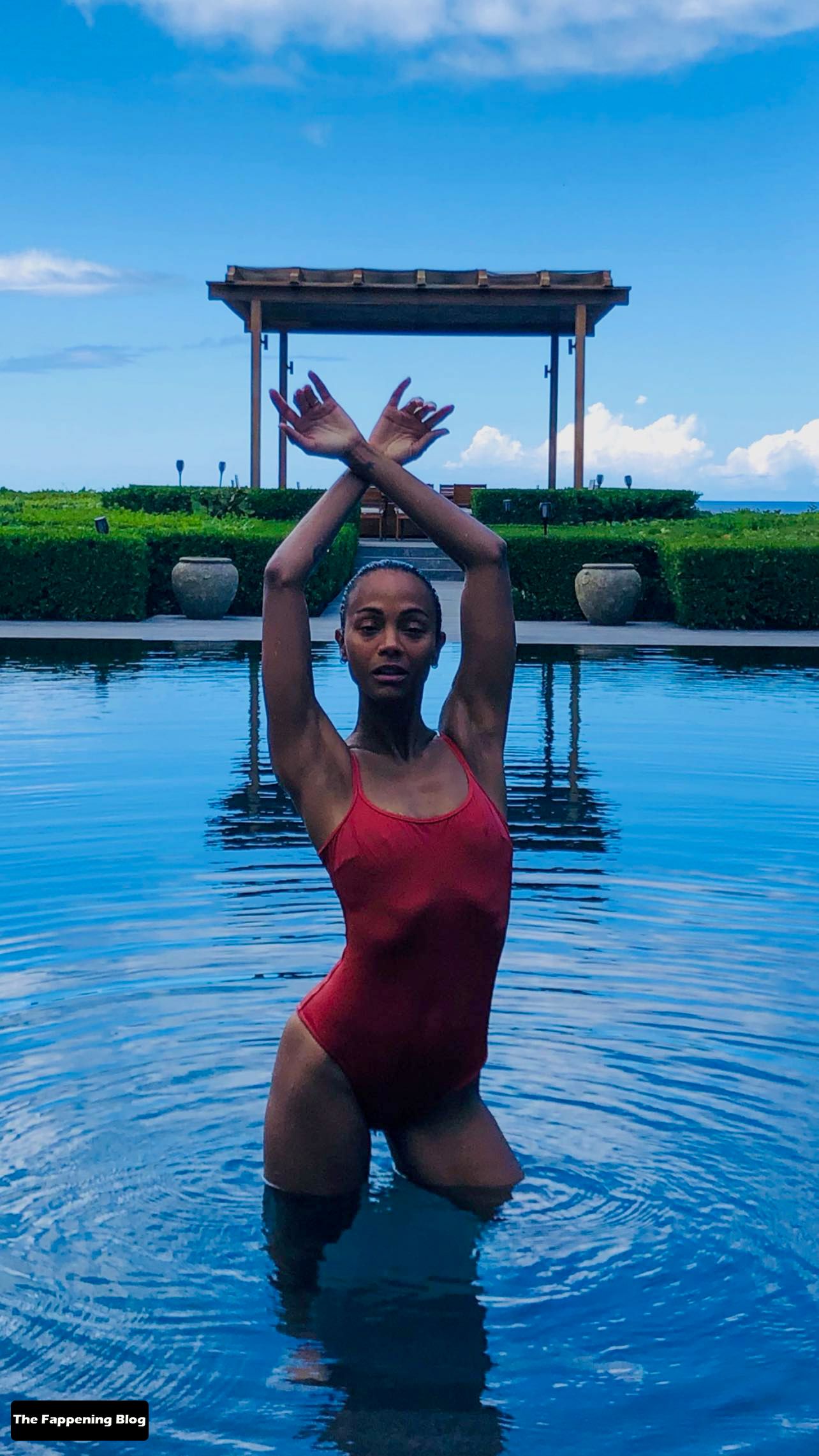La actriz Zoe Saldana muestra su figura esbelta y sexy y sus curvas en un bikini rojo, disfrutando de sus vacaciones (2021).