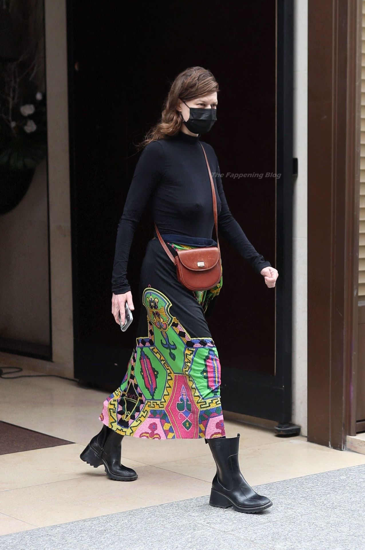La actriz estadounidense Milla Jovovich muestra estilo al salir del Hotel Mandarin. Llevaba puesta su mascarilla y una falda multicolor con botas negras durante la semana de la moda en París, 05/03/2021.