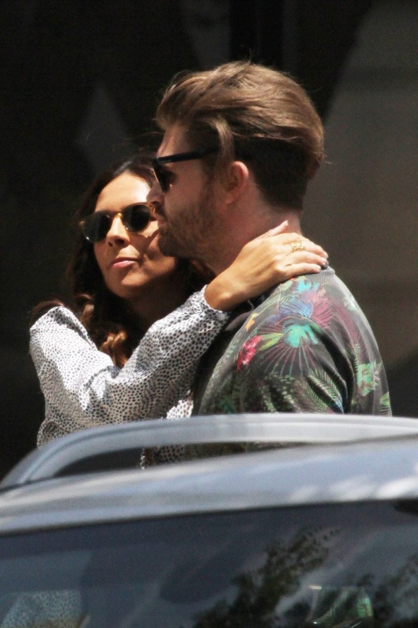 La reportera de entretenimiento y actriz Terri Seymour (47) y su novio de mucho tiempo Clark Mallon se muestran cariñosos durante su cita para almorzar en el lugar de moda para celebridades, Joan’s on Third en Studio City, 08/07/2019.