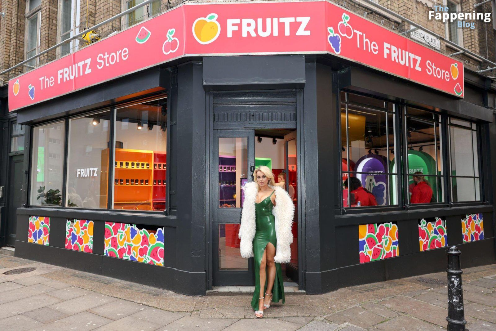 El impresionante look de Tallia Storm en el lanzamiento de Fruitz Store en Londres, con su escote y piernas reveladores que roban el espectáculo, es algo que no querrás perderte.