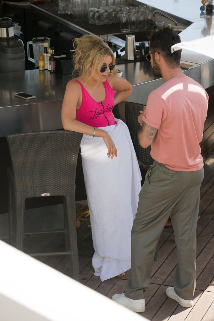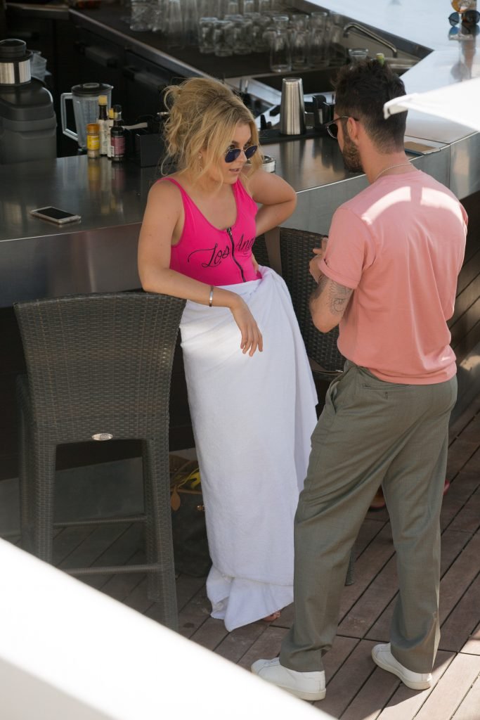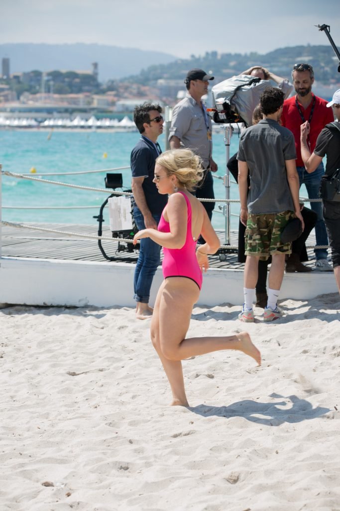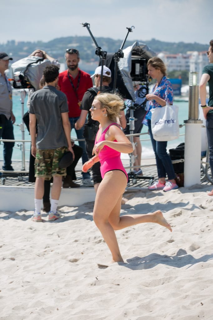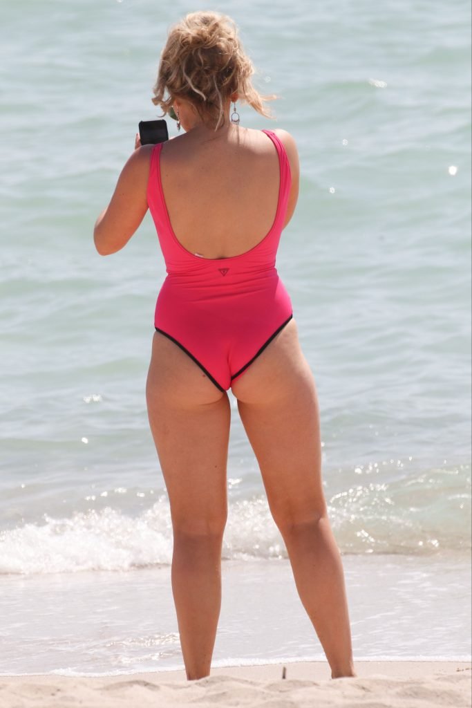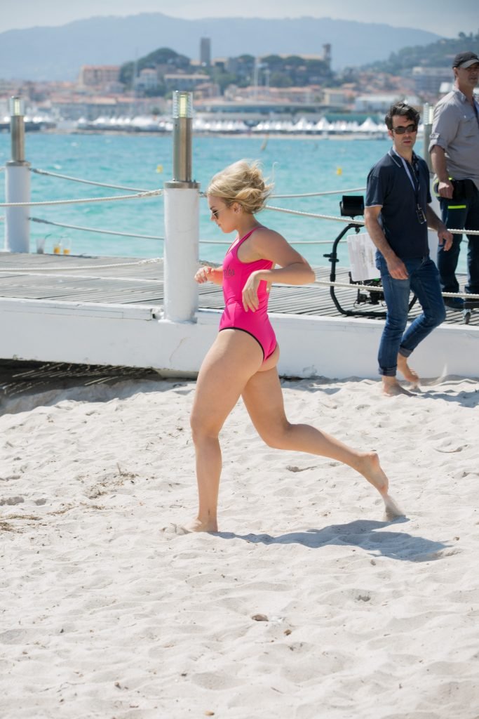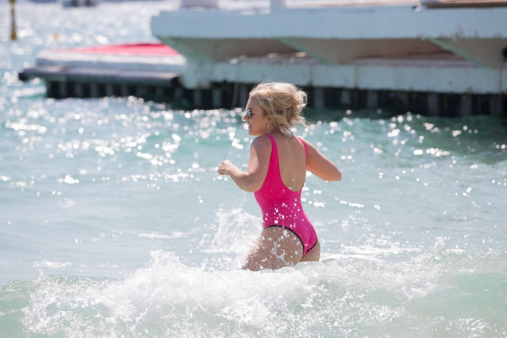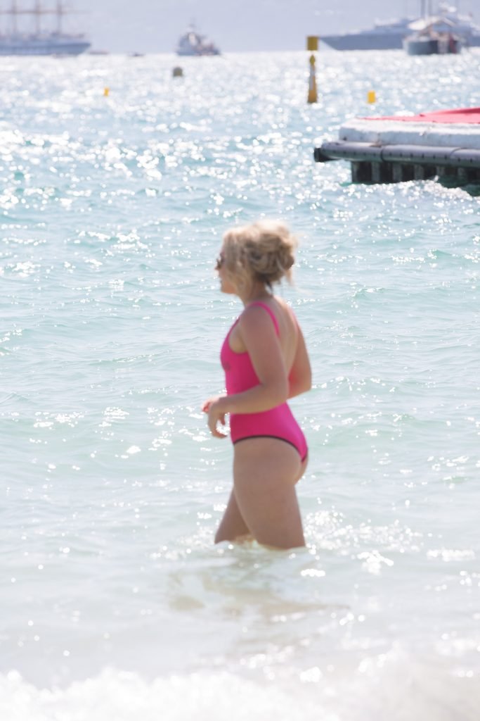Tallia Storm disfruta de un día soleado con un traje de baño de una pieza ‘Los Angeles’ de neón rosa en la playa de Cannes, 12/05/2018. Tallia Storm es una cantante y estrella de reality TV de Glasgow, Escocia.