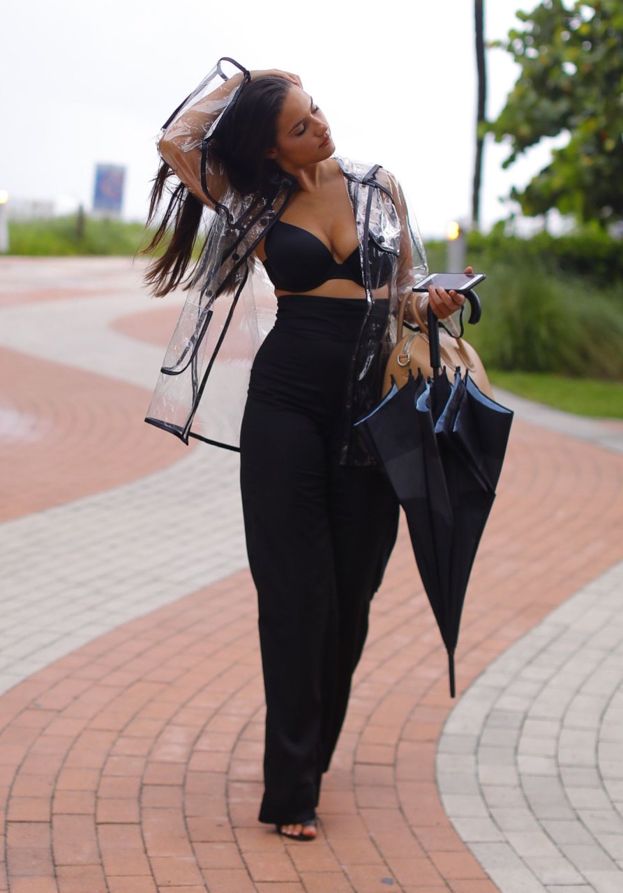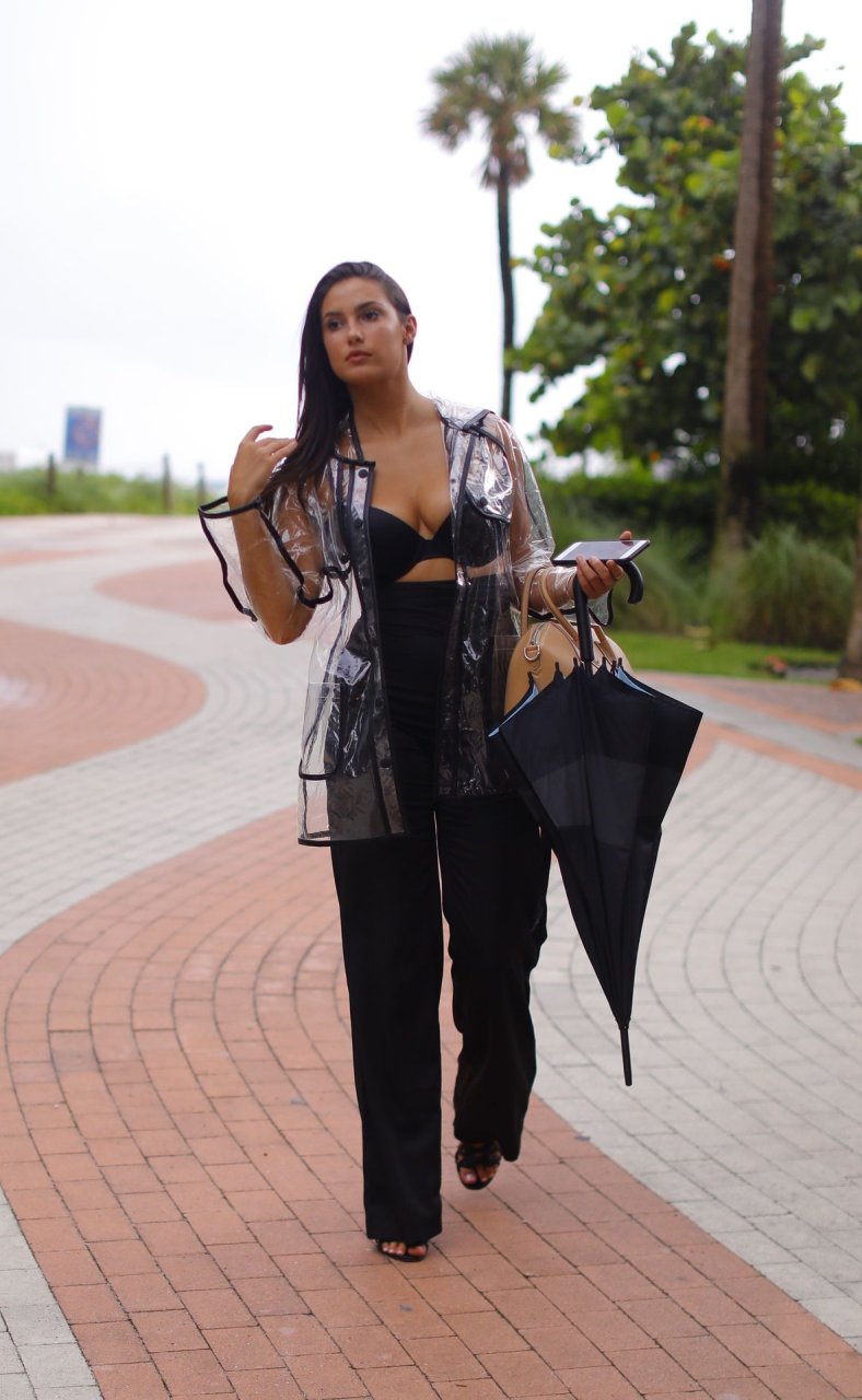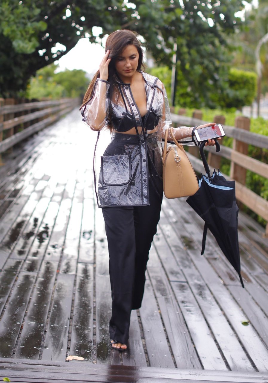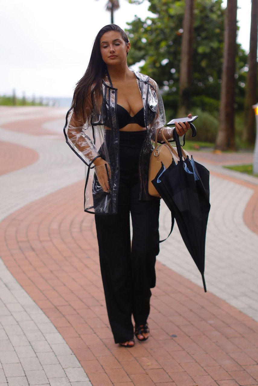 La modelo francesa Tao Wickrath deslumbra mientras camina bajo la lluvia con un impermeable transparente y un sujetador debajo, disfrutando de un paseo por la playa y un Starbucks en Miami en un día lluvioso, 25/08/2018.
