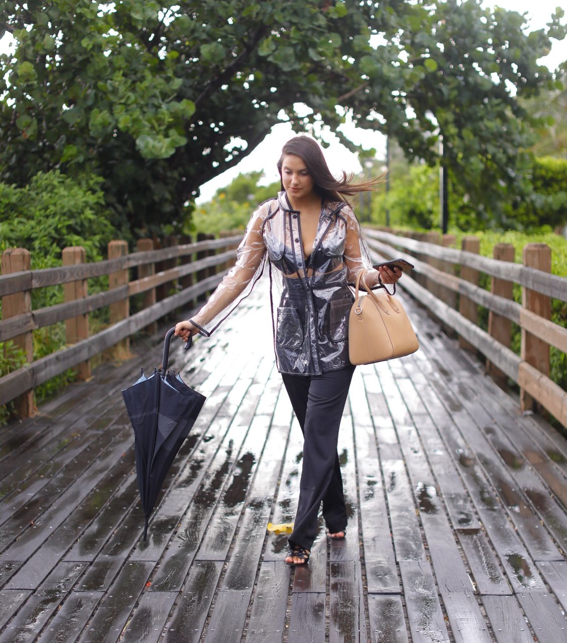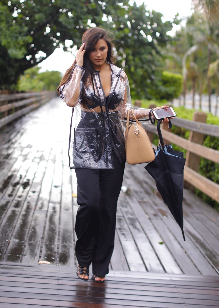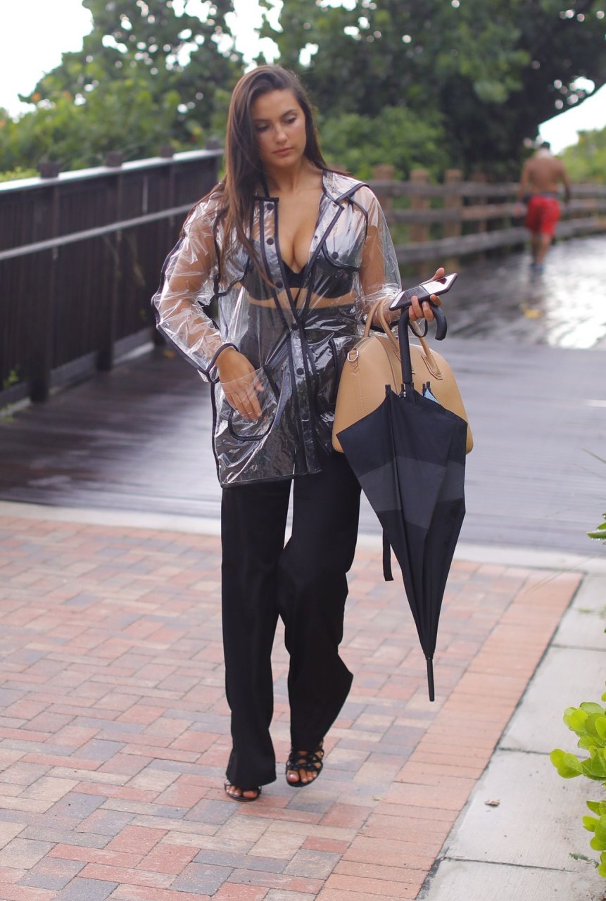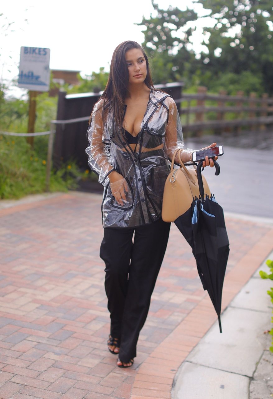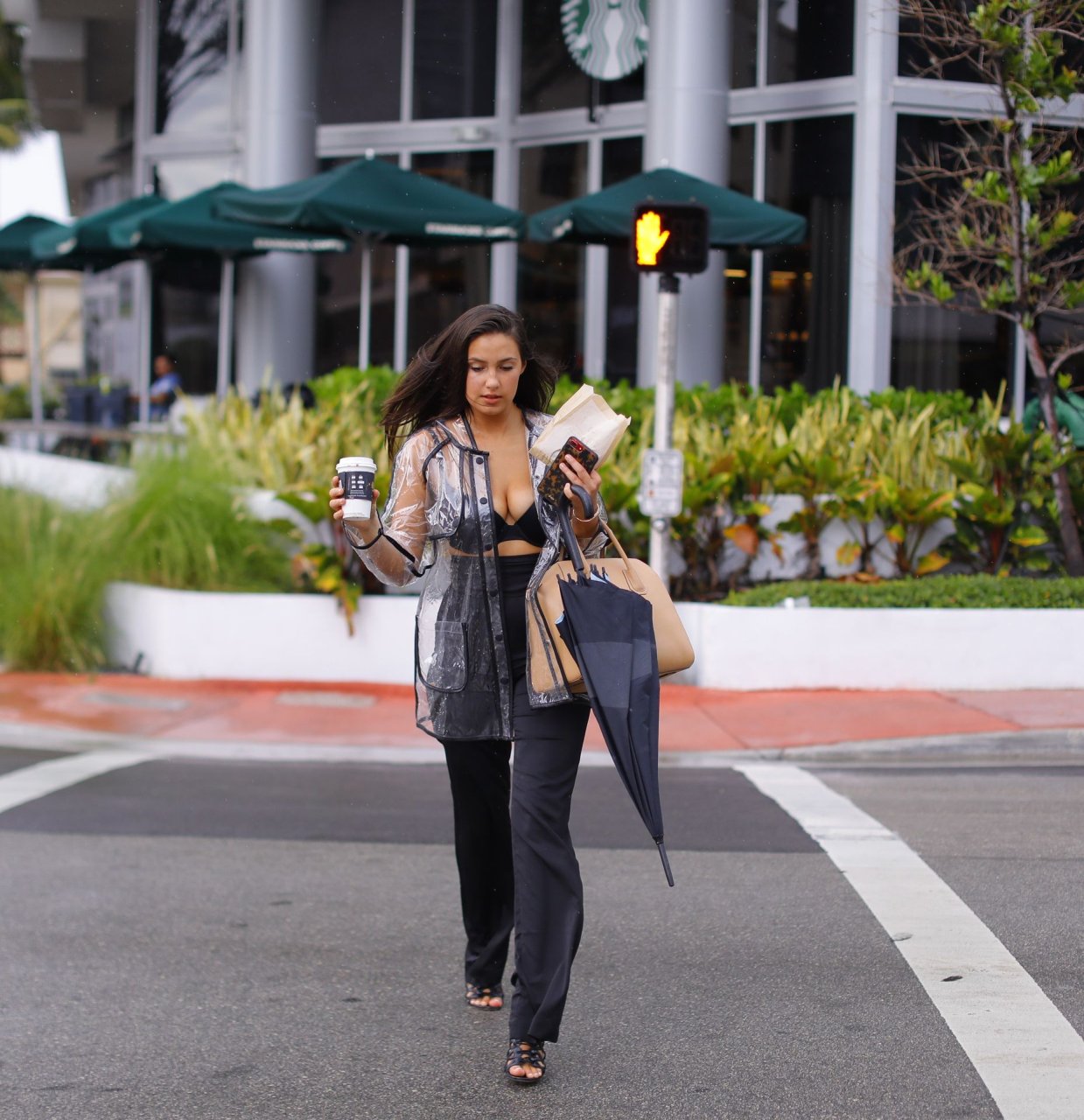 La modelo francesa Tao Wickrath deslumbra mientras camina bajo la lluvia con un impermeable transparente y un sujetador debajo, disfrutando de un paseo por la playa y un Starbucks en Miami en un día lluvioso, 25/08/2018.