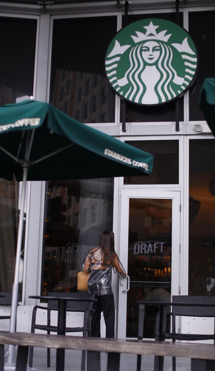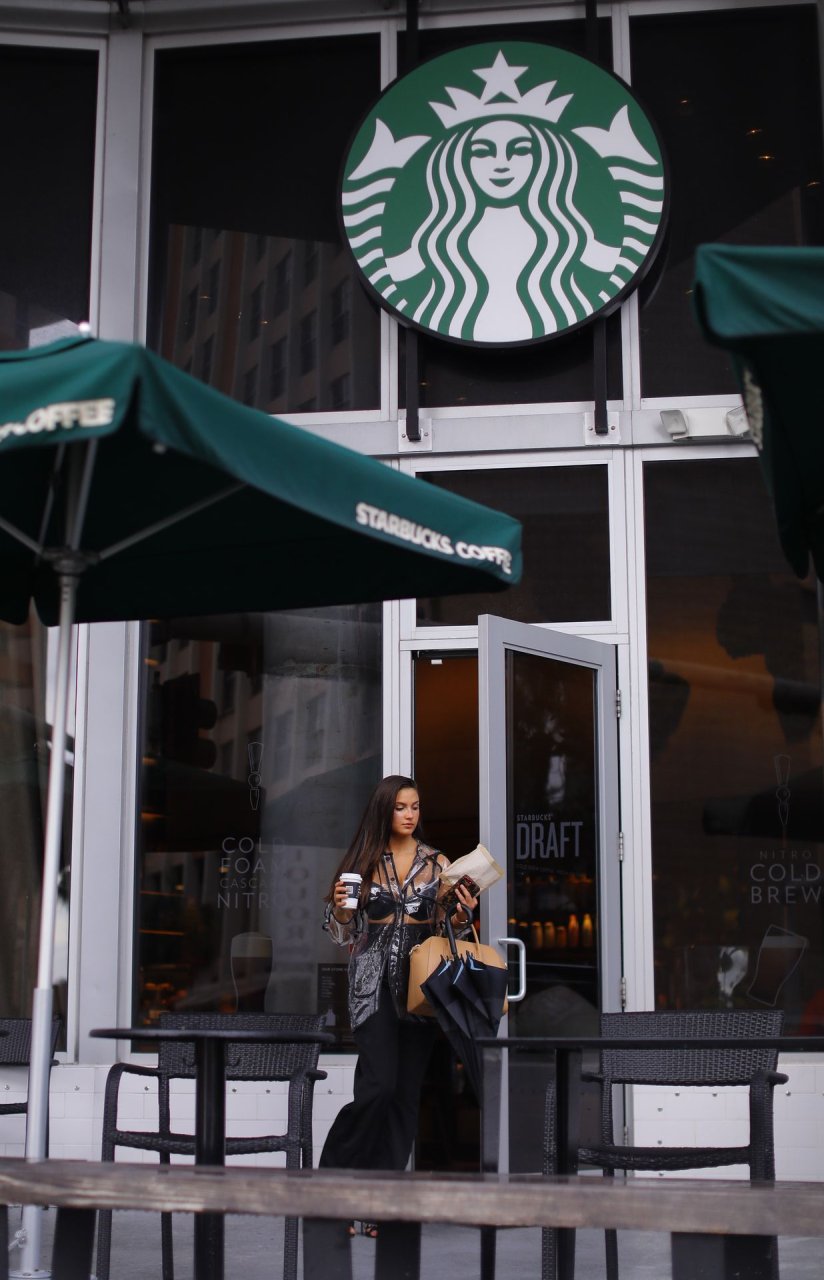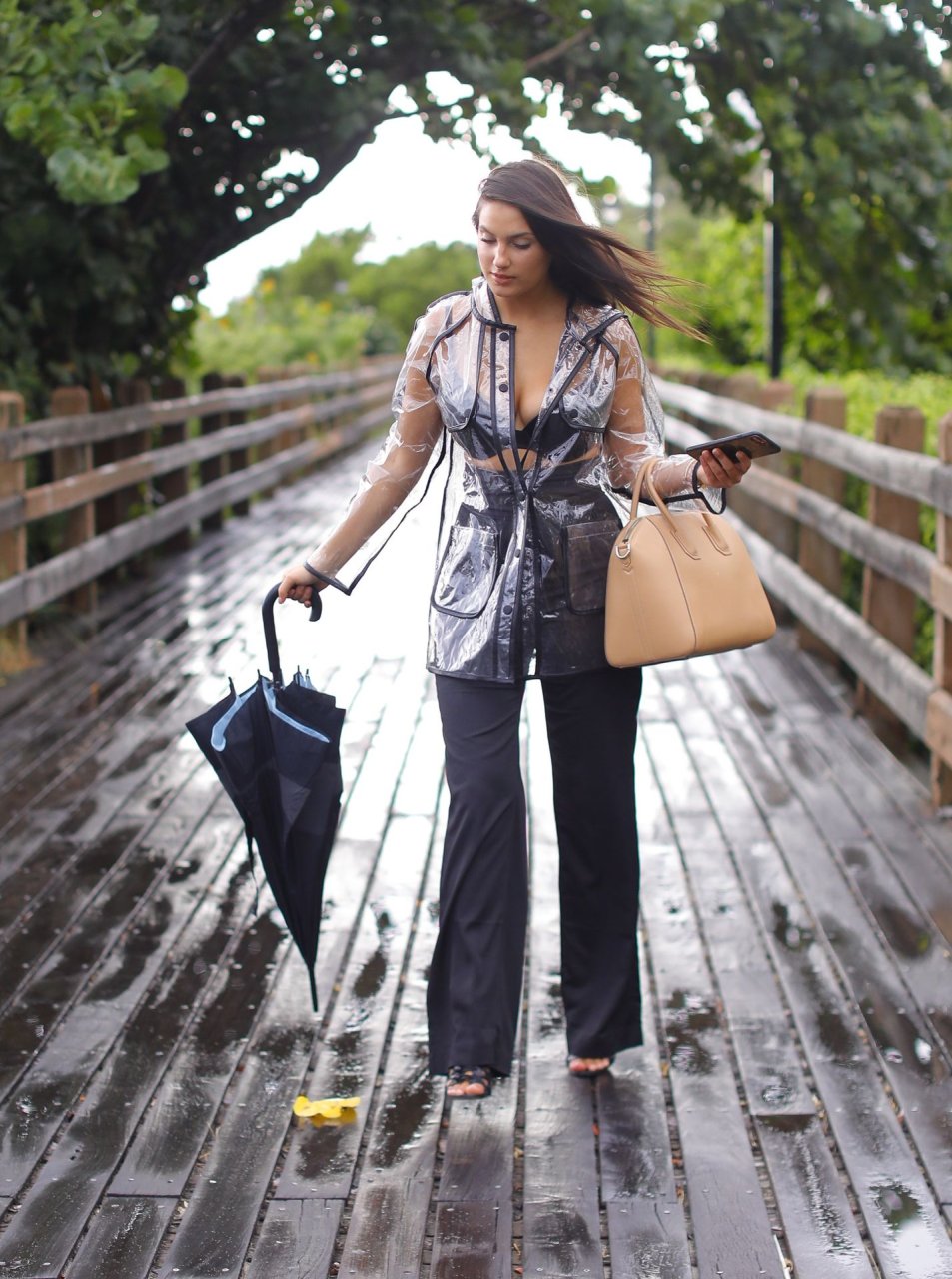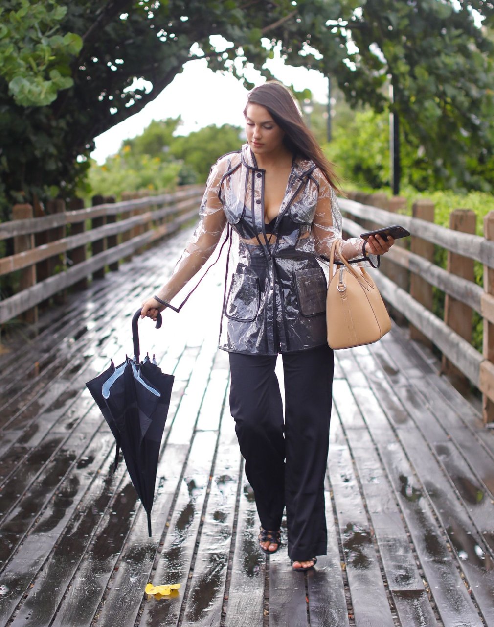 La modelo francesa Tao Wickrath deslumbra mientras camina bajo la lluvia con un impermeable transparente y un sujetador debajo, disfrutando de un paseo por la playa y un Starbucks en Miami en un día lluvioso, 25/08/2018.