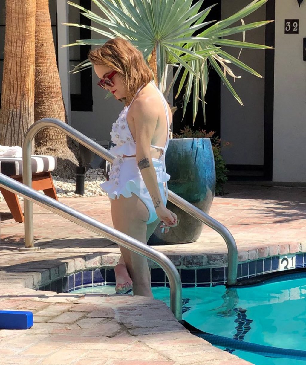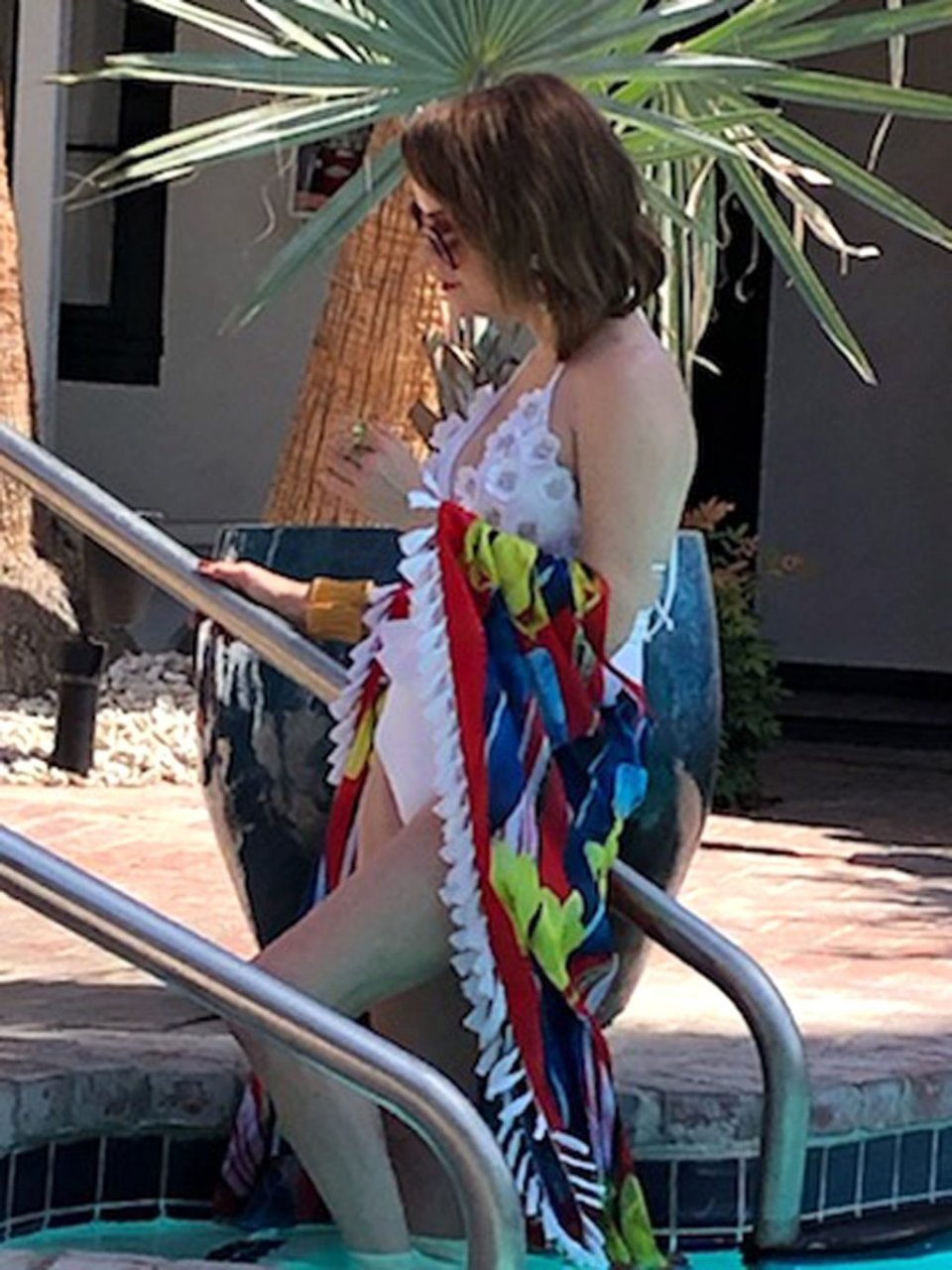 La estrella de “Orange is the New Black”, Taryn Manning, presume su cuerpo en bikini con un traje de baño blanco vintage mientras realiza una mini sesión de fotos con amigos junto a una piscina en Palm Springs, 18/05/2019.