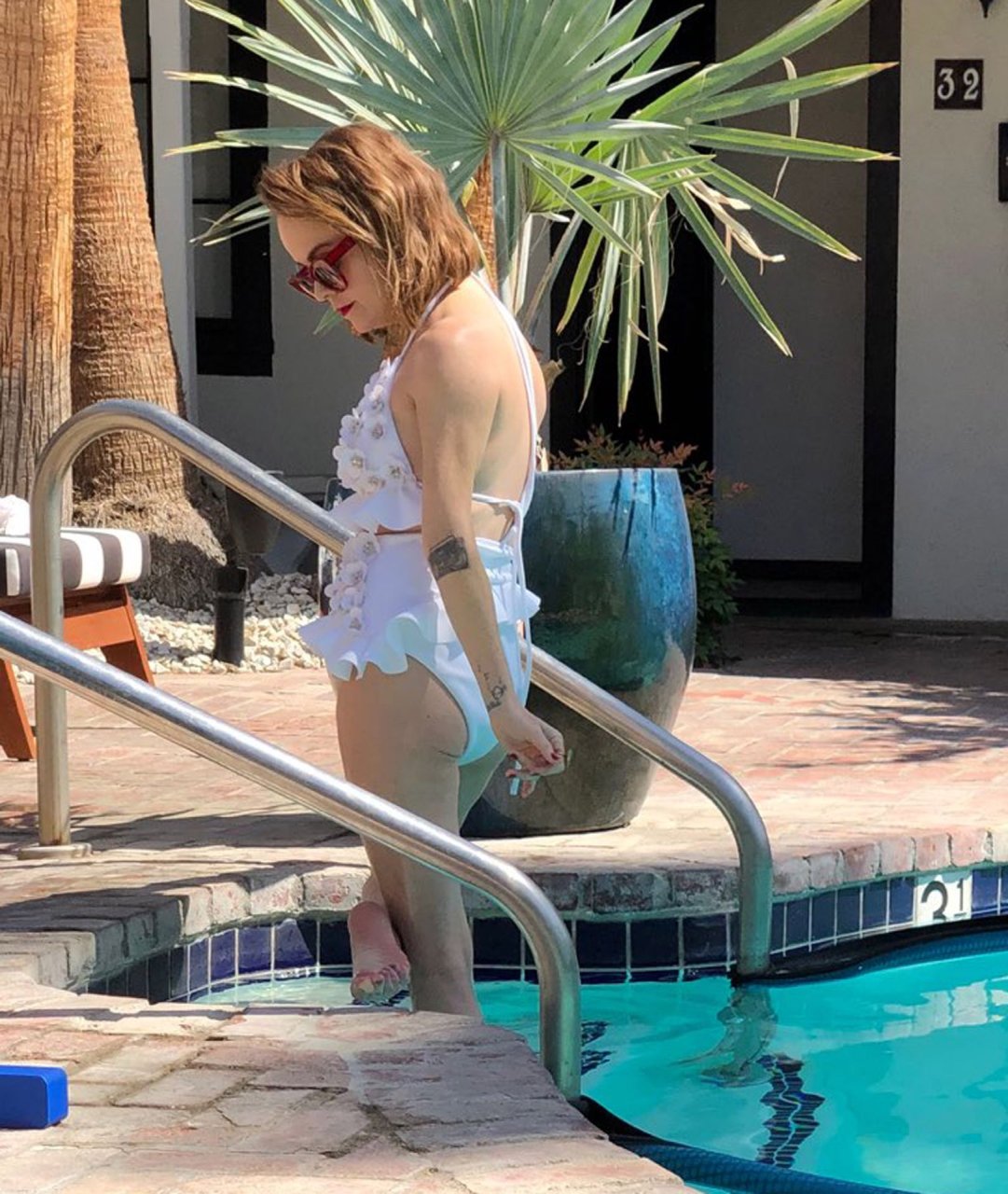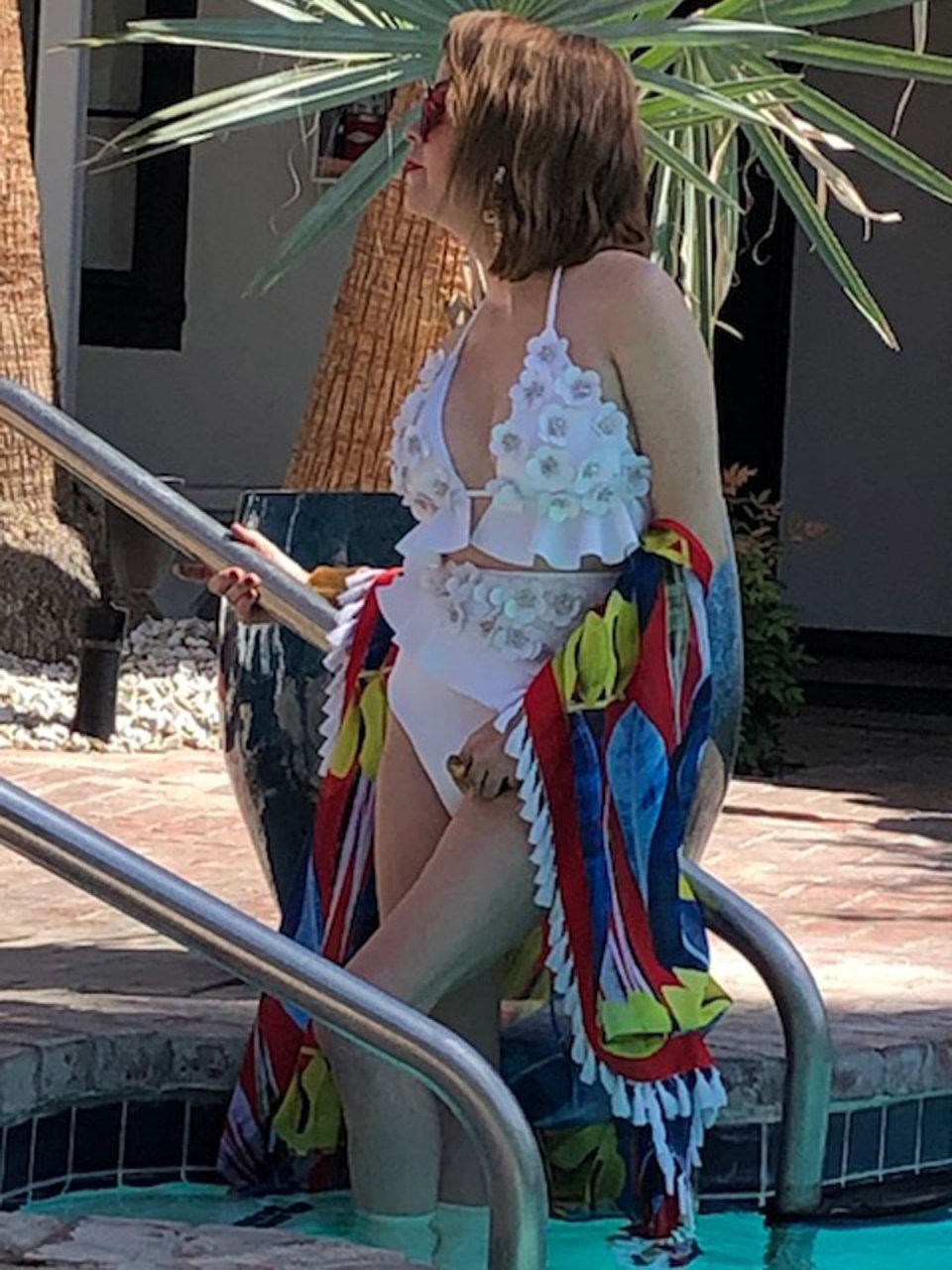La estrella de “Orange is the New Black”, Taryn Manning, presume su cuerpo en bikini con un traje de baño blanco vintage mientras realiza una mini sesión de fotos con amigos junto a una piscina en Palm Springs, 18/05/2019.