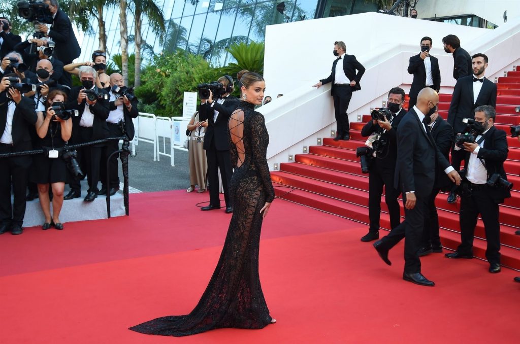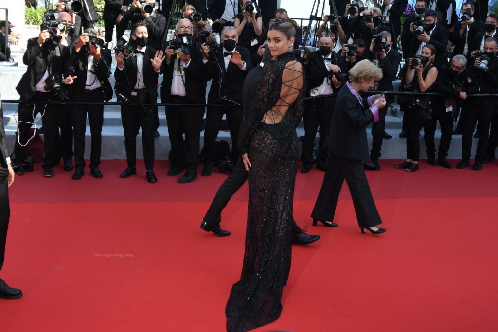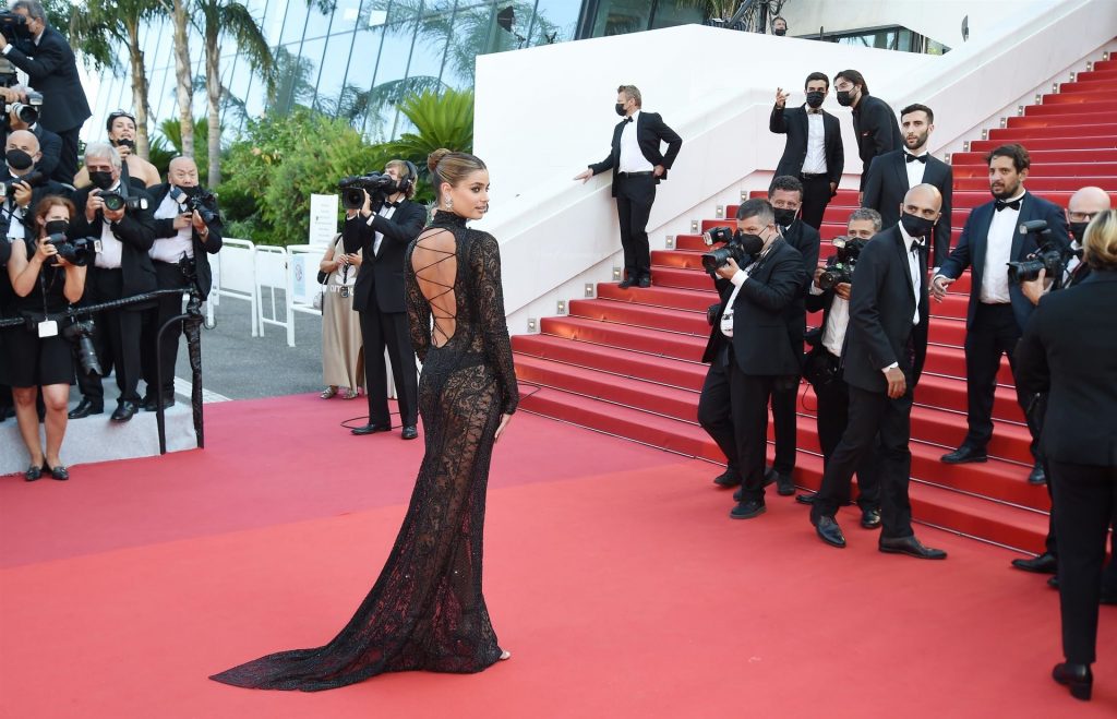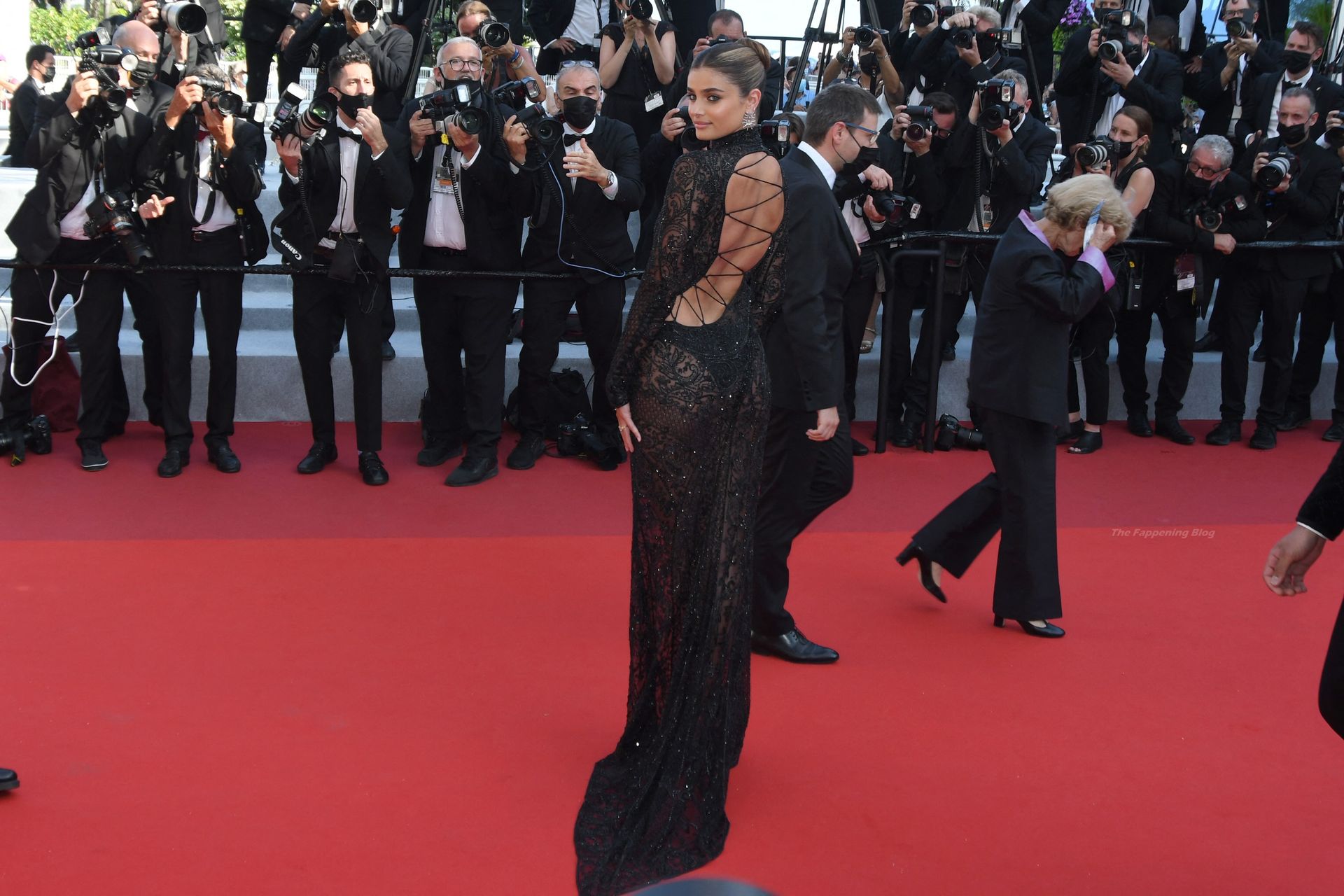 Model Taylor Hill posa con un vestido negro transparente mientras asiste a la proyección de “De Son Vivant” durante el 74º Festival de Cine de Cannes en Cannes, 07/10/2021.
