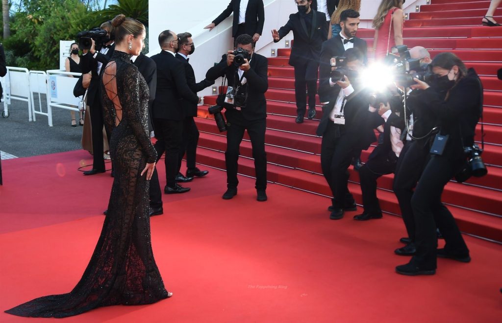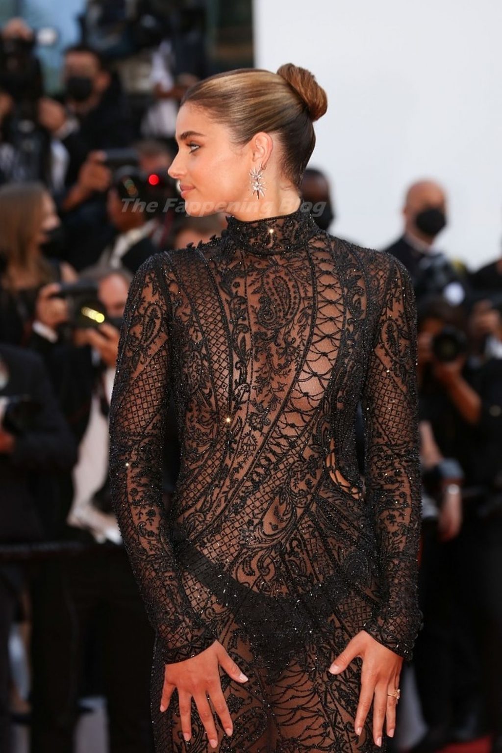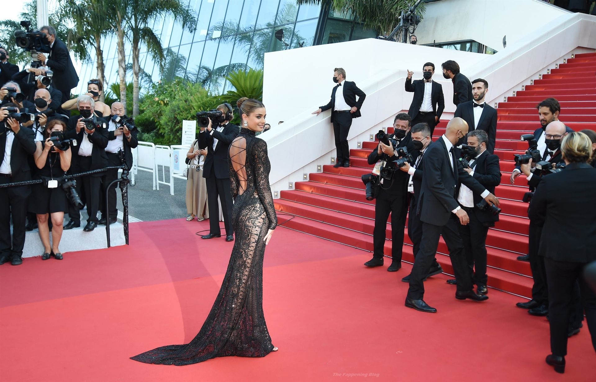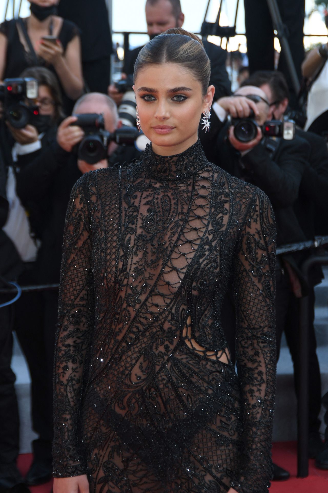 Model Taylor Hill posa con un vestido negro transparente mientras asiste a la proyección de “De Son Vivant” durante el 74º Festival de Cine de Cannes en Cannes, 07/10/2021.