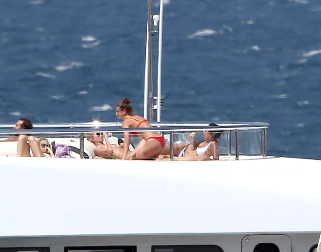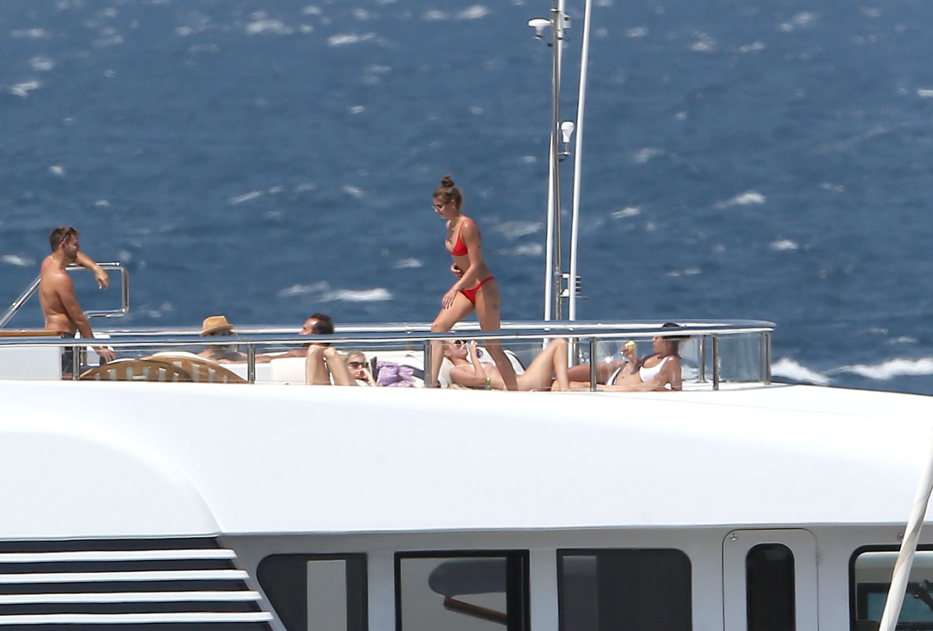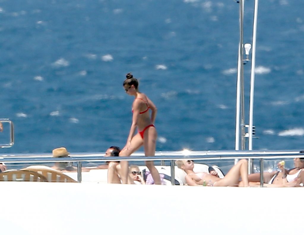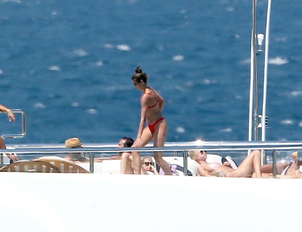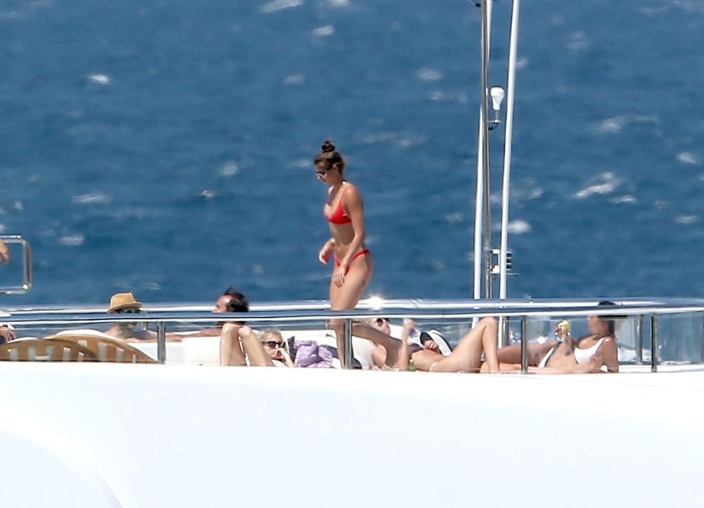 Taylor Marie Hill lleva un bikini rojo mientras disfruta con amigos en un mega yate en Saint-Tropez, 24/07/2017. Taylor Hill es una modelo de moda de Palatine (Condado de Cook, Illinois). Edad: 21 años.